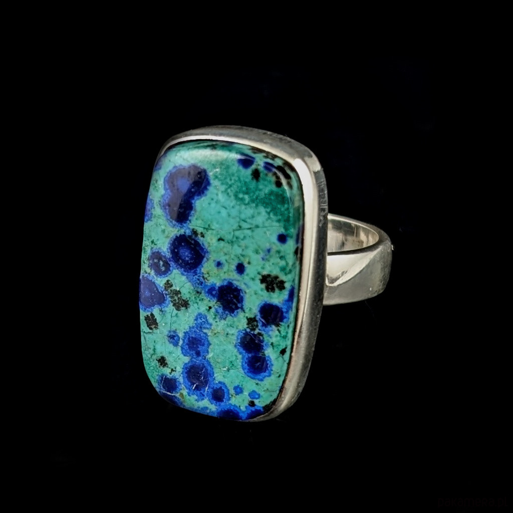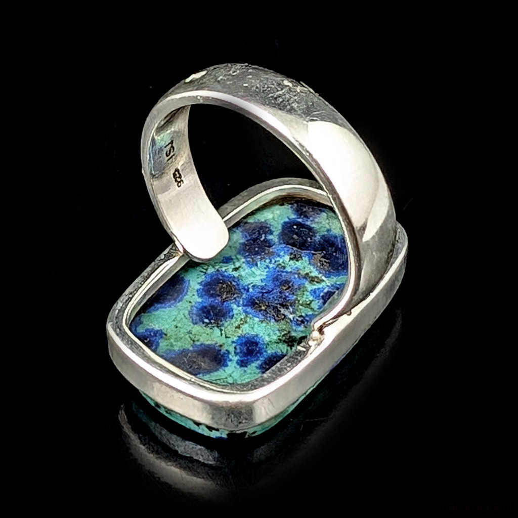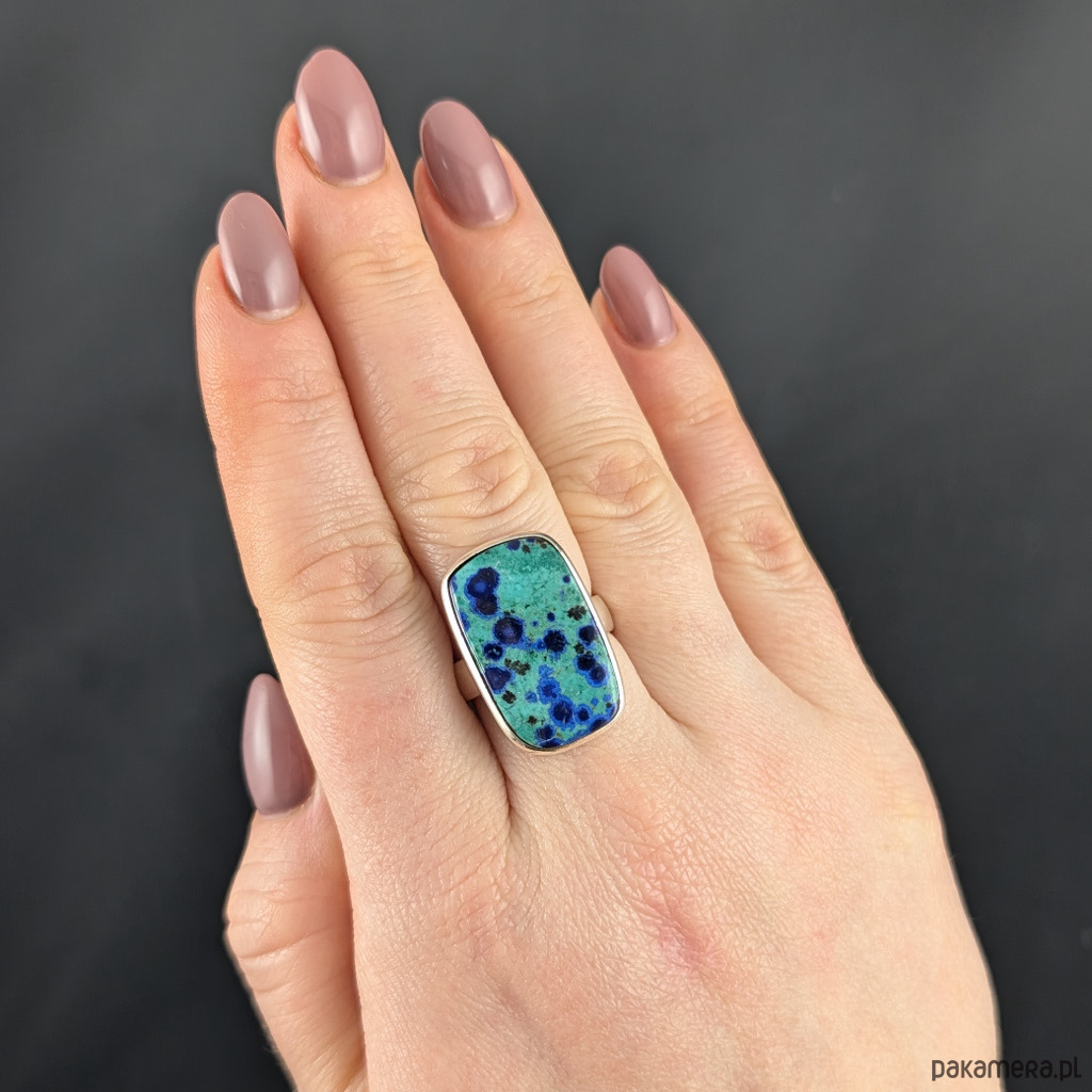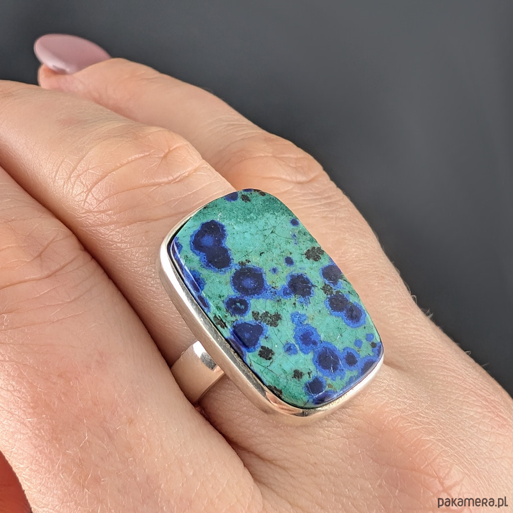 Pierścień wykonany ze srebra próby 925, który zdobi wyjątkowy okaz chryzokoli z azurytem. Kamień ma oprawę 26 x 16 mm. Pierścionek w rozmiarze jubilerskim 15, mogę powiększyć na max 20. Proszę napisać na jaki dopasować. 9,5 grama. Wykonany przez dostawcę kamieni.