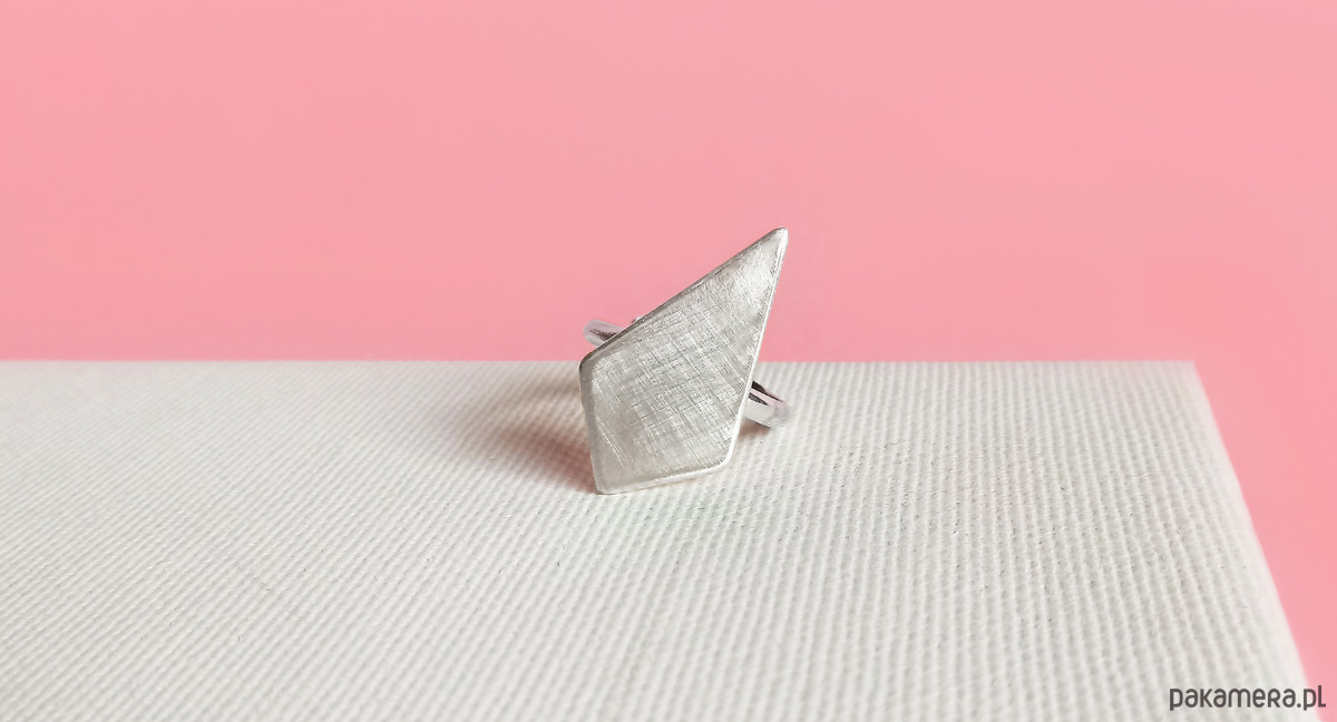 Pierścionek wykonałam własnoręcznie ze srebra próby 925. Powierzchnia srebra pokryta została fakturą, co daje niesamowity efekt, pięknie załamując światło. Pierścionek GEOMETRY jest regulowany, dzięki czemu możesz zakładać go na różne palce.