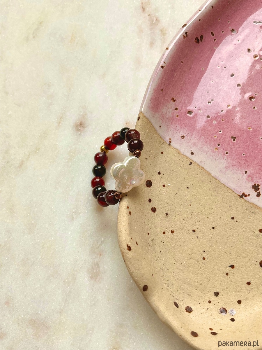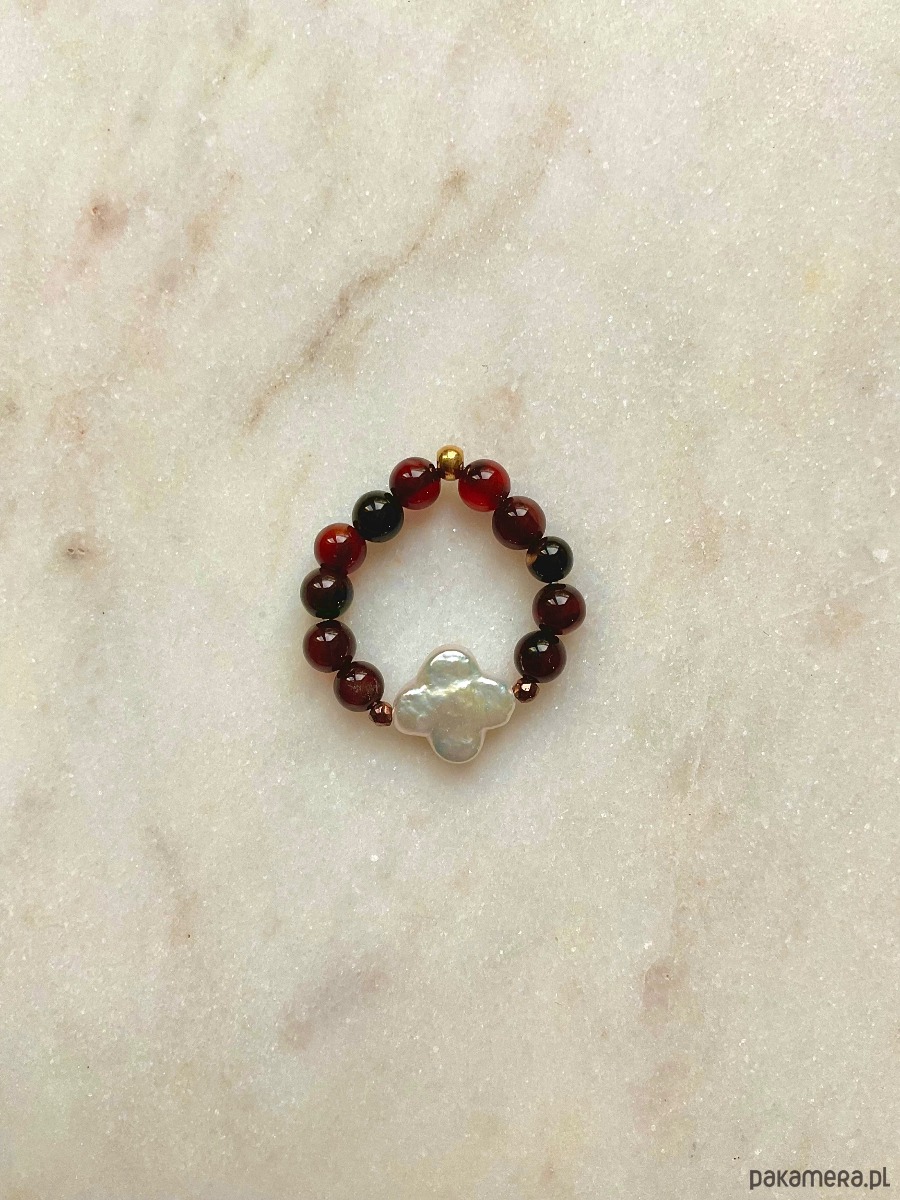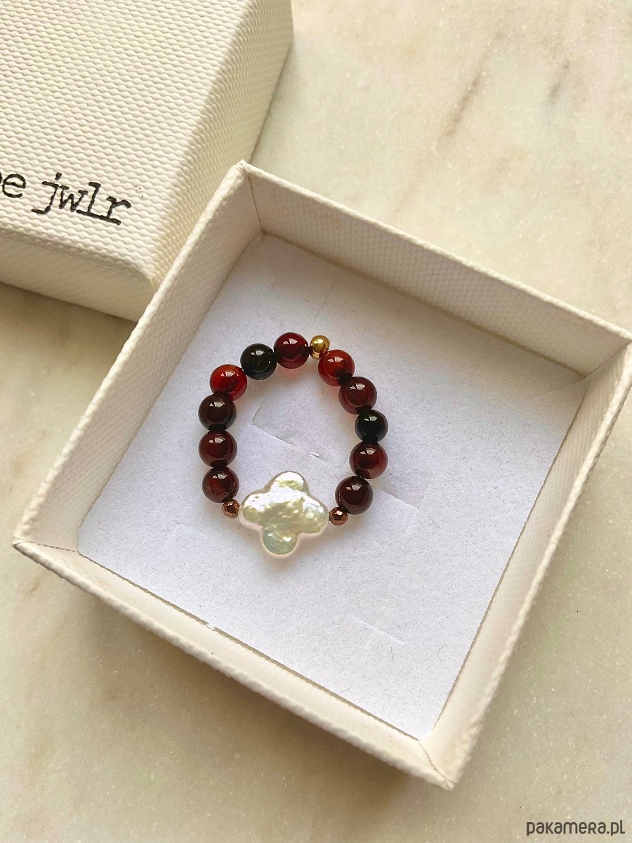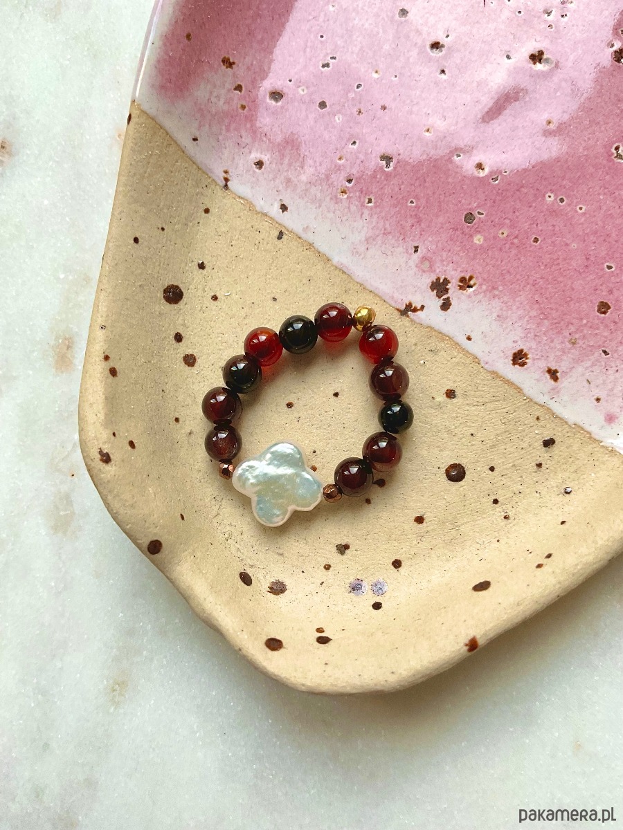 Pierścionek na gumce jubilerskiej wykonany z ognistych agatów, perły naturalnej w kształcie koniczyny oraz kuleczki ze stali chirurgicznej.
