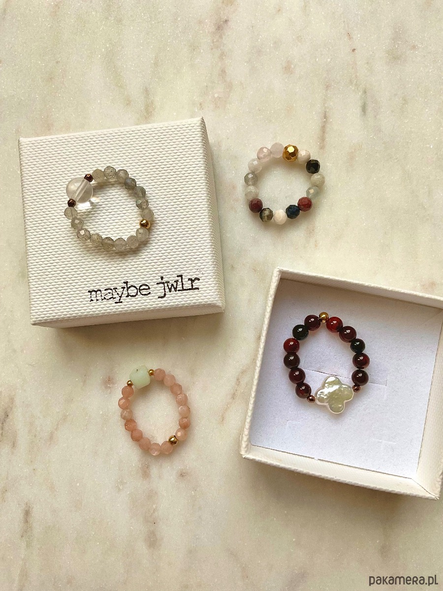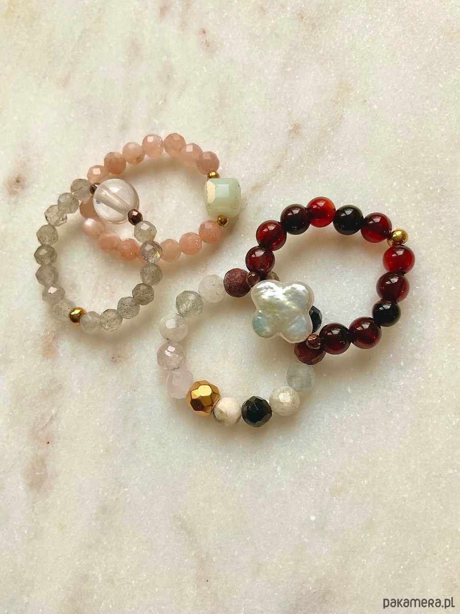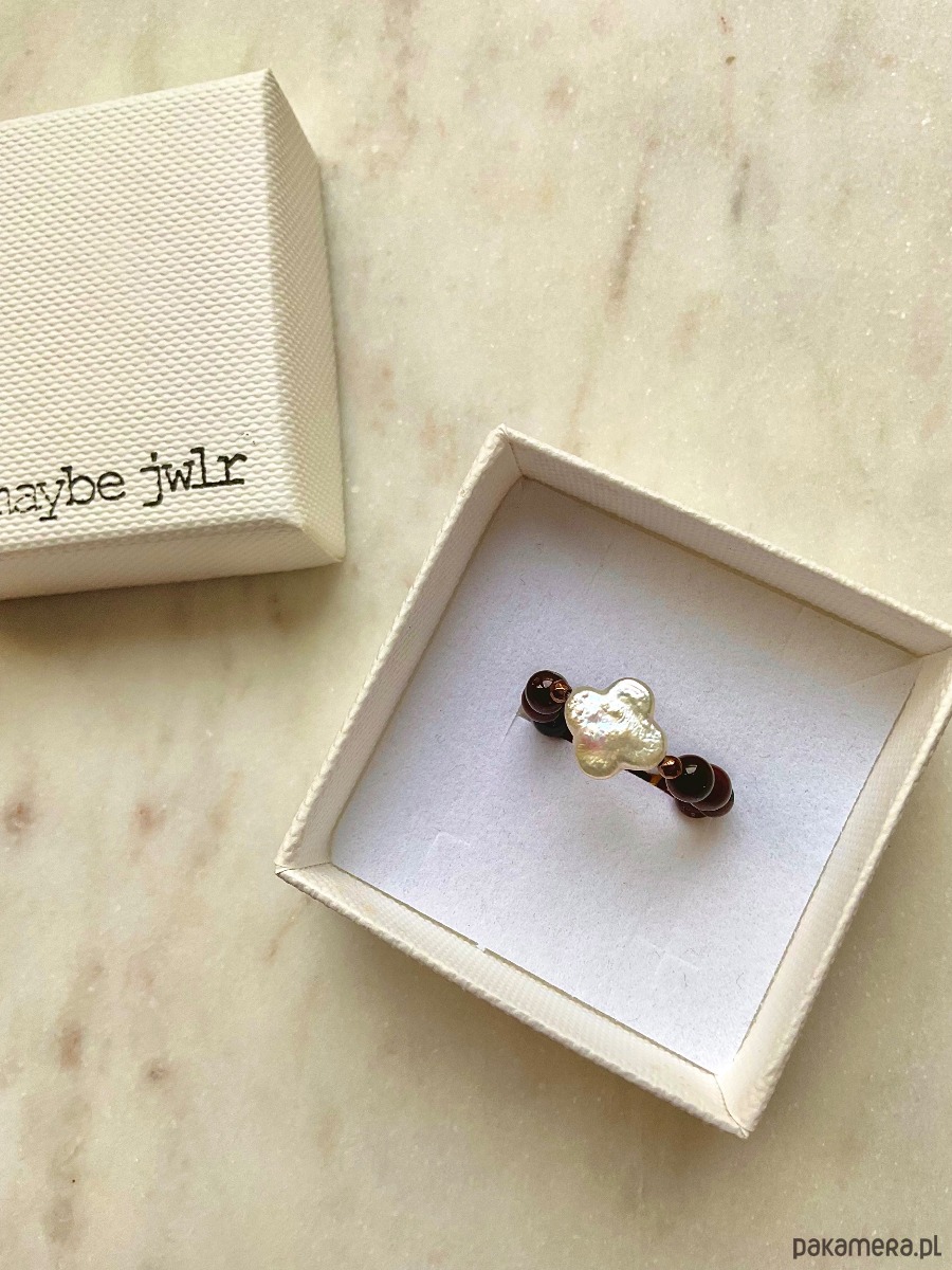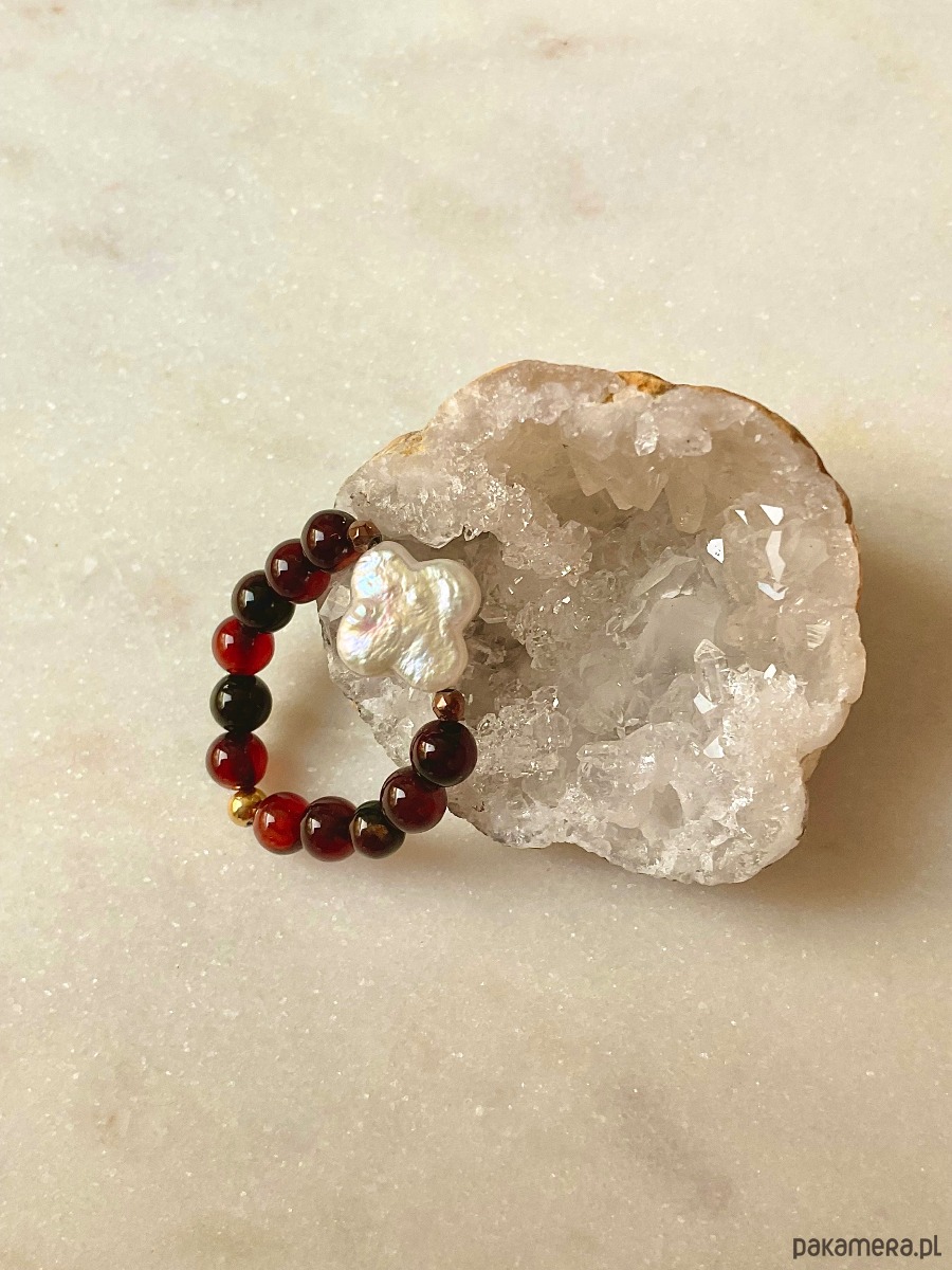 Pierścionek na gumce jubilerskiej wykonany z ognistych agatów, perły naturalnej w kształcie koniczyny oraz kuleczki ze stali chirurgicznej.