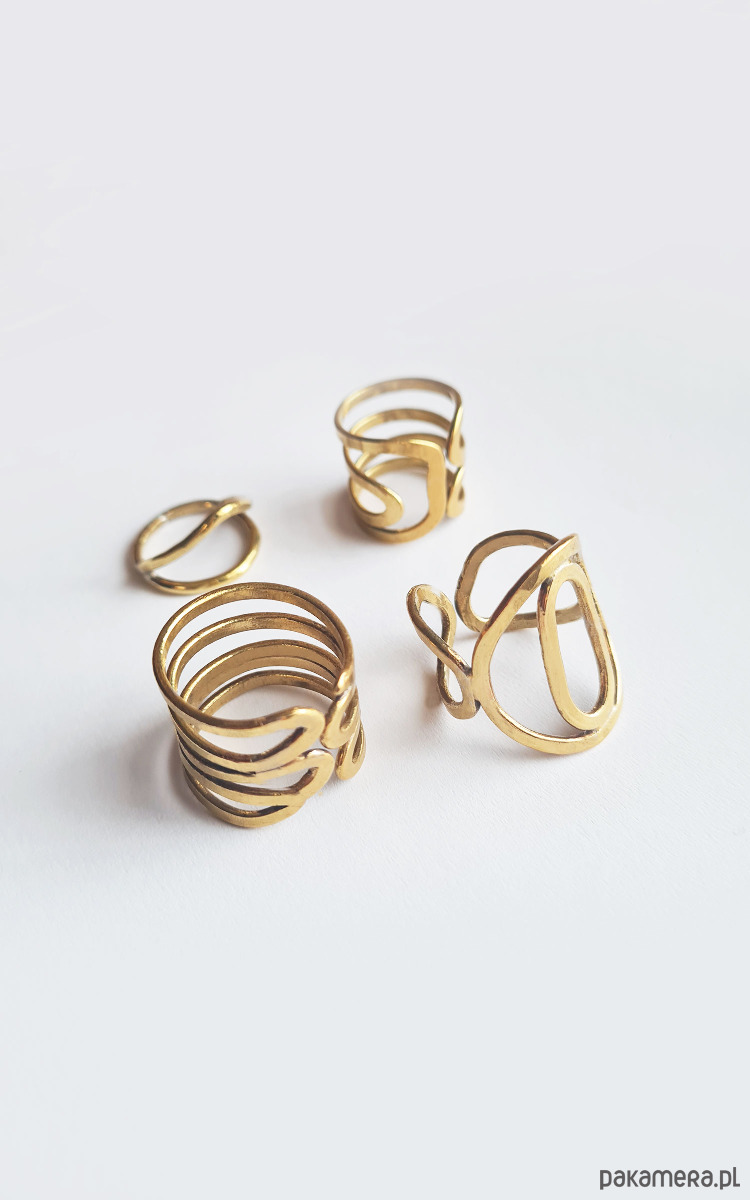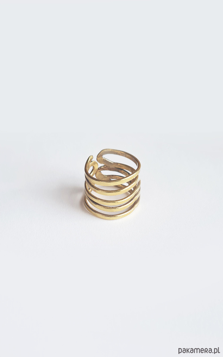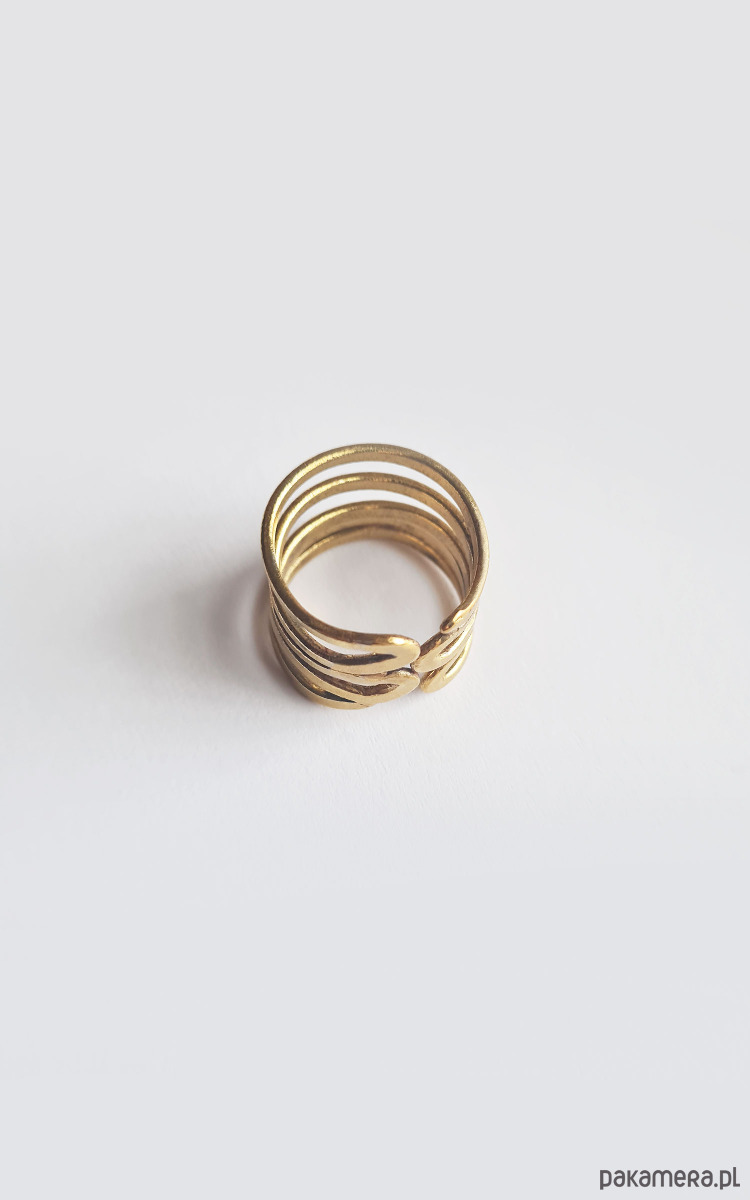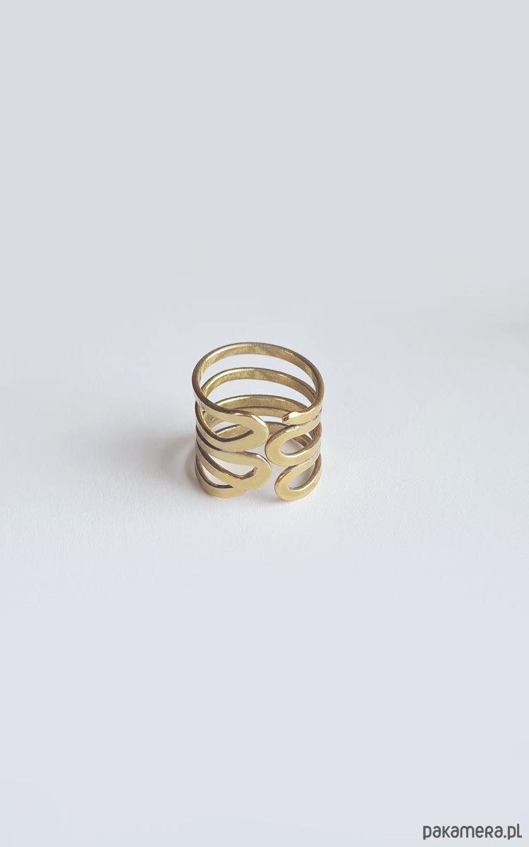 Pierścionek wykonany ręcznie z mosiądzu (złocony = pokryty cienką warstwą złota) o szerokości ok. 22 mm.