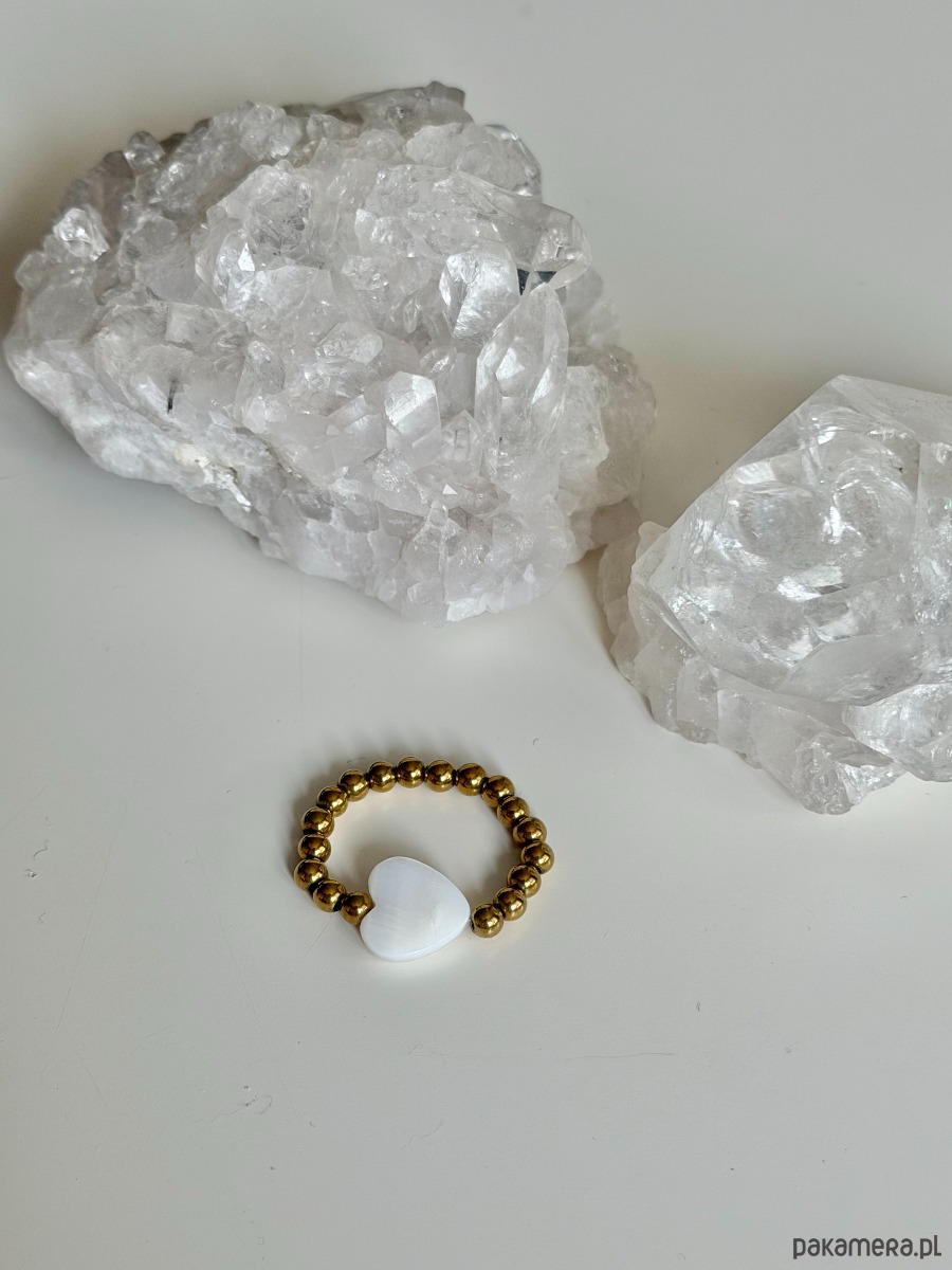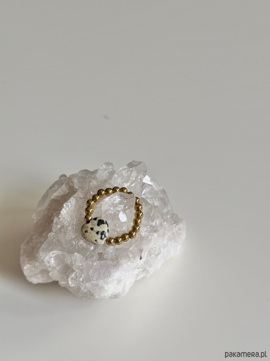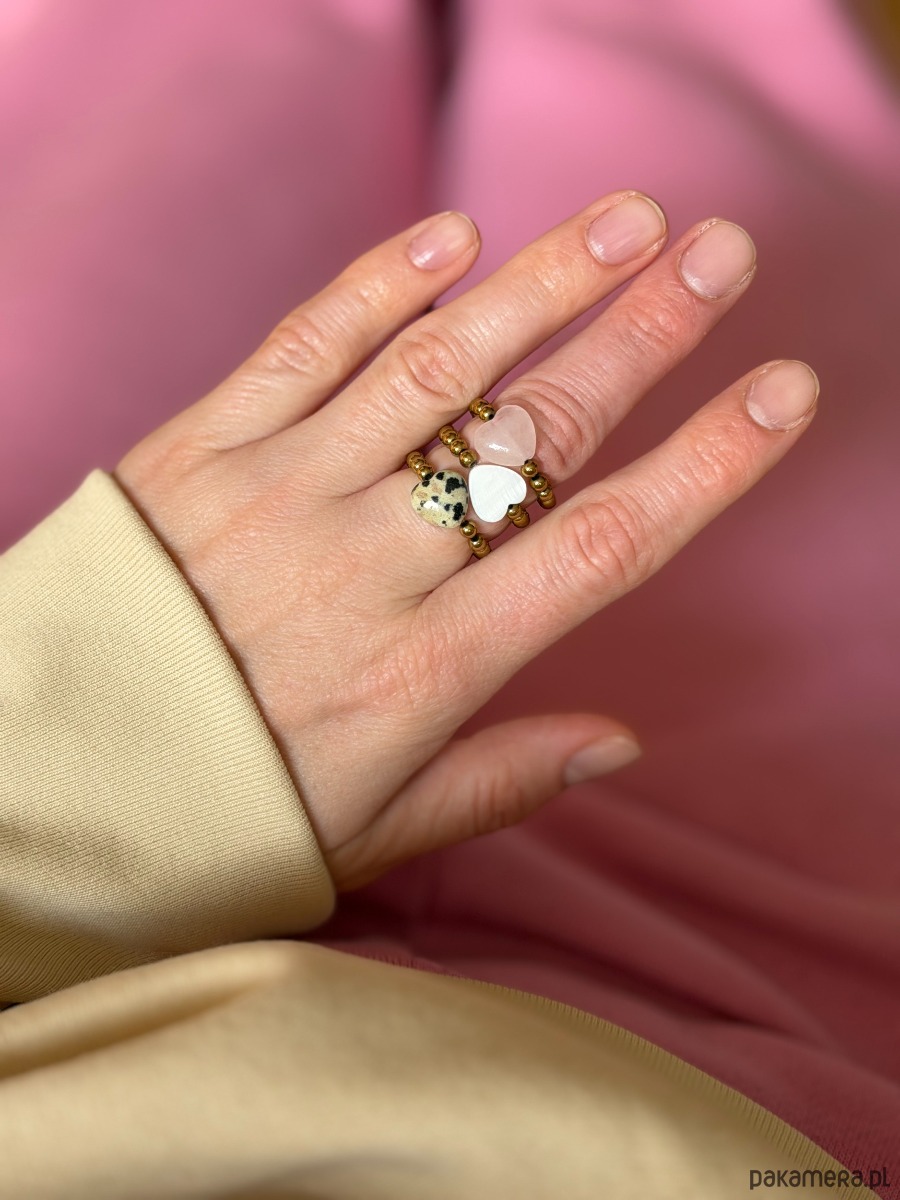 Elastyczny pierścionek GOLD z sercem z kamienia do wyboru: różowe - z kwarcu różowego, nakrapiane - z jaspisu dalmatyńskiego lub białe - z masy perłowej.