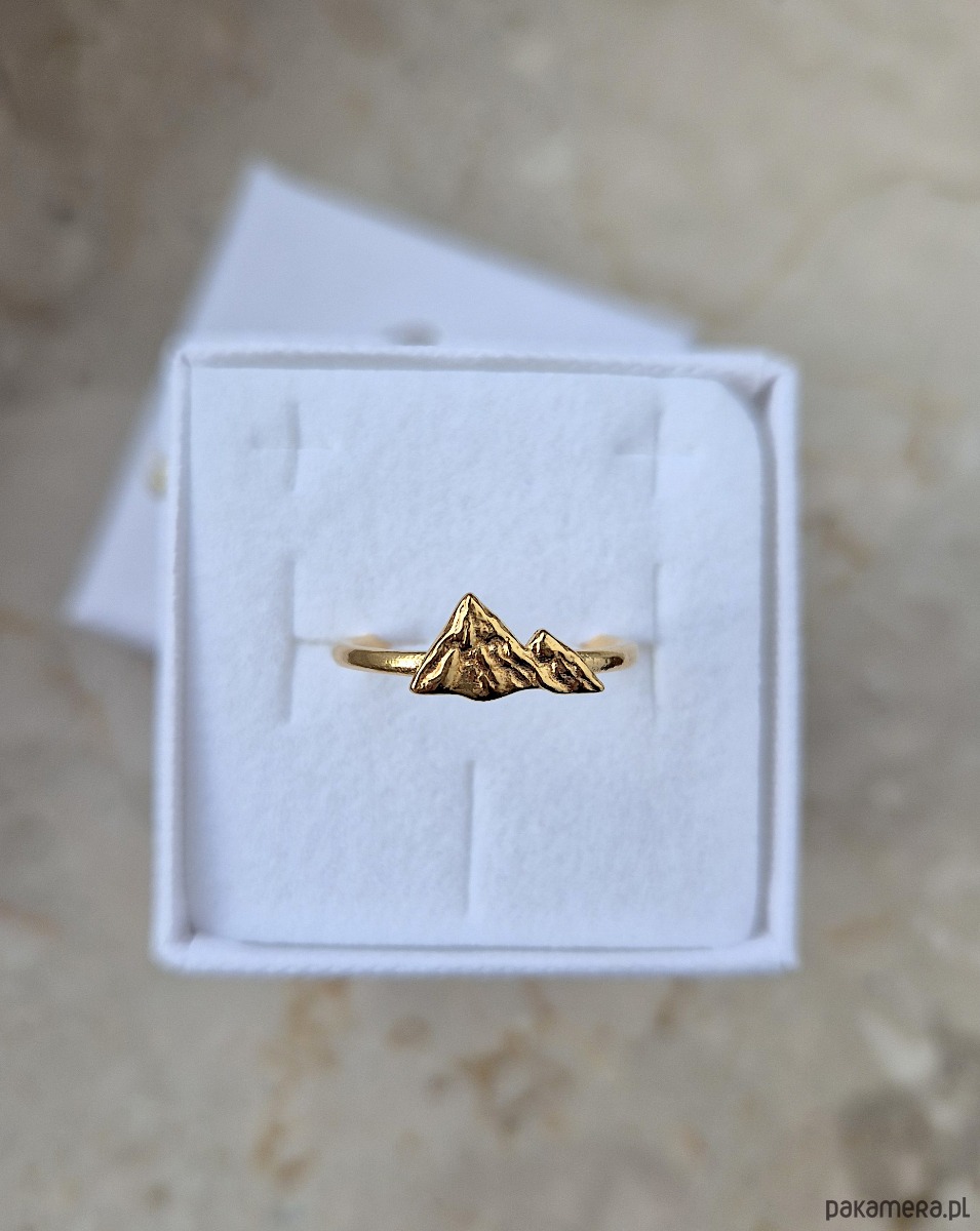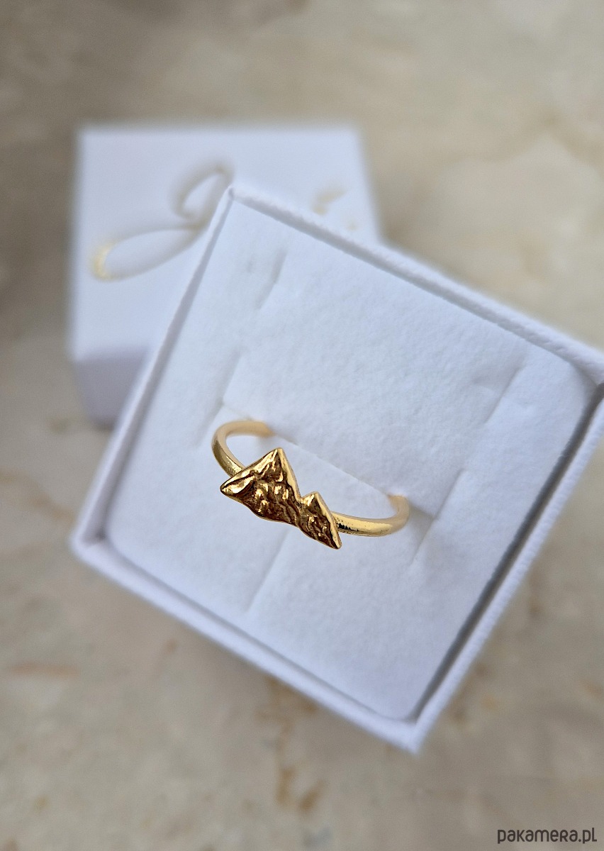 Delikatny pierścionek ze wzorem gór, wykonany ze srebra próby 925, srebra pokrytego 24 karatowym złotem lub 18K różowym złotem. Pokryty warstwą ochronną anti- tarnish zabezpieczającą przed ścieraniem.