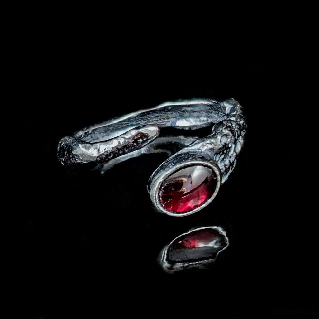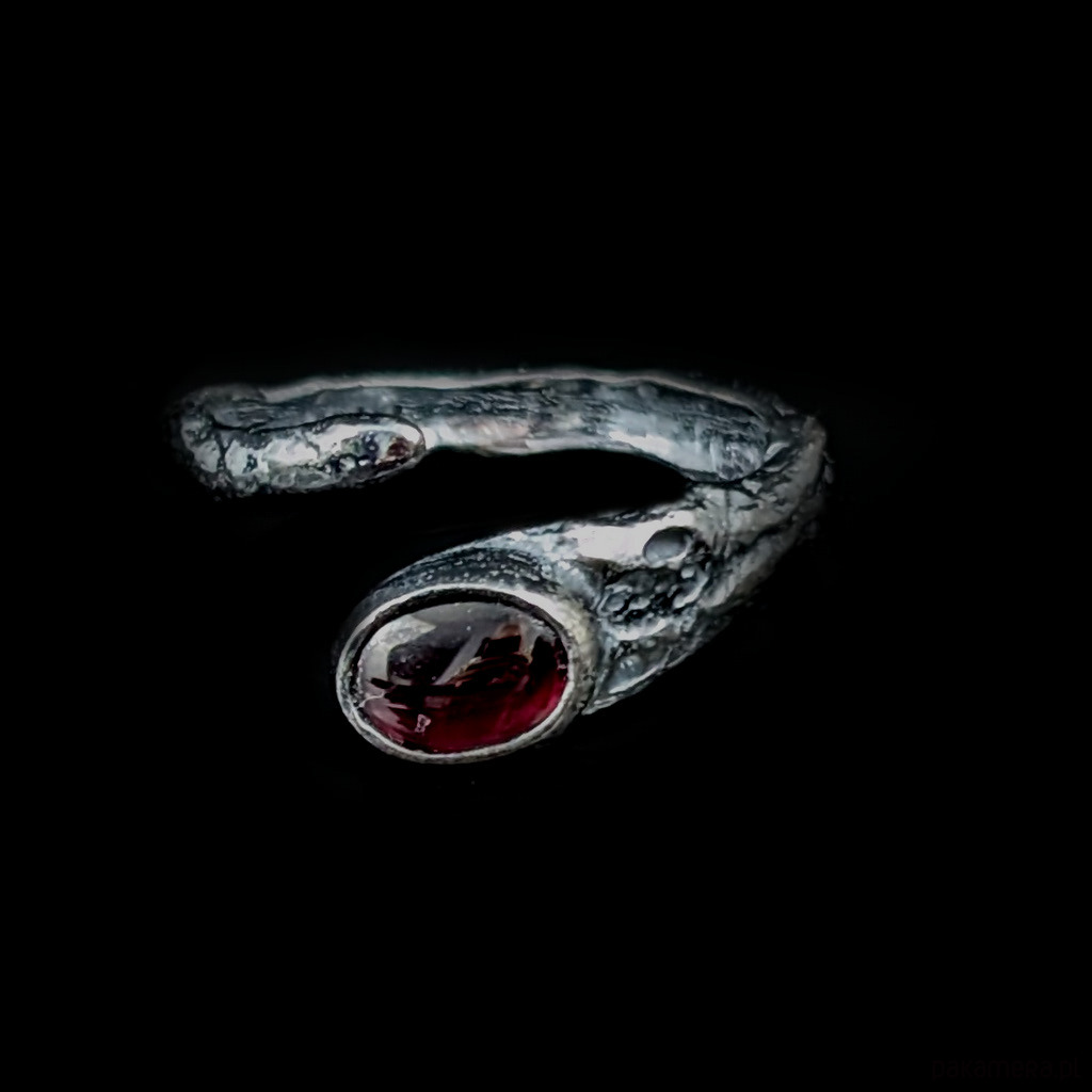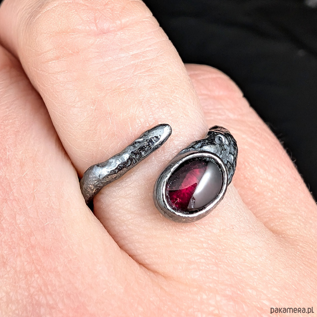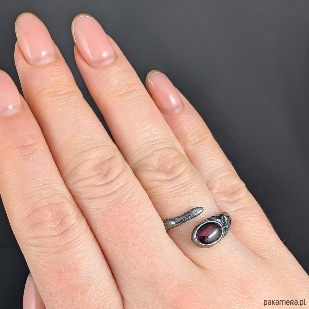 Pierścień z oprawionym w oksydowane srebro pr. 925 granatem o pięknej barwie. Wymiary całej oprawy kamienia 9 x 7 mm. szerokość maksymalna obrączki 6 mm, min.4 mm. Rozmiar jubilerski pierścionka regulowany, mogę dopasowac na dowolny rozmiar w zakresie 9-24. Proszę napisać. Waga 4 gramy. Pierścień zostanie zapakowany w ozdobne pudełeczko.