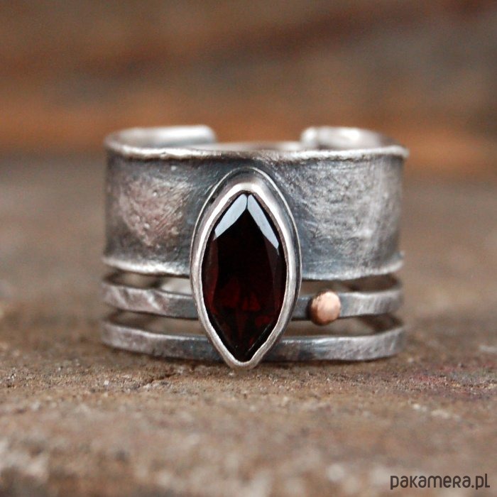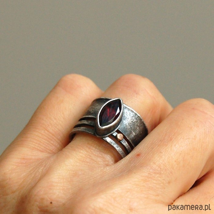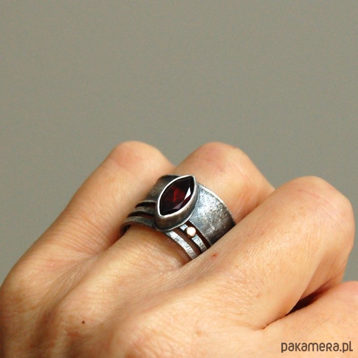 Pierścionek ze srebra, złota próby 585 i granatu. Srebro oksydowane. Wielkość kamienia 0,5 - 1,1 cm, szerokość obrączki ok. 1,4 cm, rozmiar regulowany. Przy zamówieniu proszę o podanie rozmiaru, pierścionek zostanie ustawiony.