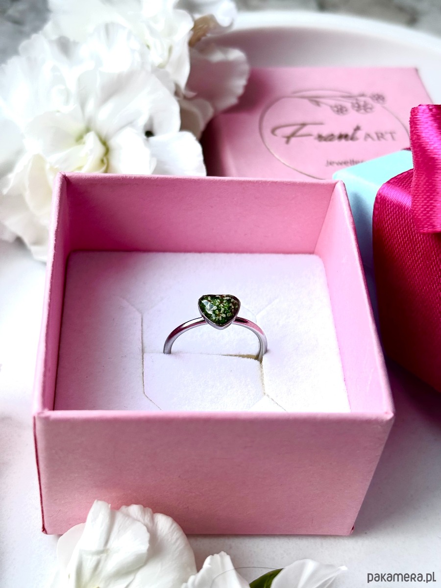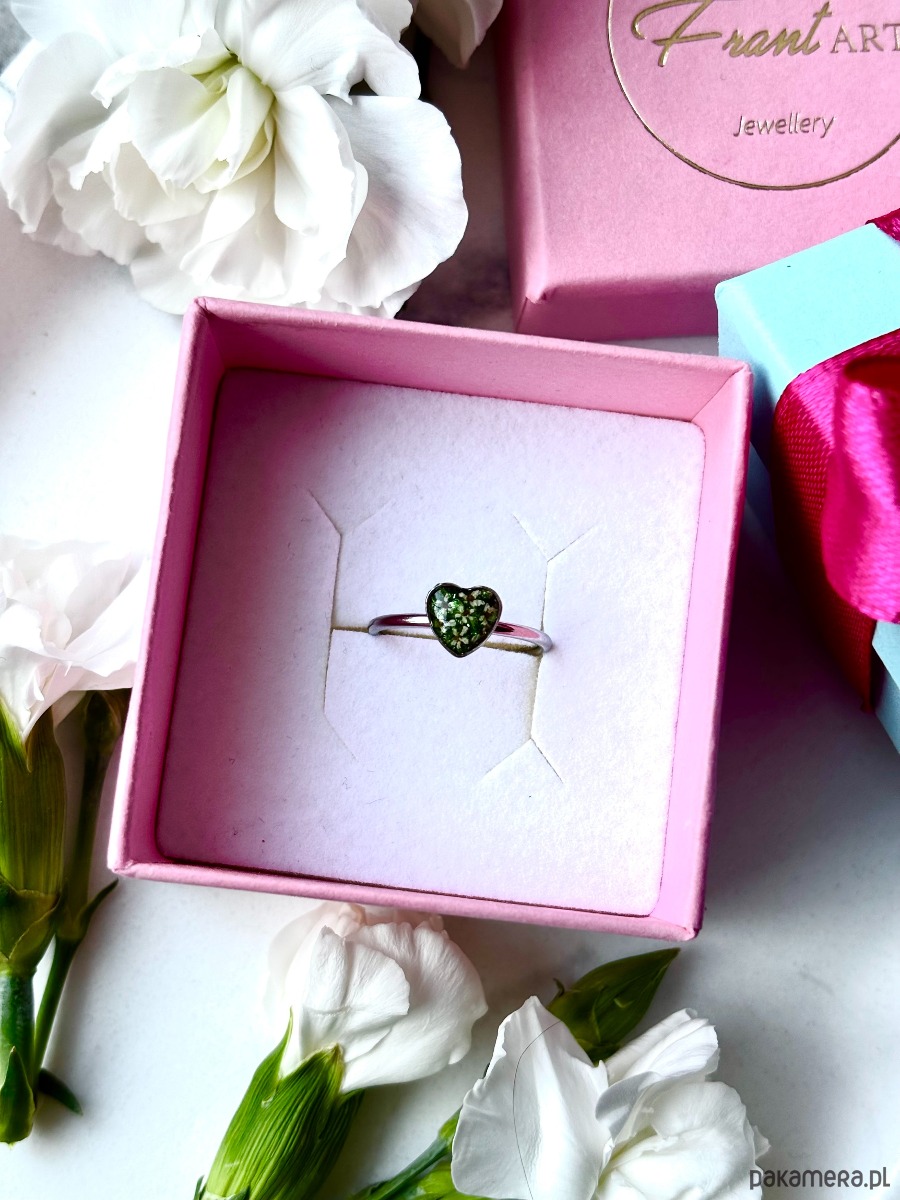 Ręcznie wykonany pierścionek z oczkiem w kształcie serca. Biżuteria wykonana jest z wyselekcjonowanych kawałków szkła w kolorze zieleni oraz suszonych kwiatów dzikiej marchwi. Pierścionek pięknie prezentuje się na dłoni, dzięki możliwości regulacji można dopasować go do większości placów.