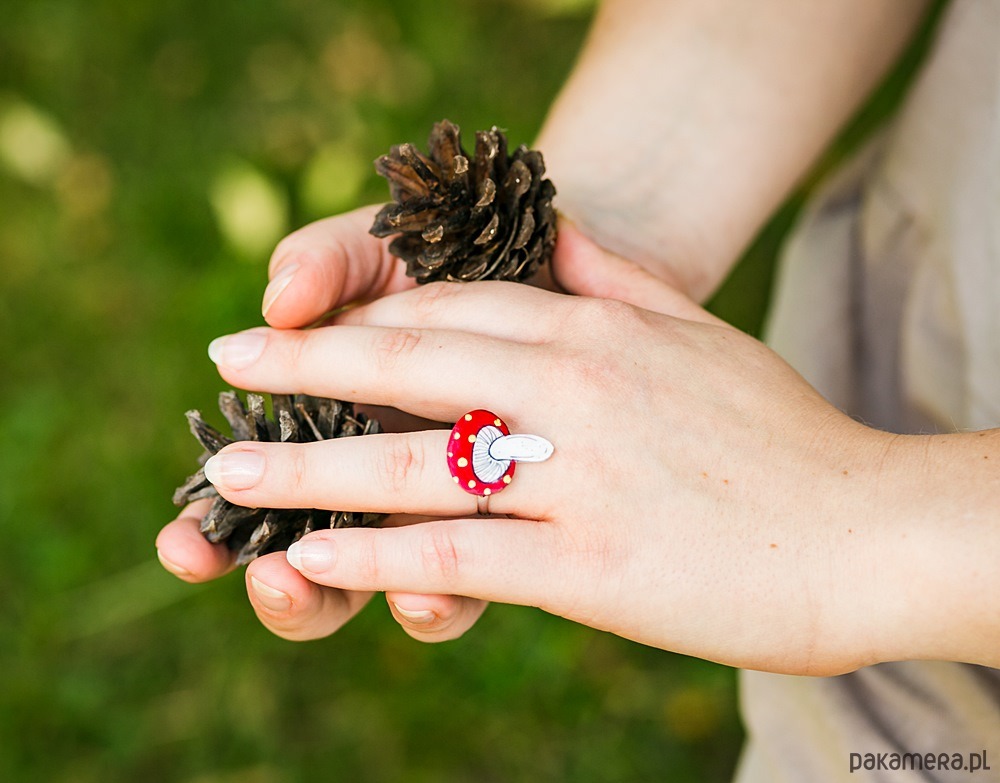 Słodki pierścionek muchomorek, ręcznie rysowany na folii termokurczliwej i zabezpieczony lakierem ekologicznym.