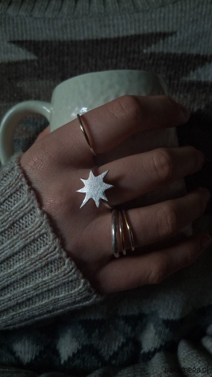 Subtelny, a jednocześnie przyciągający uwagę pierścionek, w którym surowa forma spotyka się z minimalistyczną elegancją. Centralnym elementem jest nieregularna, organiczna gwiazda osadzona na delikatnej obrączce o grubości 1,5 mm i kwadratowym przekroju. Geometryczna linia obrączki pięknie kontrastuje z nieokiełznaną strukturą gwiazdy, tworząc harmonijną, nowoczesną kompozycję.