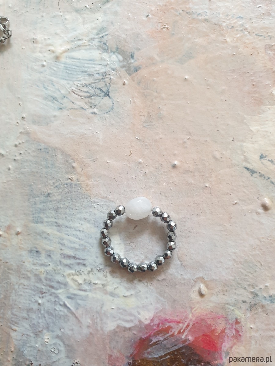 Pierścionek w pastelowych kolorach z kolekcji SPRING, tworzony z kamieni naturalnych, nawleczonych na elastyczną gumkę jubilerską (najmocniejsza na rynku gumka Ninja cord, wolna od latexu) W tym pierścionku kamienie: kamień księżycowy i hematyt. Pojedyncze egzemplarze ze względu na unikatowość kamieni, możemy powtórzyć wzór podobny w zależności od tego jakie kamienie będziemy mieć na stanie.