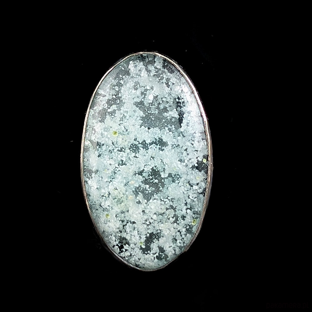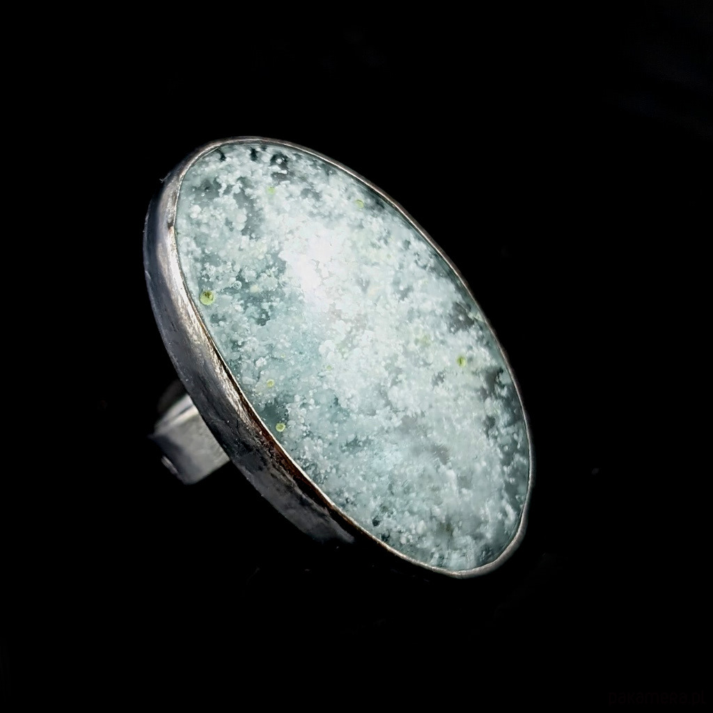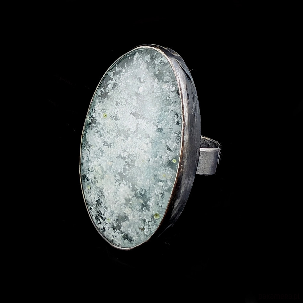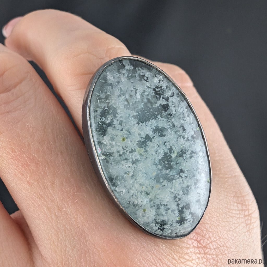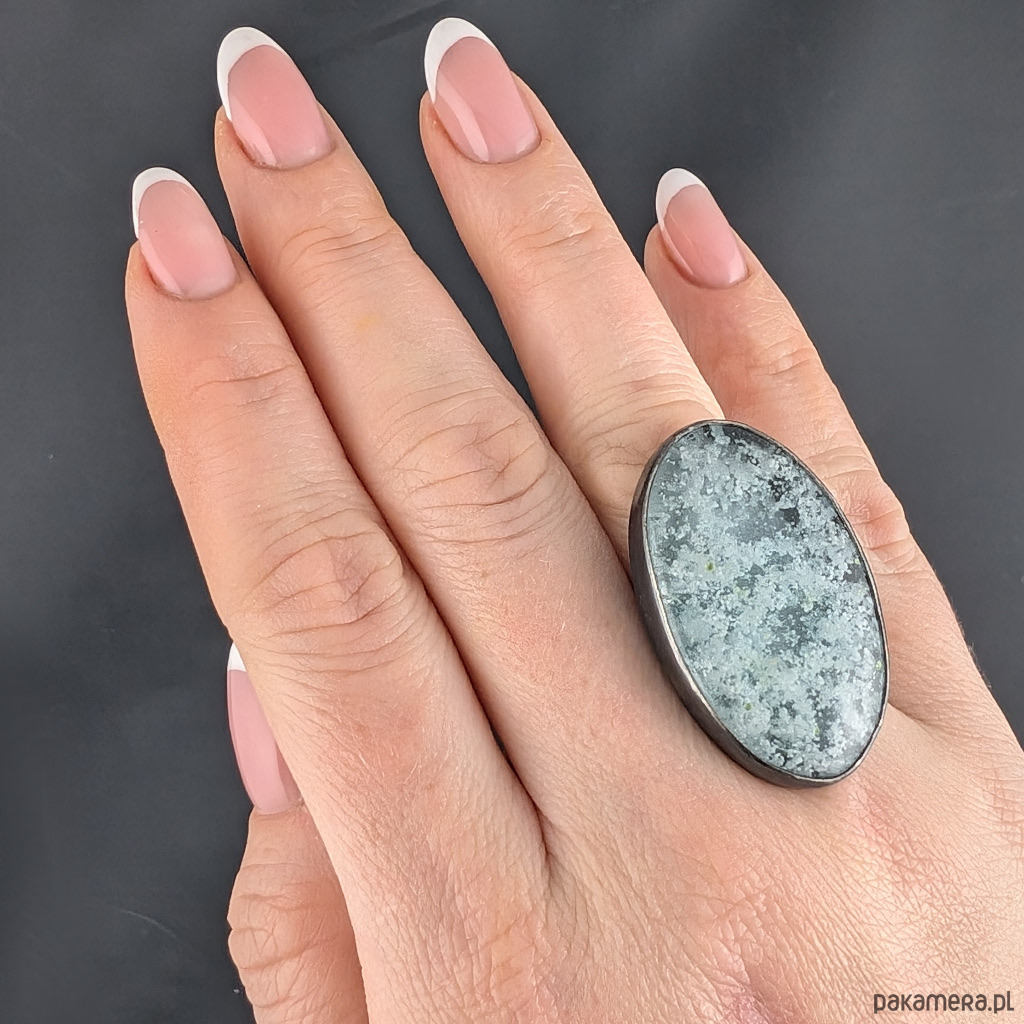 Pierścień wykonany z oksydowanego srebra próby 925. Ozdobą pierścionka jest niezwykły hemimorfit bubbleone , bardzo ceniony minerał hemimorfit, który ma ciekawą strukturę przypominającą bąbelki, Wymiary pierścienia 37 x 23 mm. Waga 16 g, rozmiar jubilerski mogę dopasować w zakresie 14-17 Pierścień wyslany zostanie w ozdobnym pudełeczku.