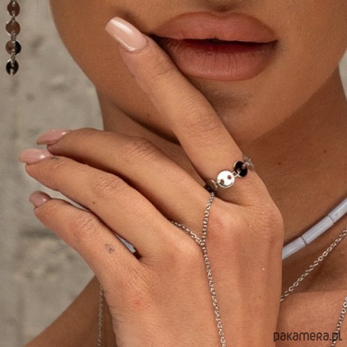 Pierścionek wykonany w całości ze stali szlachetnej w kolorze srebrnym. Ozdobne srebrne blaszki połyskują w świetle i oplatają palec. Pierścionek zapinany jest na federing oraz posiada dodatkową przedłużkę (+1 cm), dzięki czemu można regulować rozmiar pierścionka. Łańcuszkowy pierścionek prezentuje się delikatnie i subtelnie. Minimalistycznie podkreśla dłoń.