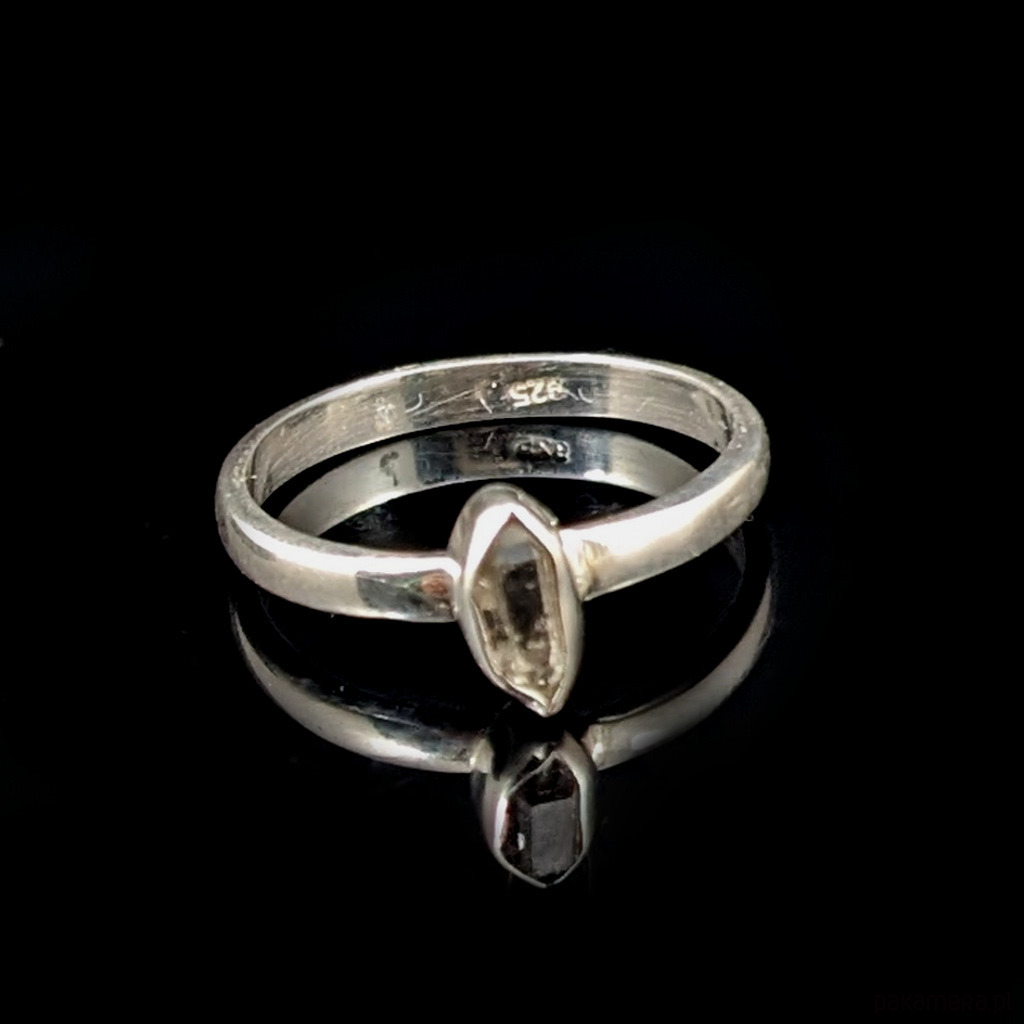 Subtelny pierścionek z oprawionym w srebro próby 925 kryształem kwarcu zwanym herkimerem- niezwykle czysta odmiana nazywana też diamentem z Herkimer (od nazwy miejsca występowania, okręg Herkimer w stanie Nowy Jork). Wymiary oprawy kamienia 4 x 7 mm, rozmiar jubilerski regulowany w wąskim zakresie 18-20. Proszę napisać na jaki opasować. Waga 2,5 g. Kobiecy i awangardowy. Wykonany przez dostawcę kamieni. Pierścionek zostanie zapakowany w eleganckie pudełeczko