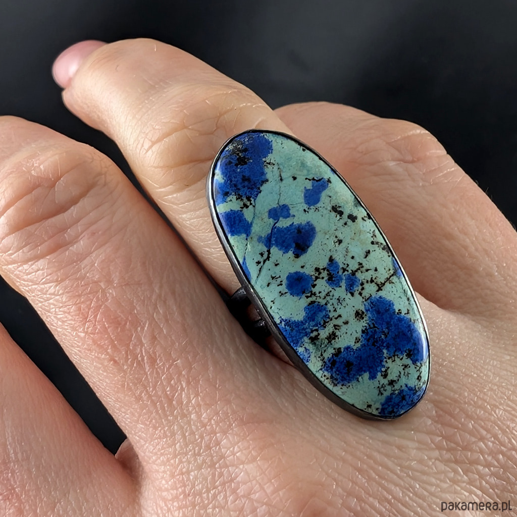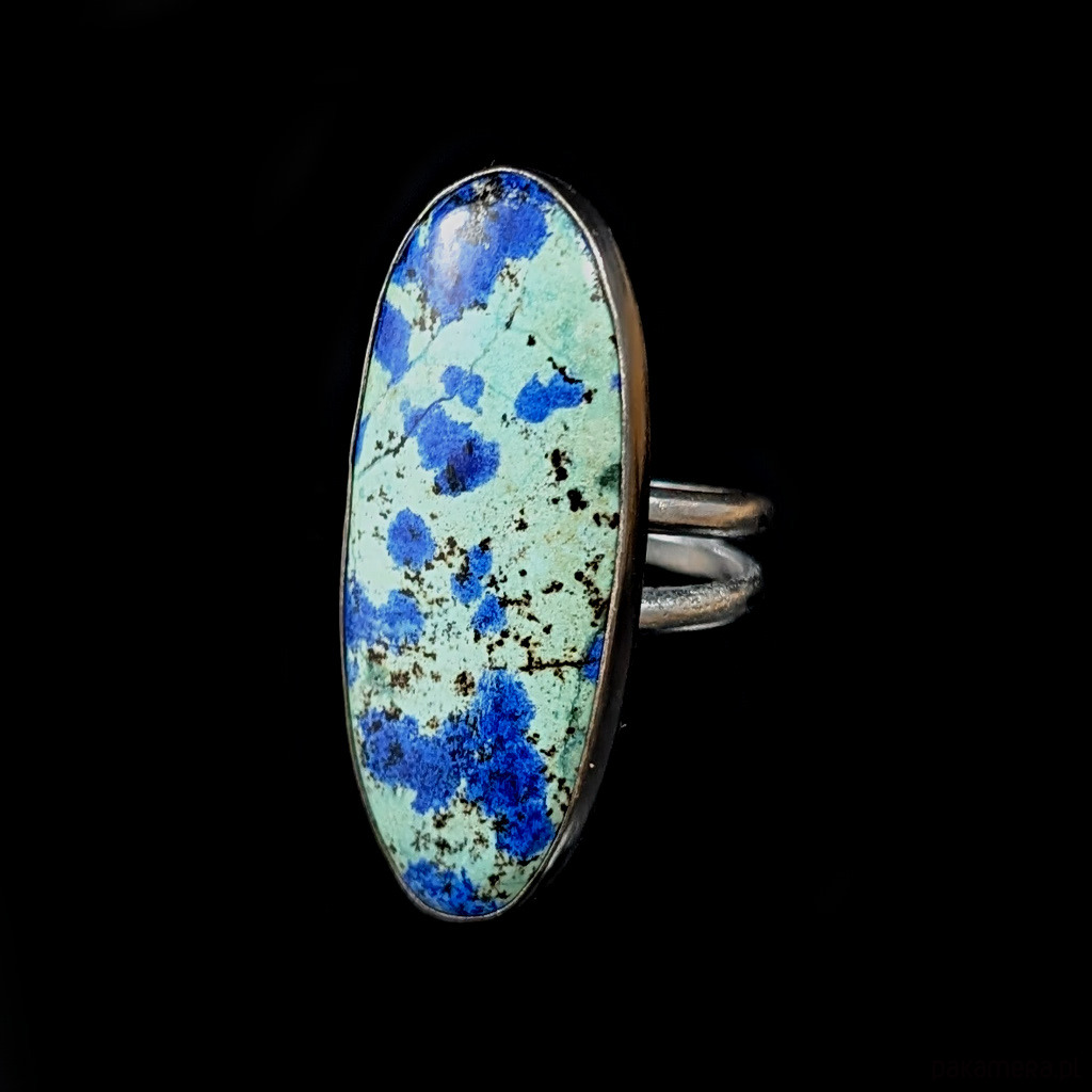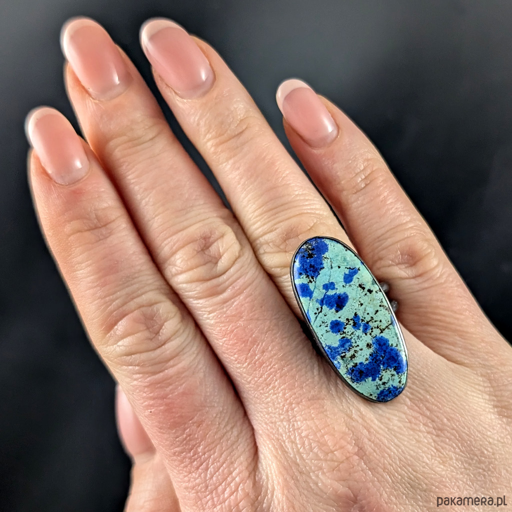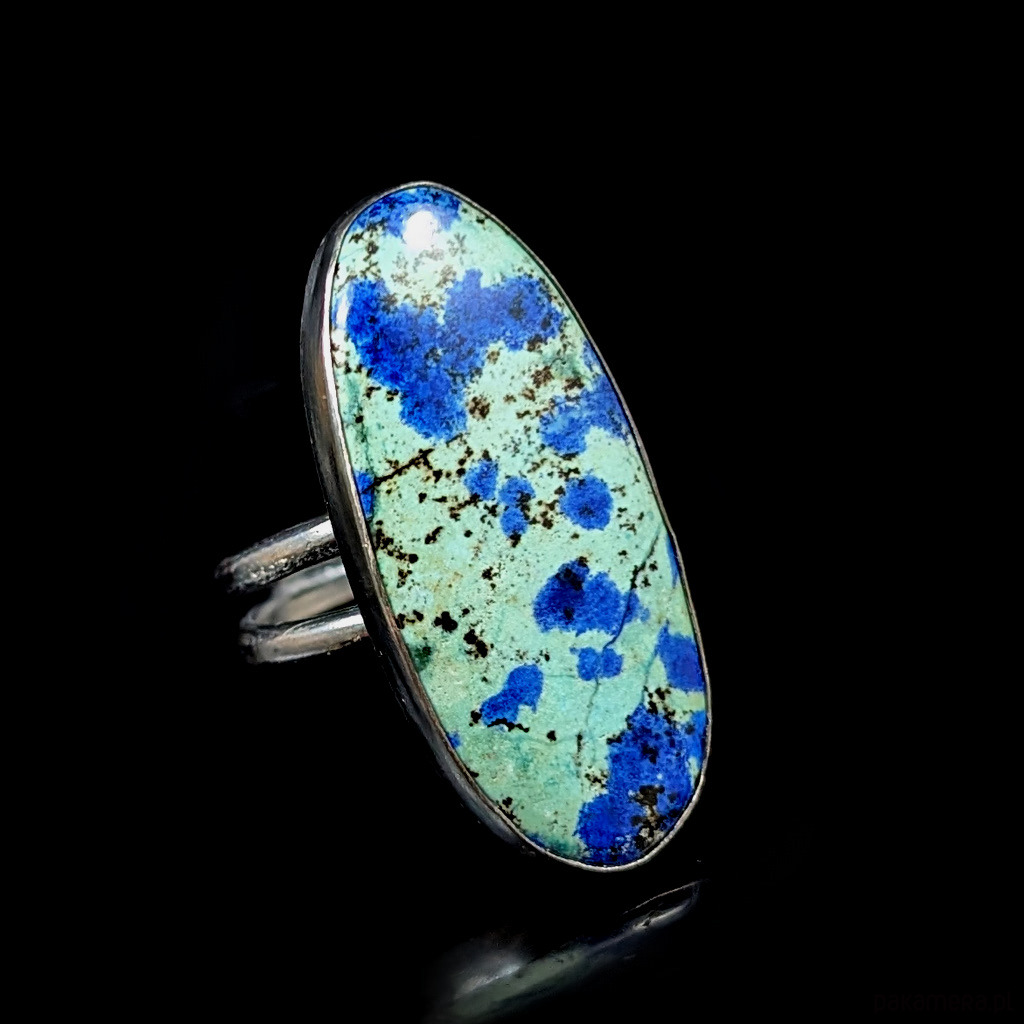 Pierścień wykonany ze srebra próby 925, który zdobi wyjątkowy okaz chryzokoli z azurytem.