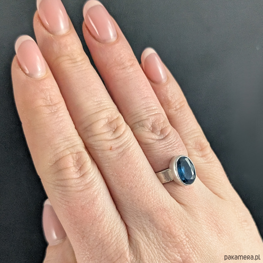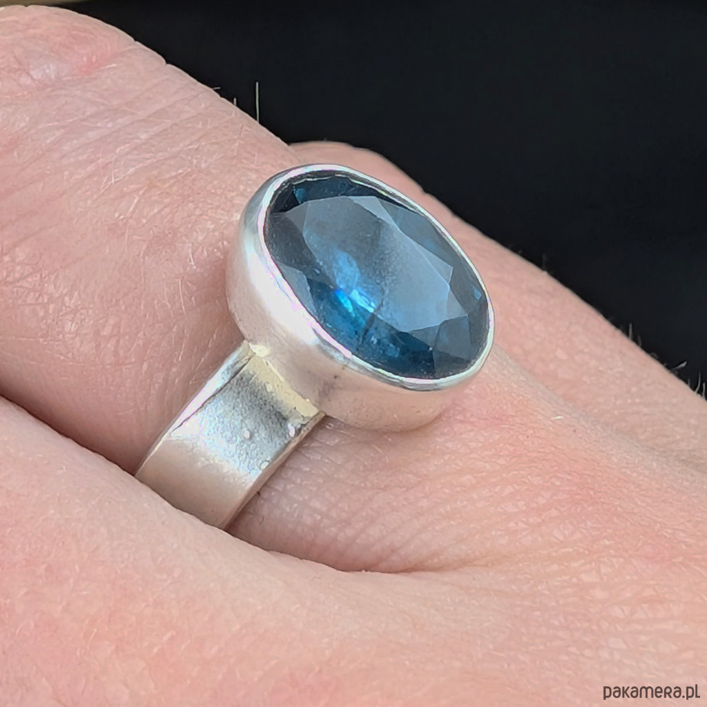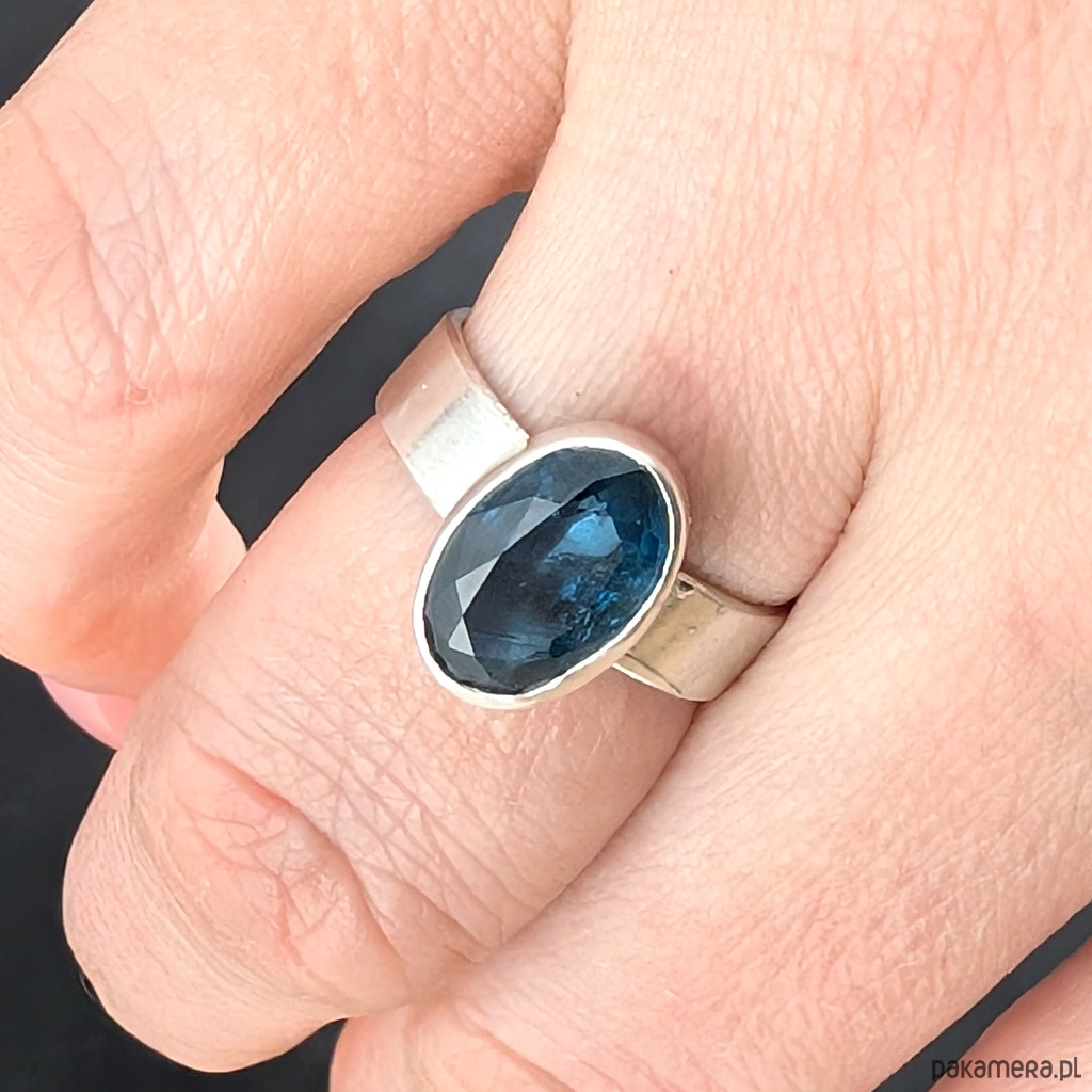 Pierścionek wykonany ze srebra próby 925 zdobi wyjątkowy, fasetowany kyanit o pięknej barwie. Kamień ma oprawę 12 x 8 mm. Pierścionek w rozmiarze jubilerskim 12, mogę powiększyć do max 13, dopasuję po zakupie. waga 4,6 grama. Obrączka ma 5 mm szerokości. Zostanie wysłany w ozdobnym pudełeczku.