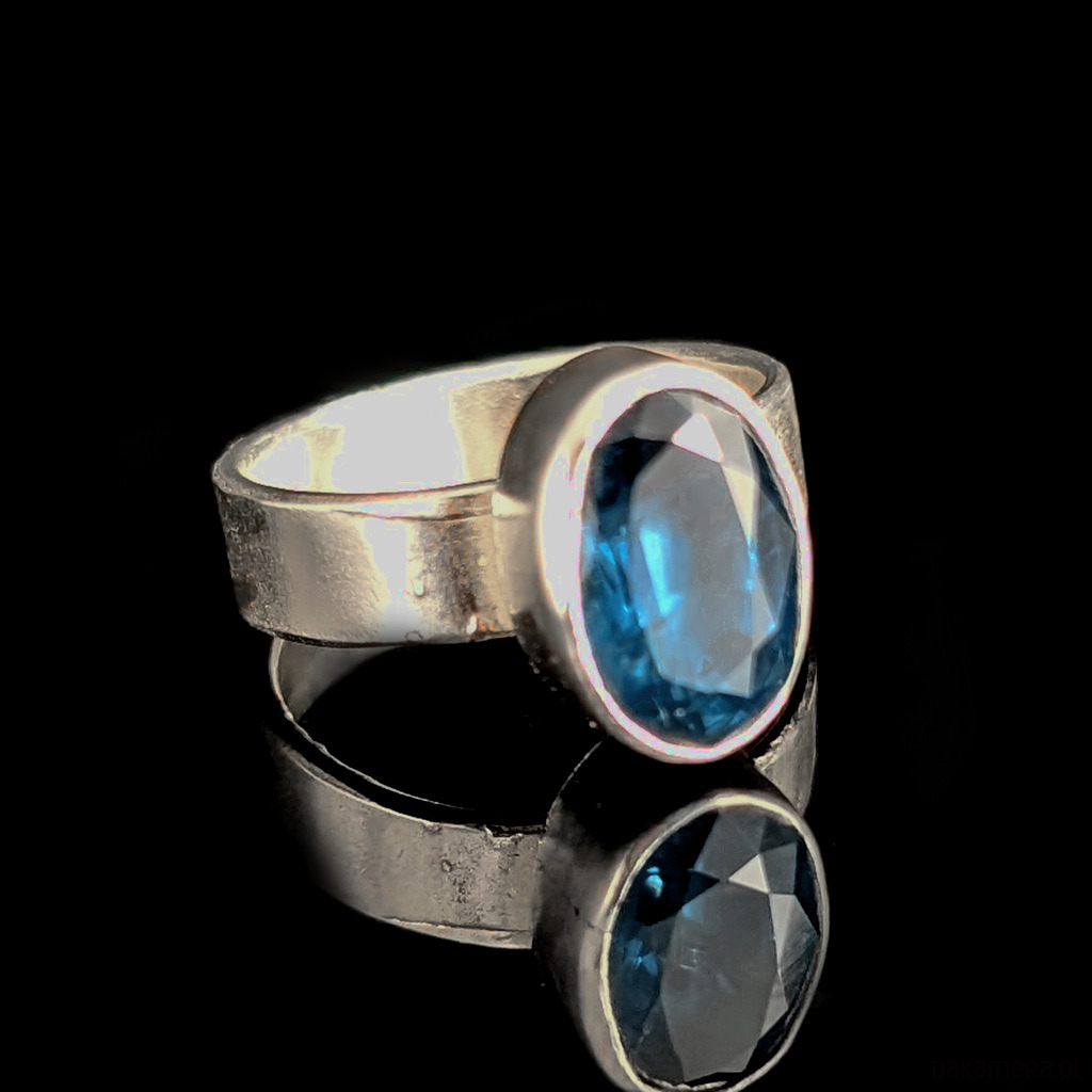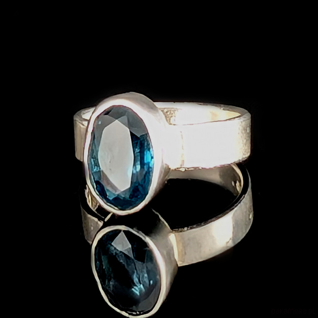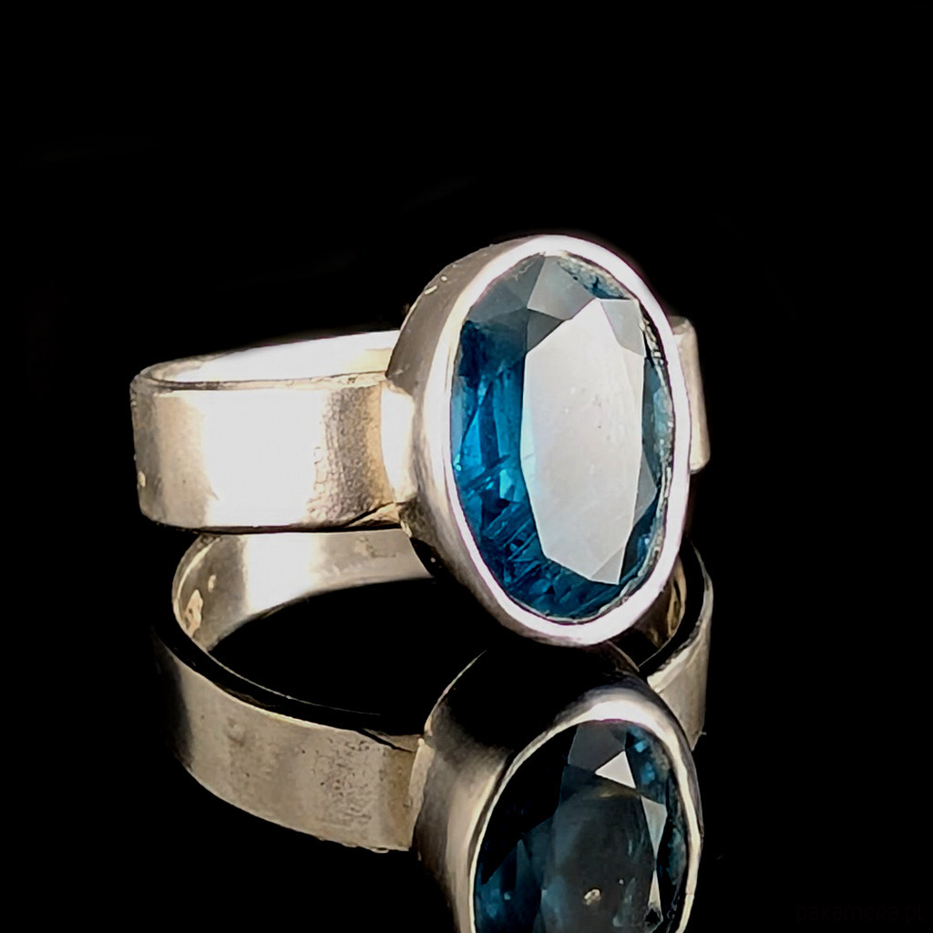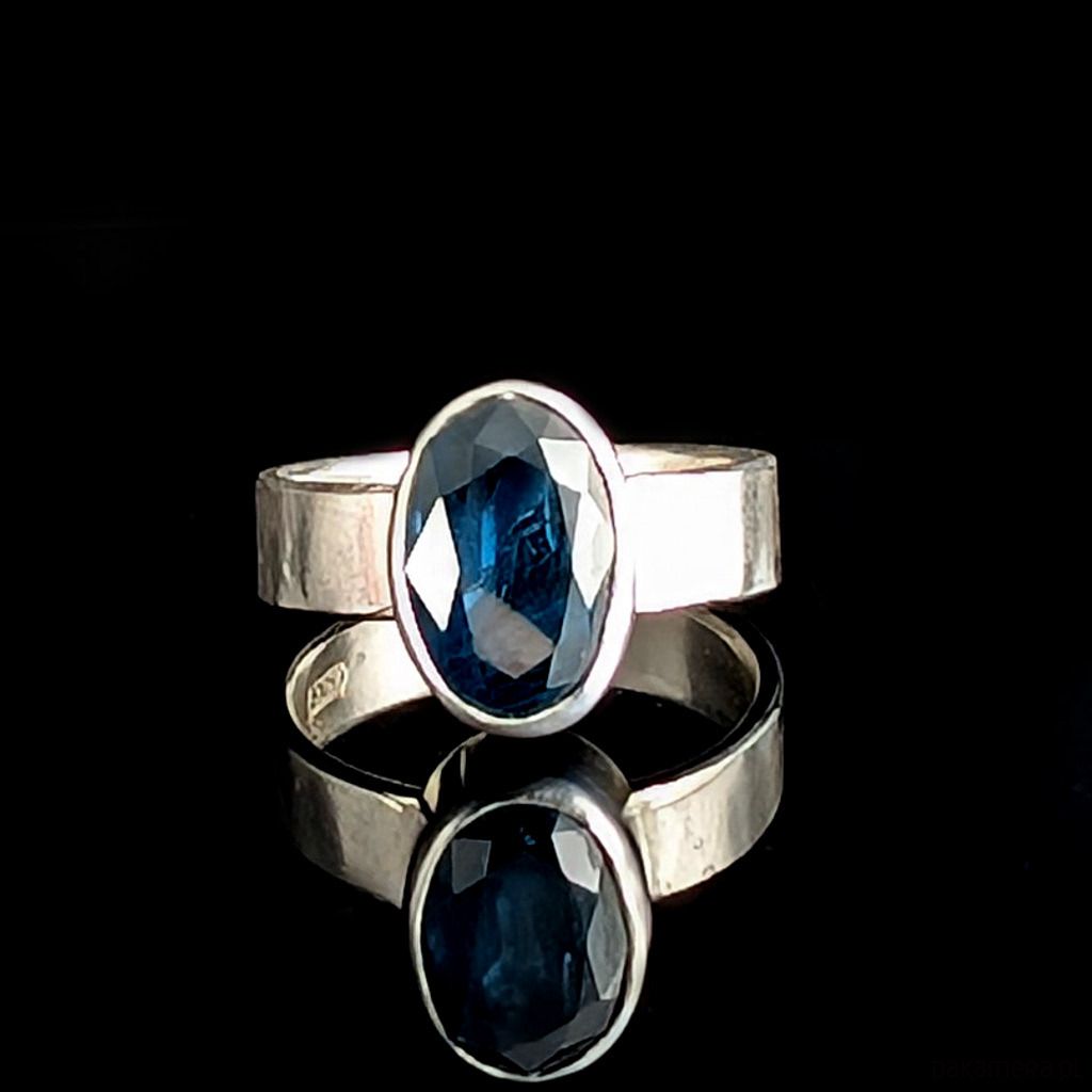 Pierścionek wykonany ze srebra próby 925 zdobi wyjątkowy, fasetowany kyanit o pięknej barwie. Kamień ma oprawę 12 x 8 mm. Pierścionek w rozmiarze jubilerskim 12, mogę powiększyć do max 13, dopasuję po zakupie. waga 4,6 grama. Obrączka ma 5 mm szerokości. Zostanie wysłany w ozdobnym pudełeczku.