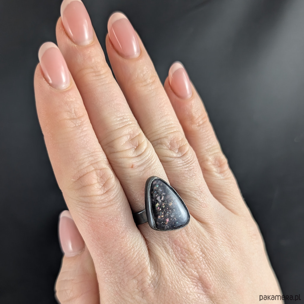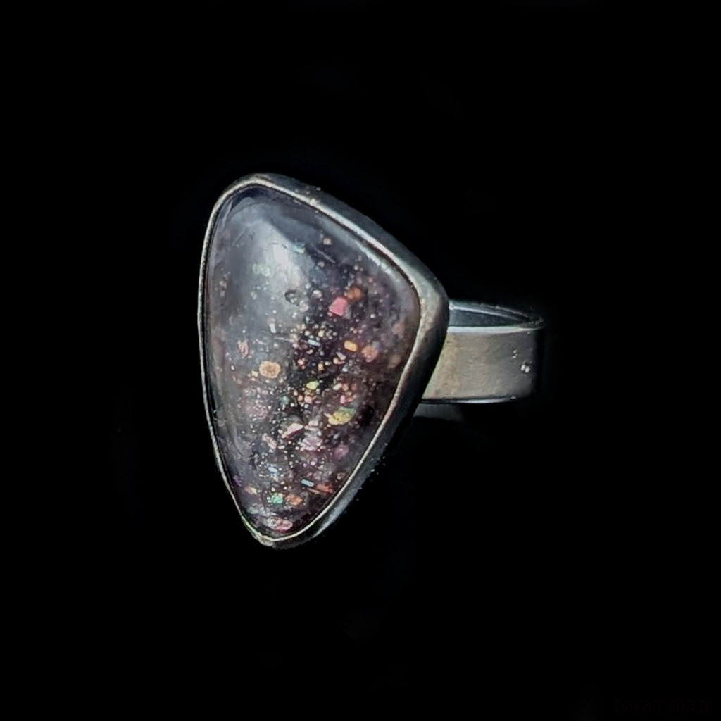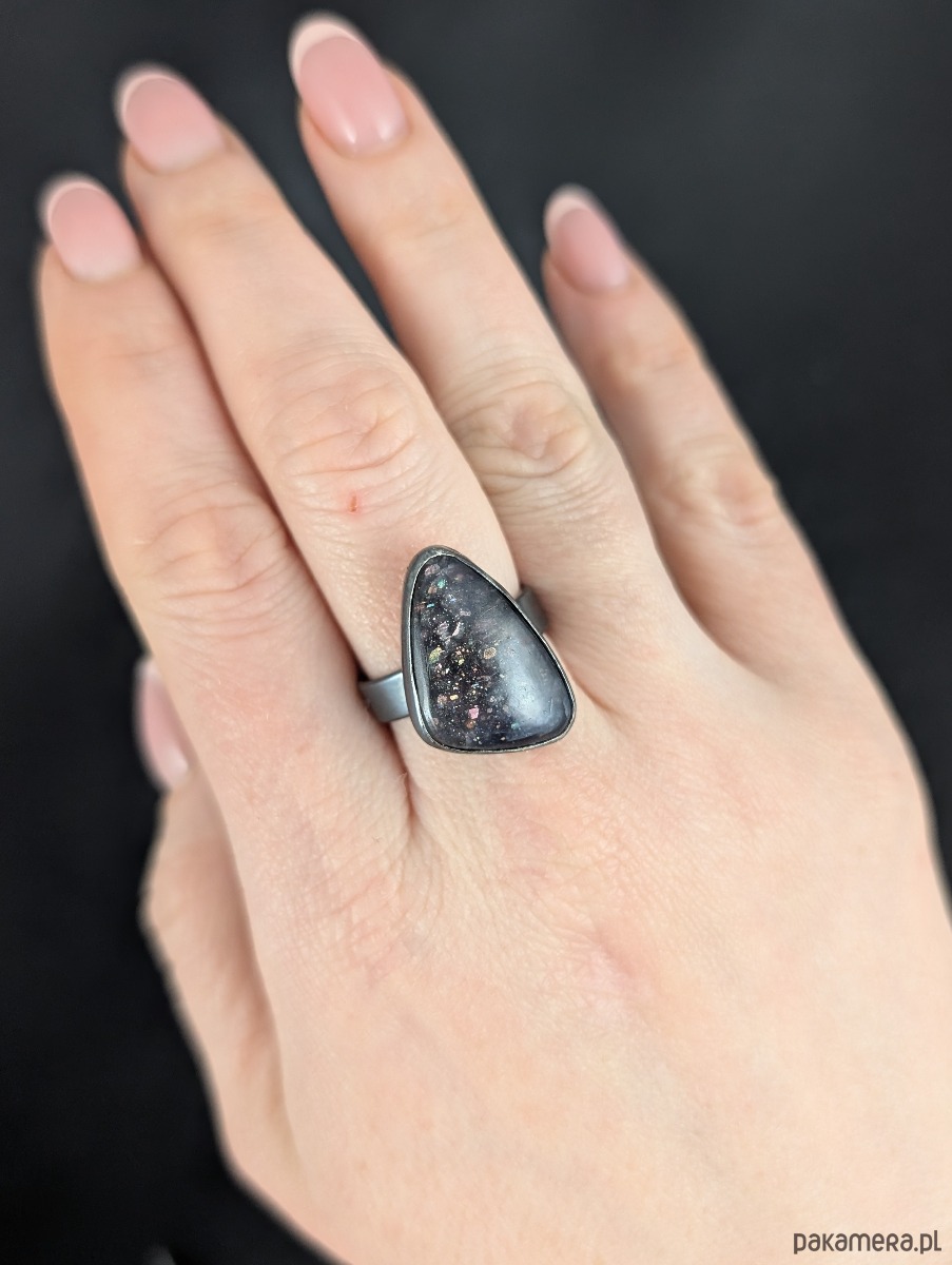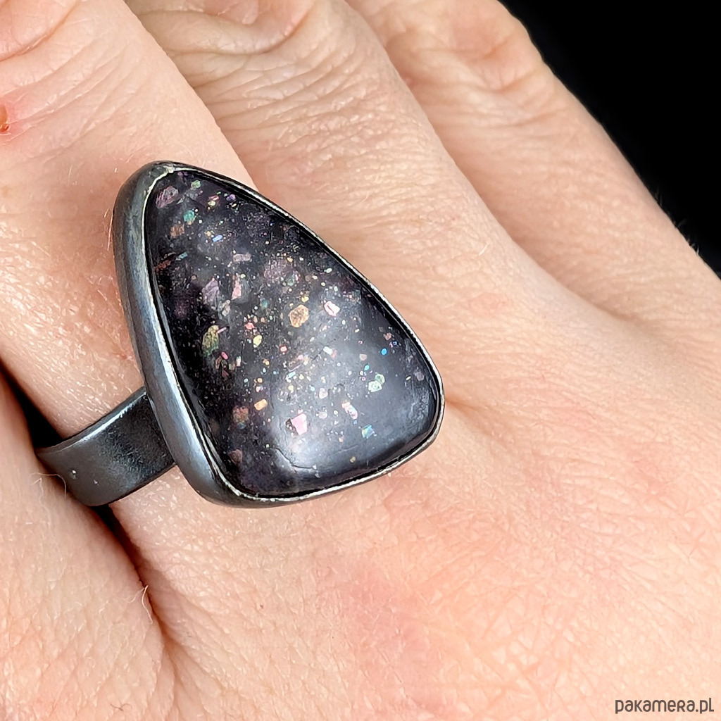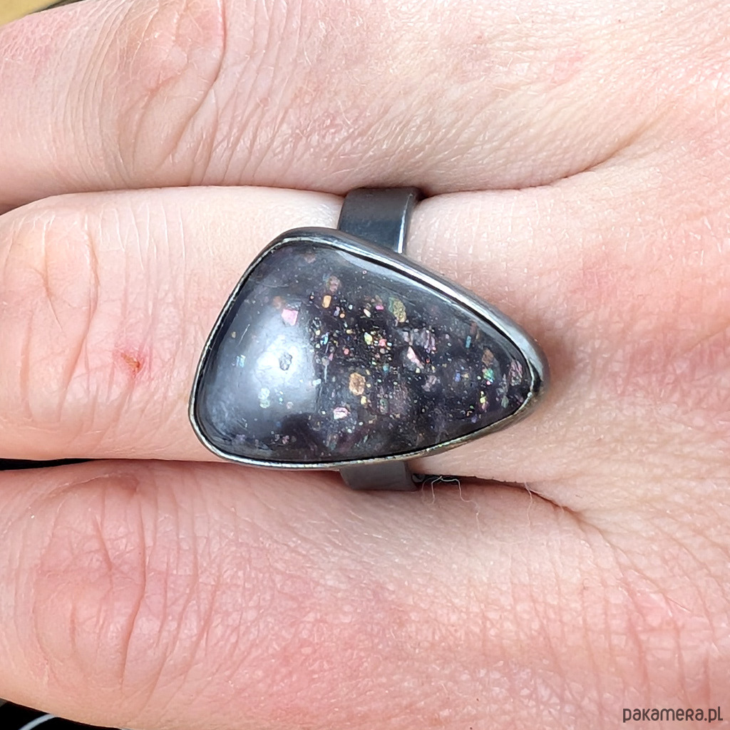 Zjawiskowy iolit o niezwykłej tafli iskrzacych drobinek kamienia słonecznego oprawiony w srebro pr 925. Srebro oksydowane.