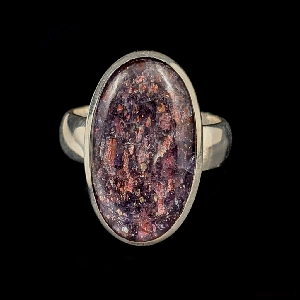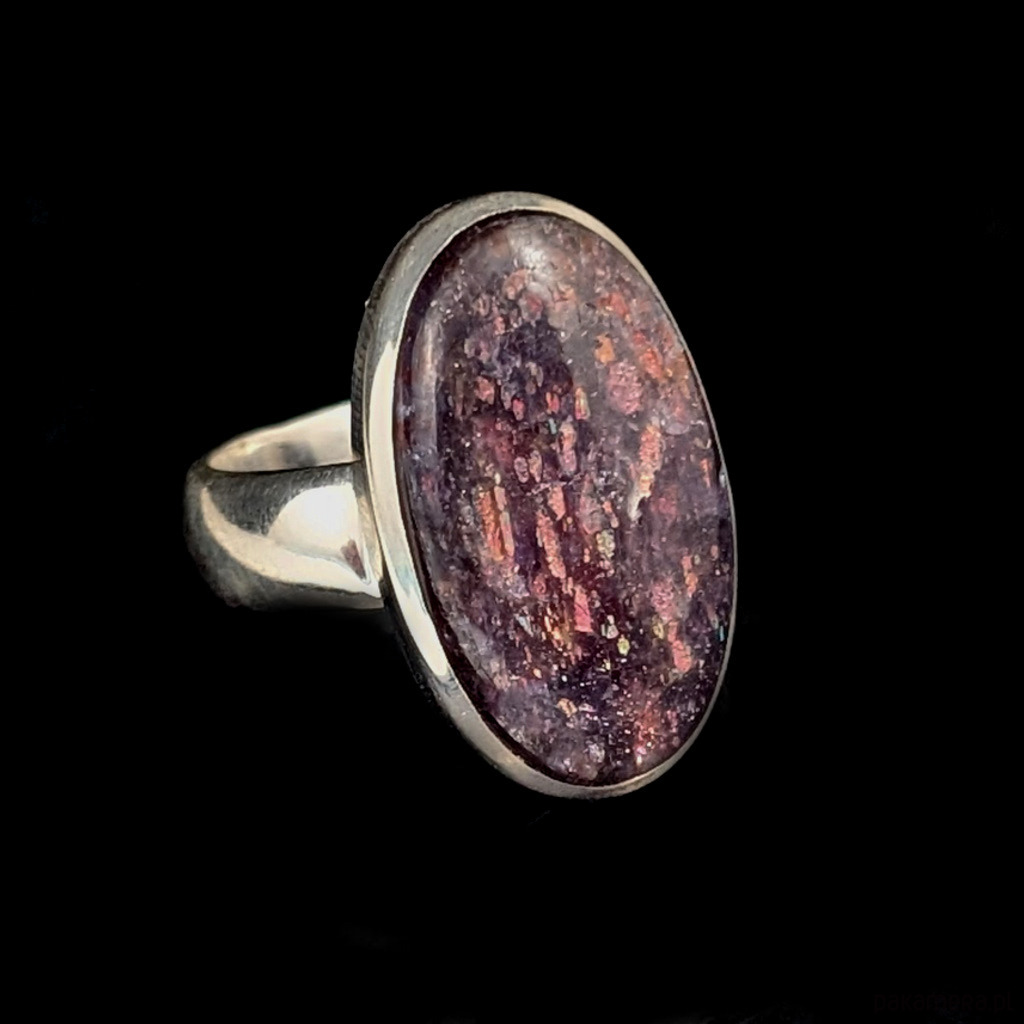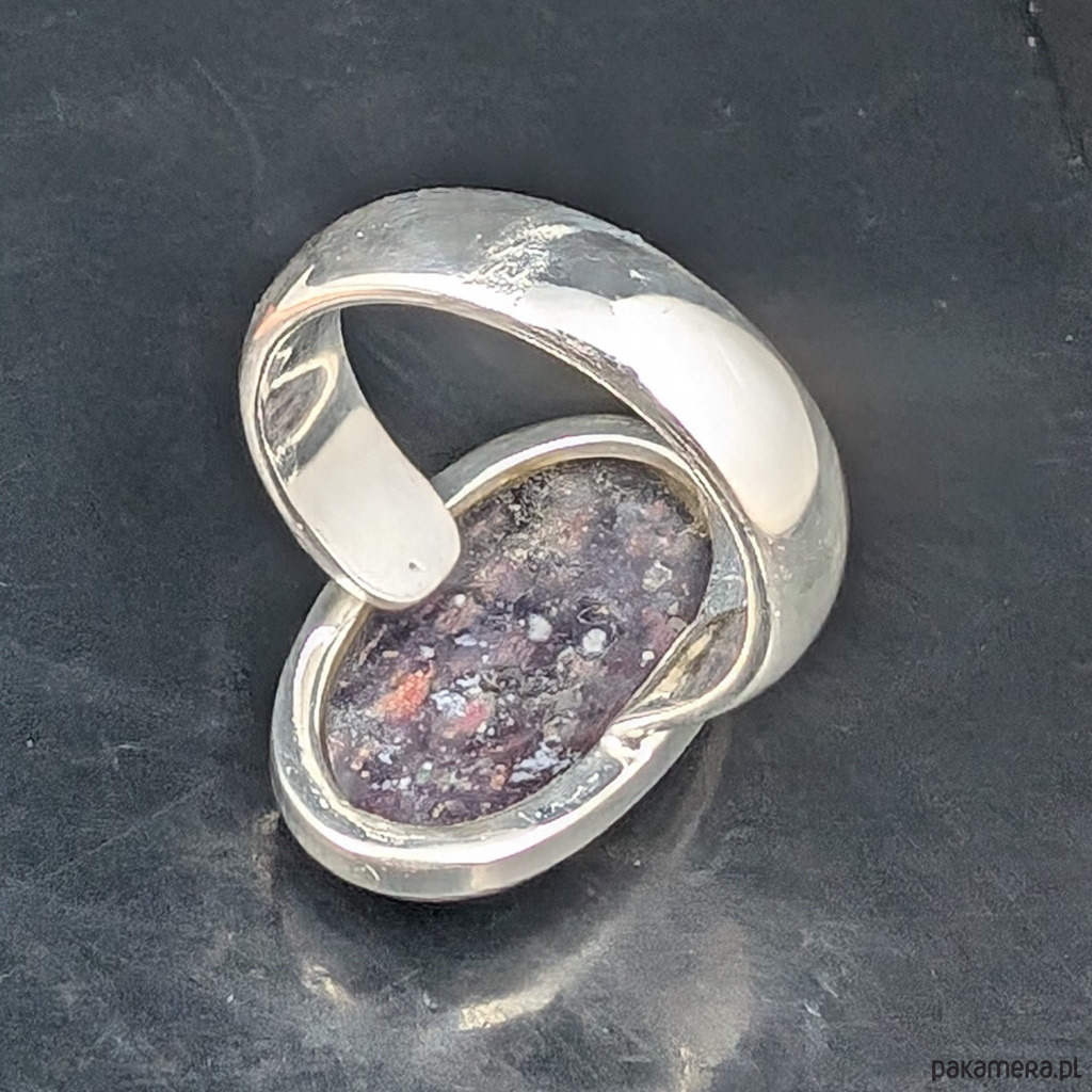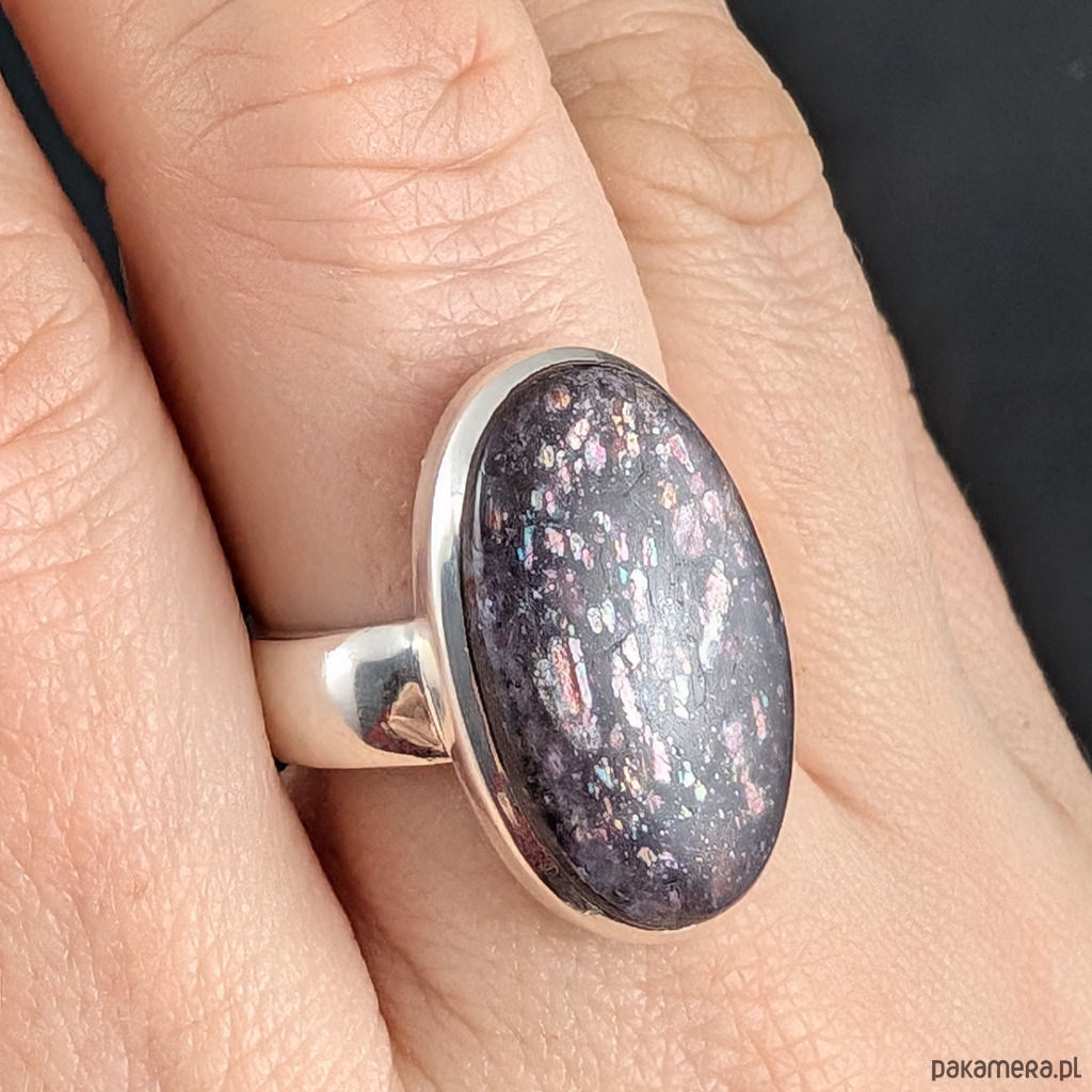 Pierścień wykonany ze srebra próby 925, który zdobi wyjątkowy okaz kamienia słonecznego w iolicie. Rzadki minerał wykazujący tzw.efekt awenturyzacji w postaci maleńkich mieniących się wrostów- łusek innych minerałów,np.hematytu. Niezwykle mienią się w słońcu i świetle maleńkimi różowo-czerwonawymi drobinami. Ciekawe i atrakcyjne połączenie dwóch minerałów. Kamień ma oprawę 25 x 15 mm. Pierścionek w rozmiarze jubilerskim regulowanym w wąskim zakresie rozmiarów 16- 20. Proszę napisać na jaki dopasować. Waga 9g Wykonany przez dostawcę kamieni.