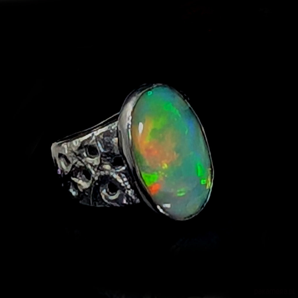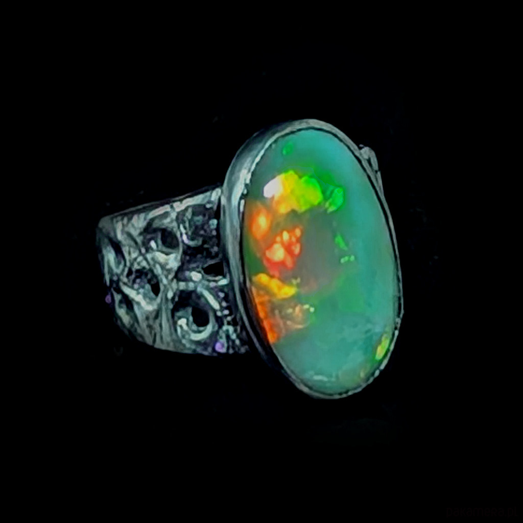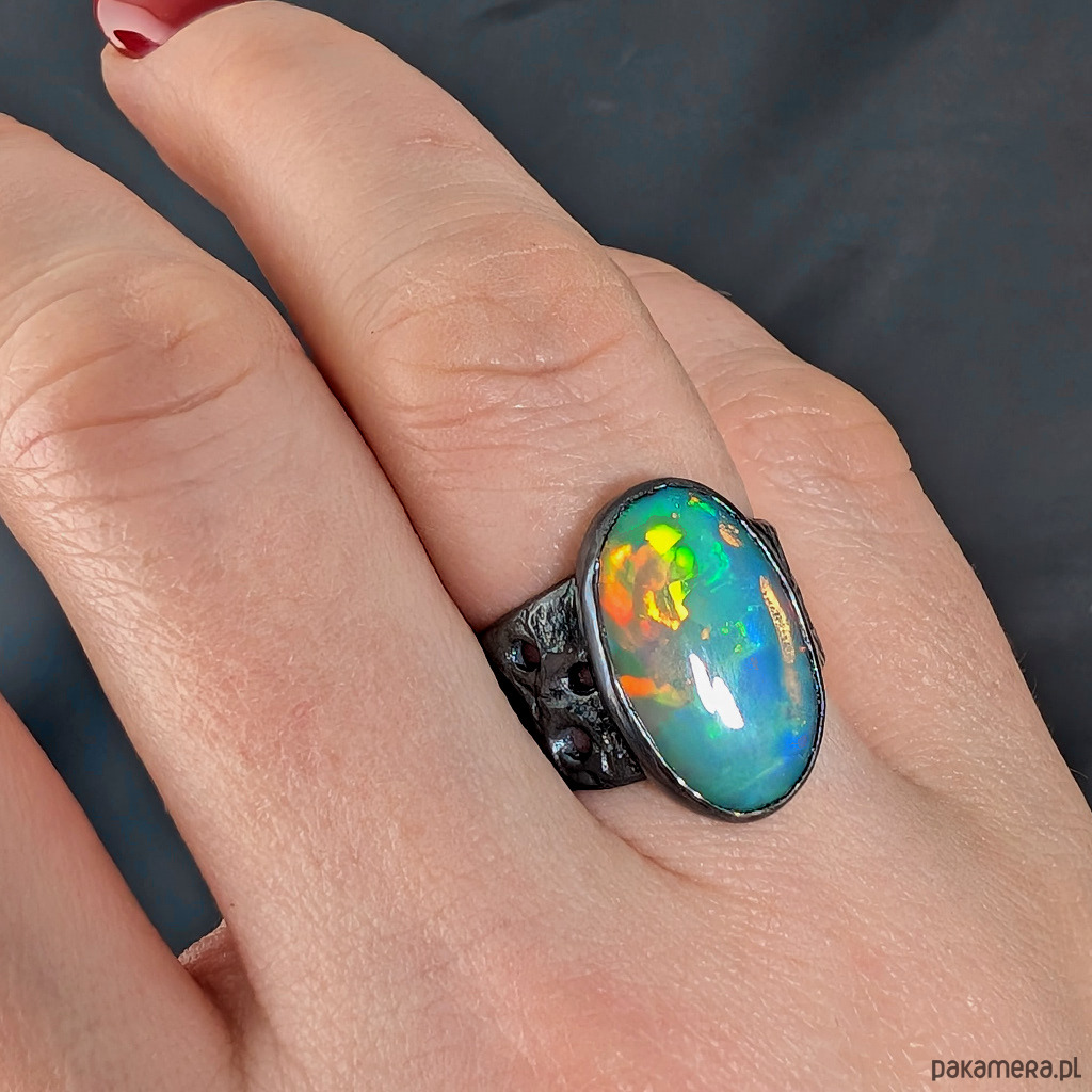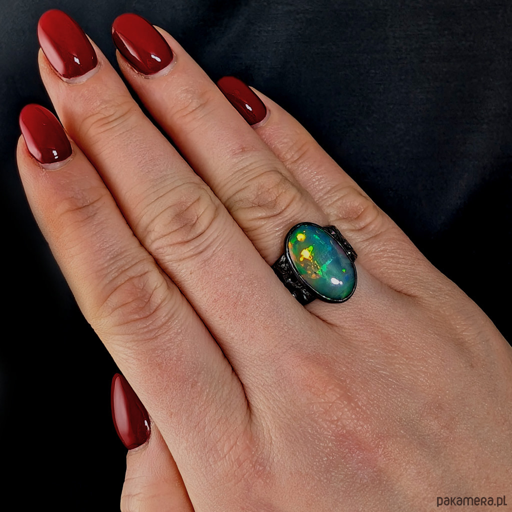 Oryginalny pierścień wykonany z oksydowanego srebra próby 925. Ażurową obrączkę (max 13 mm szerokości) zdobi wyjątkowy duży okaz szlachetnego pięknego opalu z Etiopii. Kamień ma oprawę 19 x 12 mm. Pierścionek w rozmiarze jubilerskim 15, mogę powiększyć do max 16, dopasuję po zakupie. waga 5,7 grama. Zostanie wysłany w ozdobne pudełeczko.