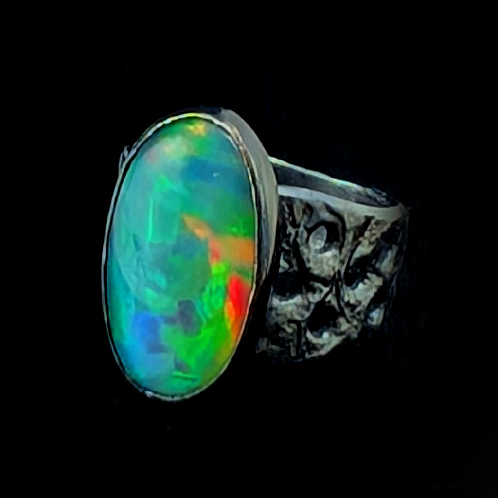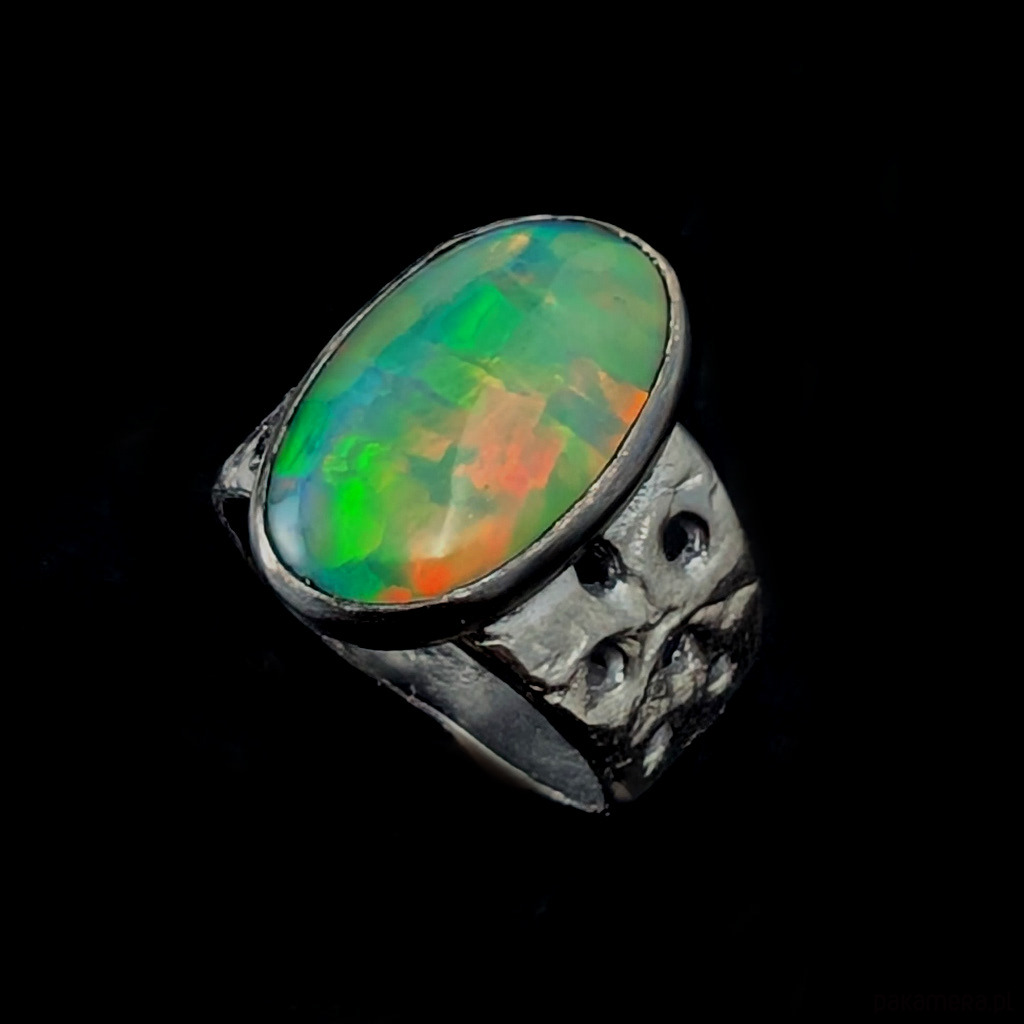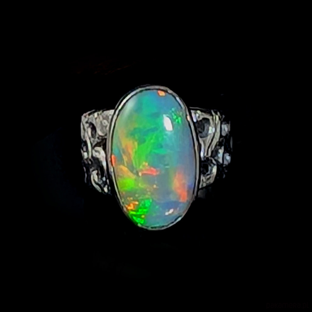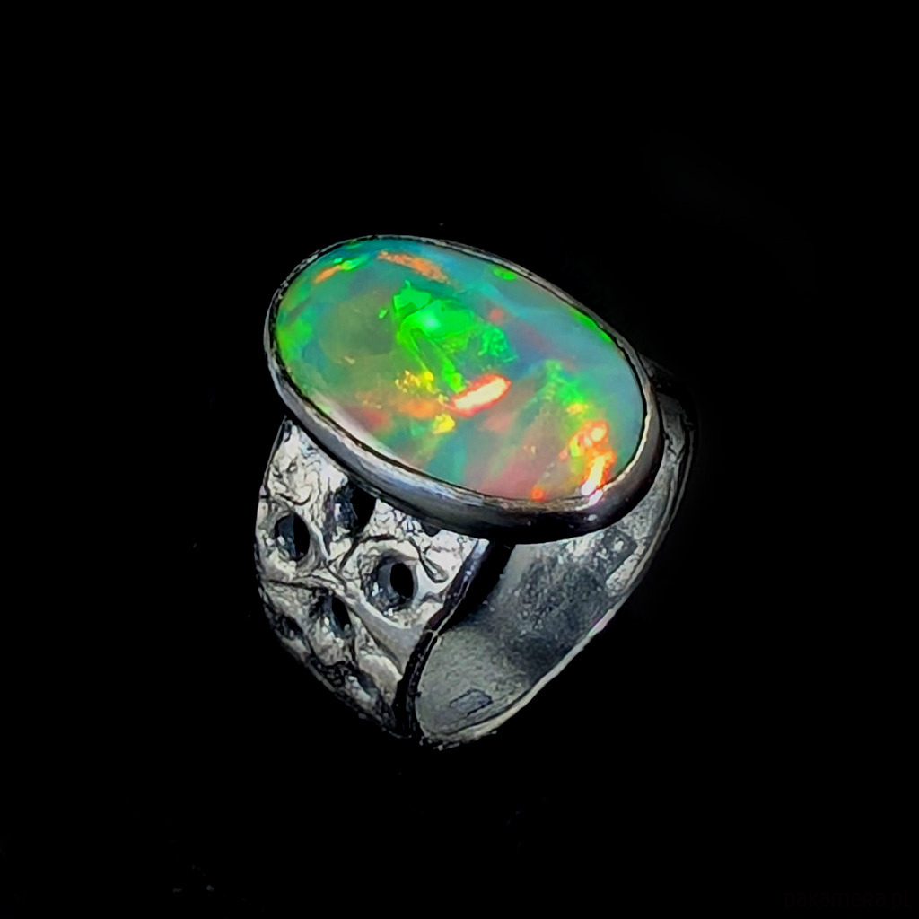 Oryginalny pierścień wykonany z oksydowanego srebra próby 925. Ażurową obrączkę (max 13 mm szerokości) zdobi wyjątkowy duży okaz szlachetnego pięknego opalu z Etiopii. Kamień ma oprawę 19 x 12 mm. Pierścionek w rozmiarze jubilerskim 15, mogę powiększyć do max 16, dopasuję po zakupie. waga 5,7 grama. Zostanie wysłany w ozdobne pudełeczko.