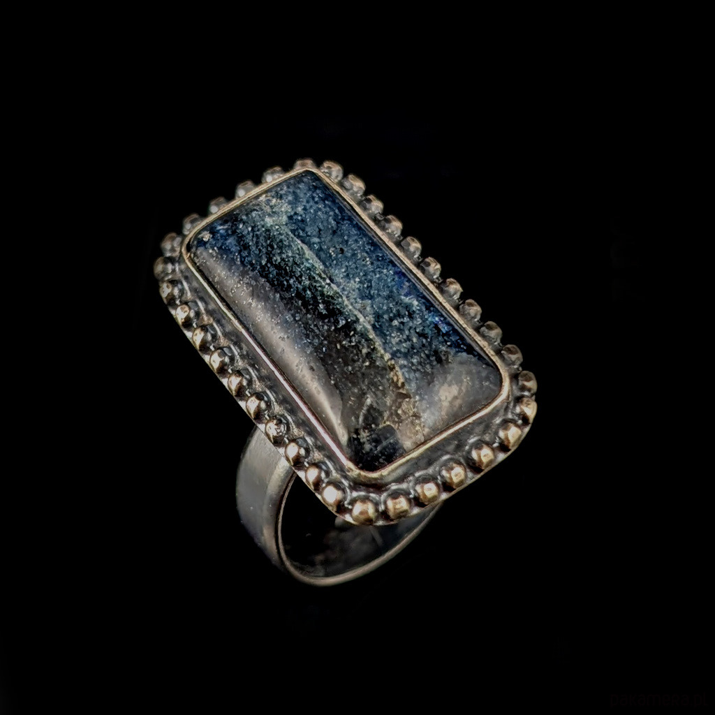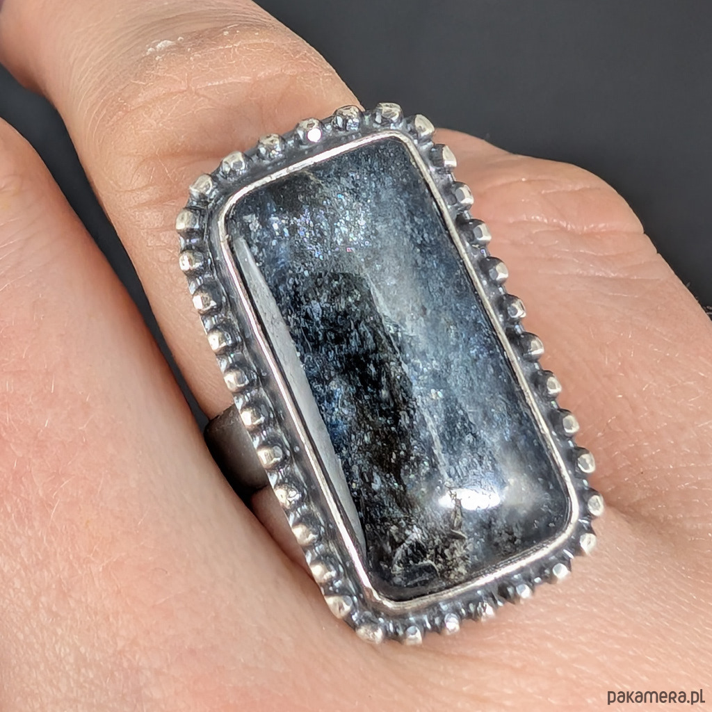 Pierścionek wykonany z oksydowanego srebra próby 925 oraz pięknego kyanitu o rzadkiej morskiej barwie. Wymiary oprawy kamienia 30 x 17 mm. Rozmiar jubilerski regulowany w szerkim zakresie, proszę napisać, na jaki dopasowac. Waga 12,4 grama. Pierścień zostanie zapakowany w ozdobne pudełeczko.