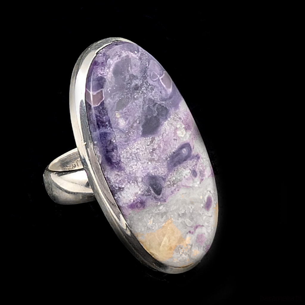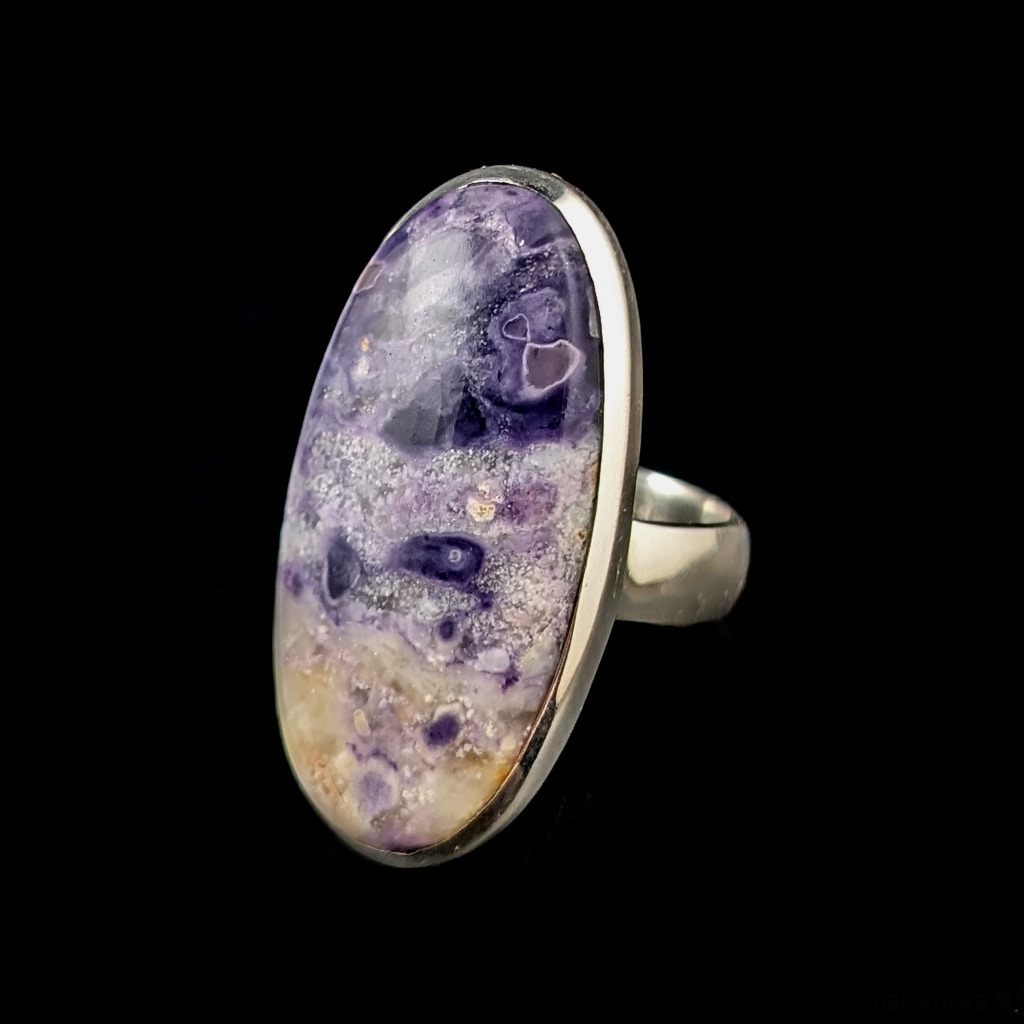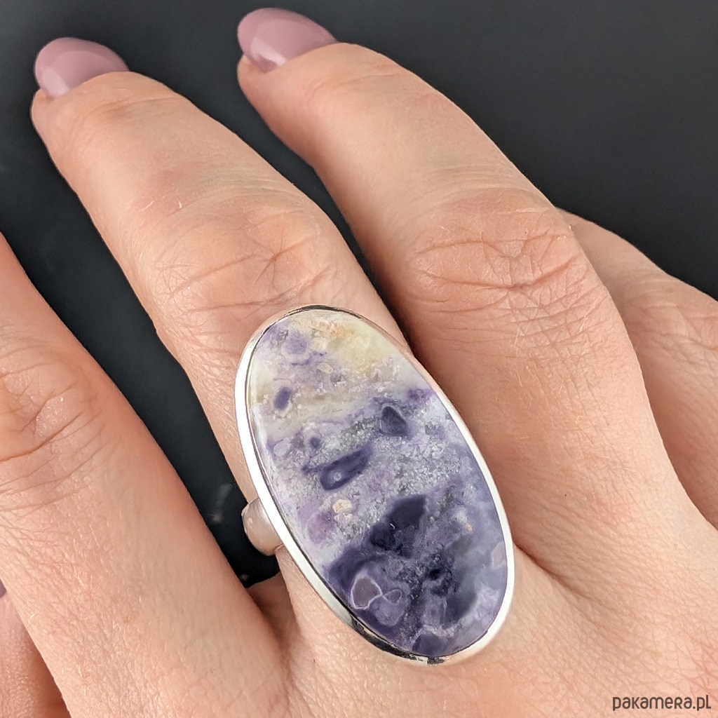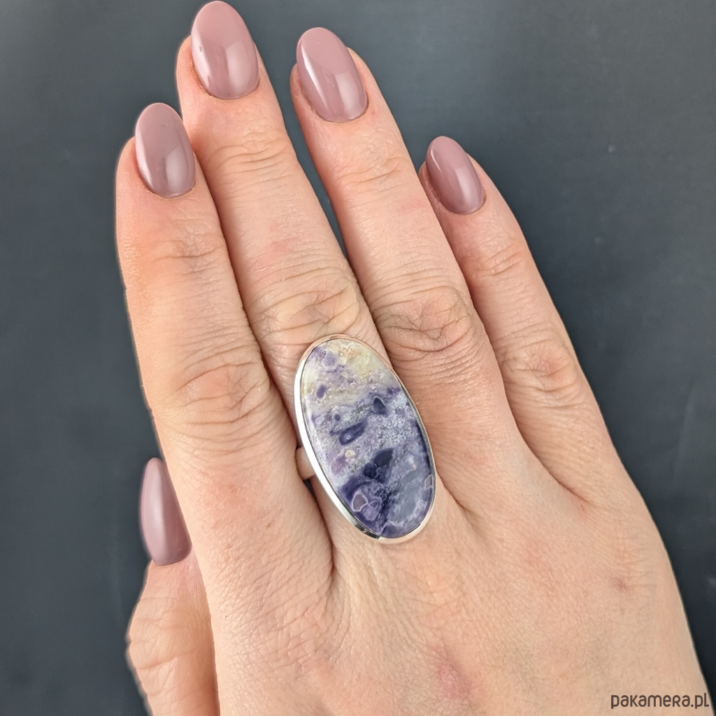 Pierścień wykonany ze srebra próby 925 oraz jaspisu Tiffany. Piękne połączenie fioletu i beżowego. Wymiary oprawy kamienia 33 x 17 mm. Rozmiar jubilerski regulowany w wąskim zakresie 14-17. Proszę napisać na jaki dopasować. Waga 10 g. Wykonany przez dostawcę kamieni. Pierścień zostanie wysłany w ozdobnym pudełeczku.