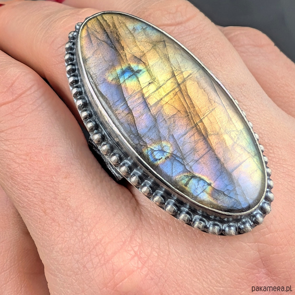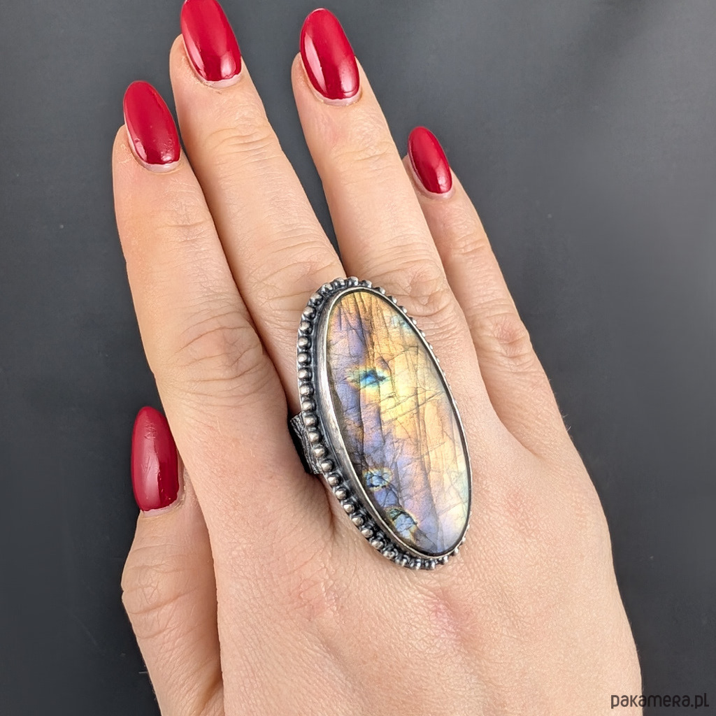 Oryginalny pierścień wykonany z oksydowanego srebra próby 925 z wkomponowanym naturalnym labradorytem o pięknej labradoryzacji intensywnych barw ukazujących się pod odpowiednim kątem. Wymiary 50 x 26 mm, rozmiar jubilerski 25, mogę powiększyć do max 26. Waga 28 gramów. Zapakowany w ozdobne pudełeczko.