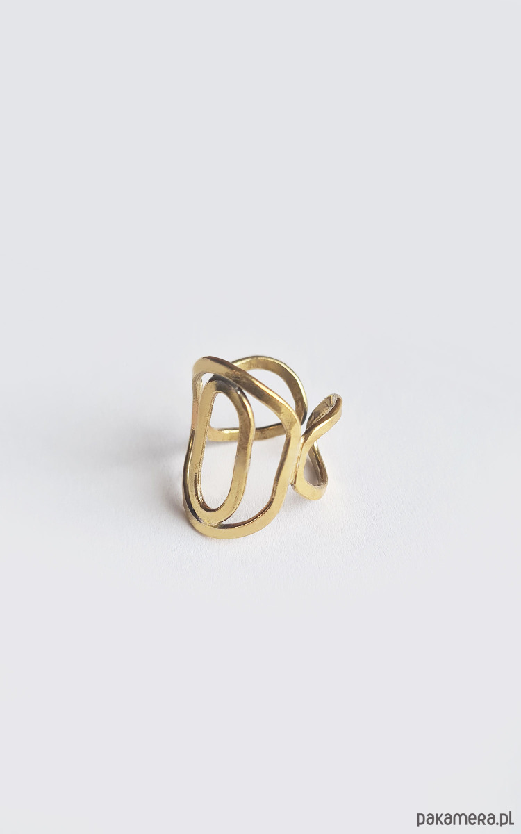 Pierścionek wykonany ręcznie z mosiądzu (złocony = pokryty cienką warstwą złota) o szerokości ok. 22 mm (w najszerszym miejscu).