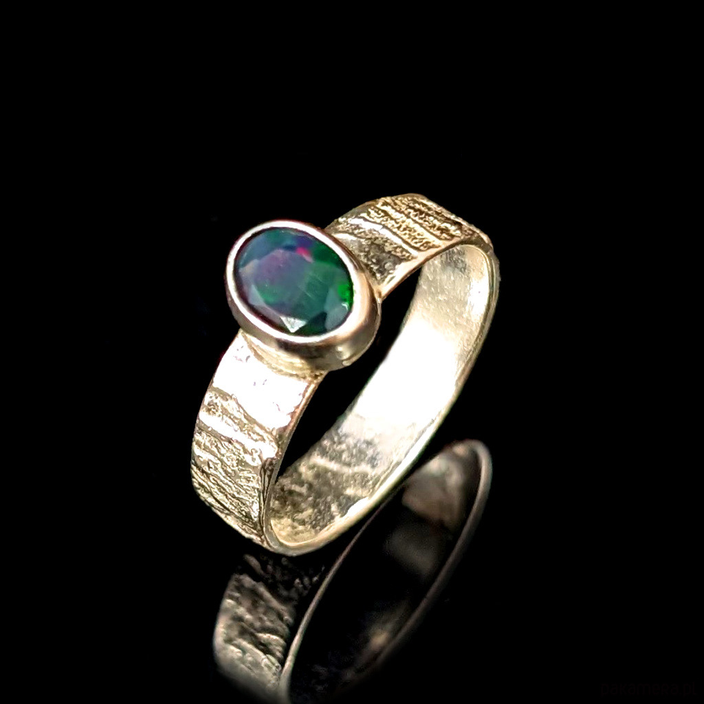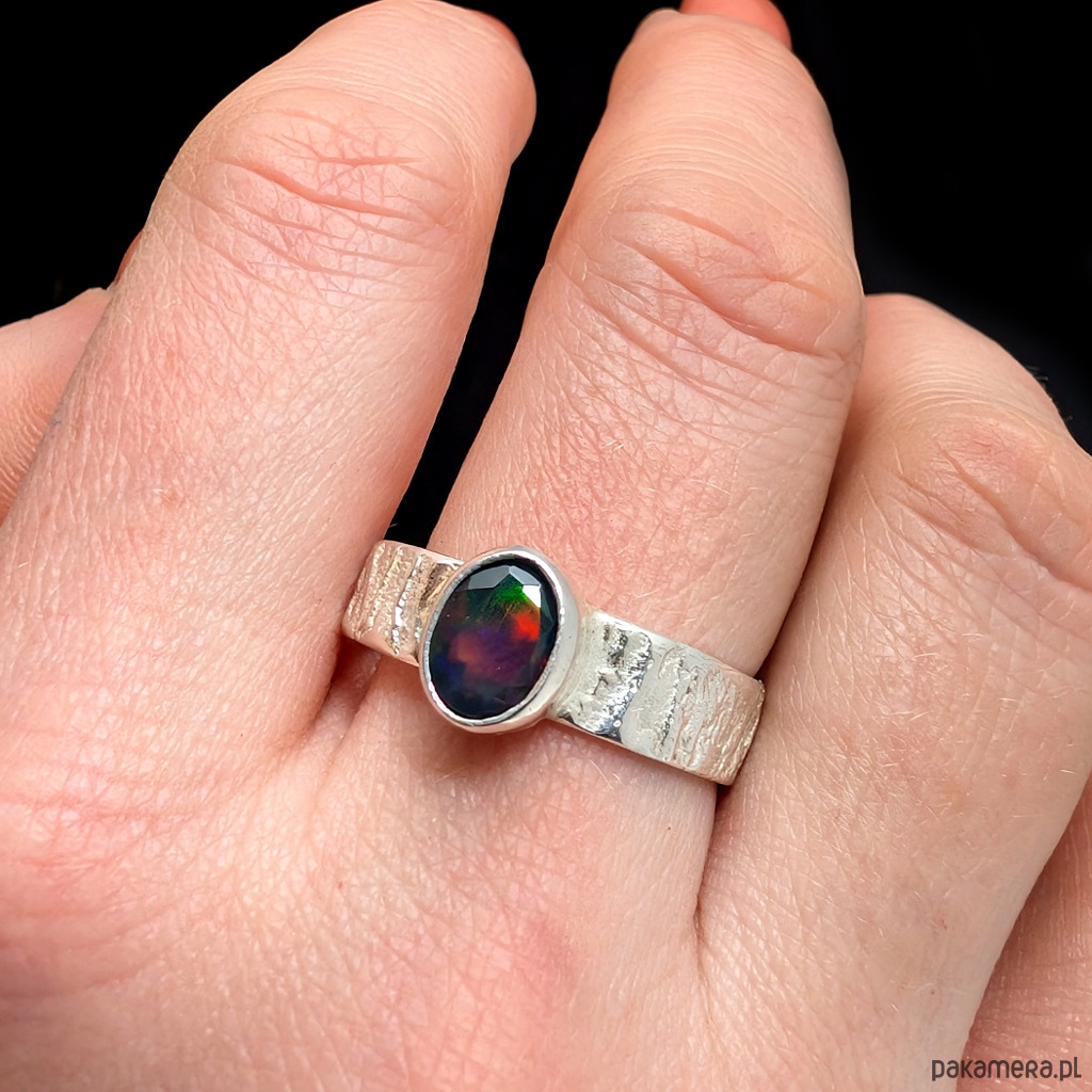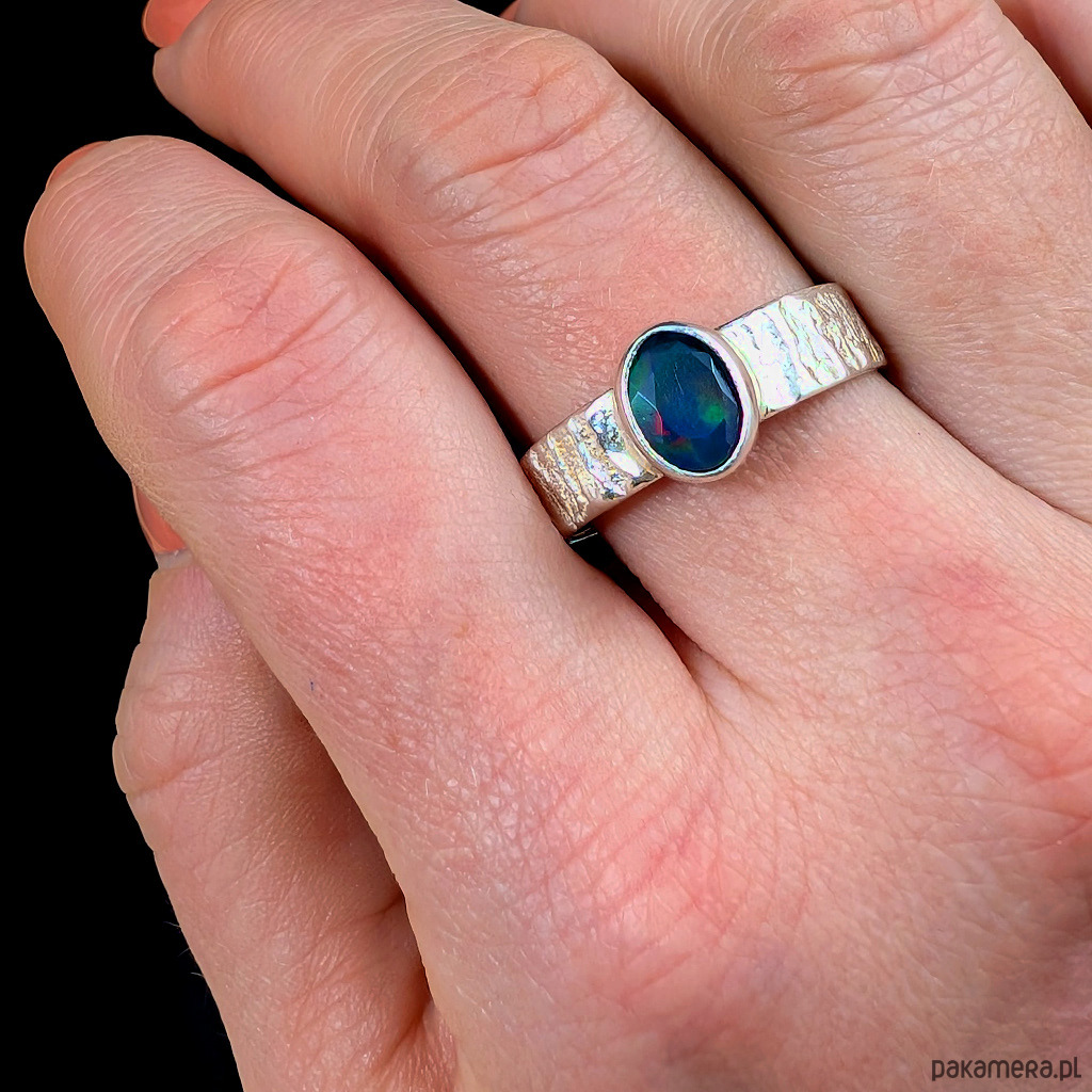 Pierścionek z czarnym opalem etiopskim oprawionym w srebro 925. Kamień kameleon- zmienia barwę z zależności od kąta padania światła. Rozmiar jubilerski 26. Możliwe zamówienie podobnego pierścionka. Obrączka ma 5 mm szerokości. Oprawa kamienia 9 x 7 mm. Waga 4,6 g. Pierścień zostanie zapakowany w ozdobne pudełeczko.