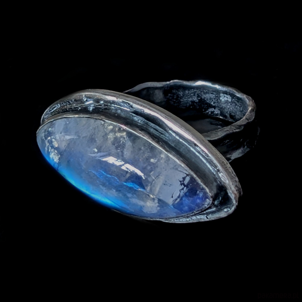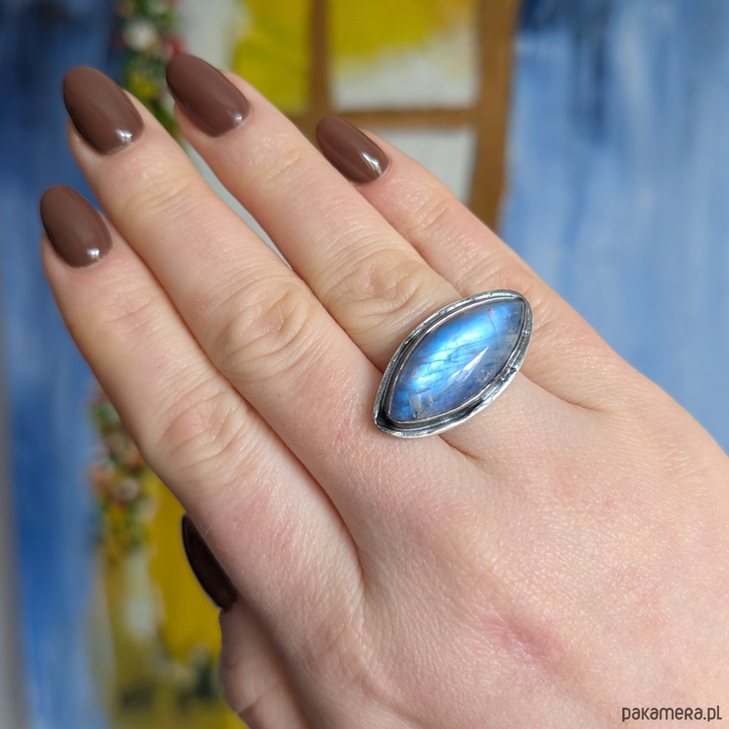 Subtelny pierścionek z oprawionym w oksydowaną ramę srebra próby 925 pięknym, naturalnym kamieniem księżycowym. Obrączka szerokość 5 mm. Wymiary oprawy pierścionka 30 x 15 mm. Rozmiar jubilerski 15, mogę powiększyć na max 16 Waga 10 g. Pierścień zapakowany zostanie w ozdobne pudełeczko.