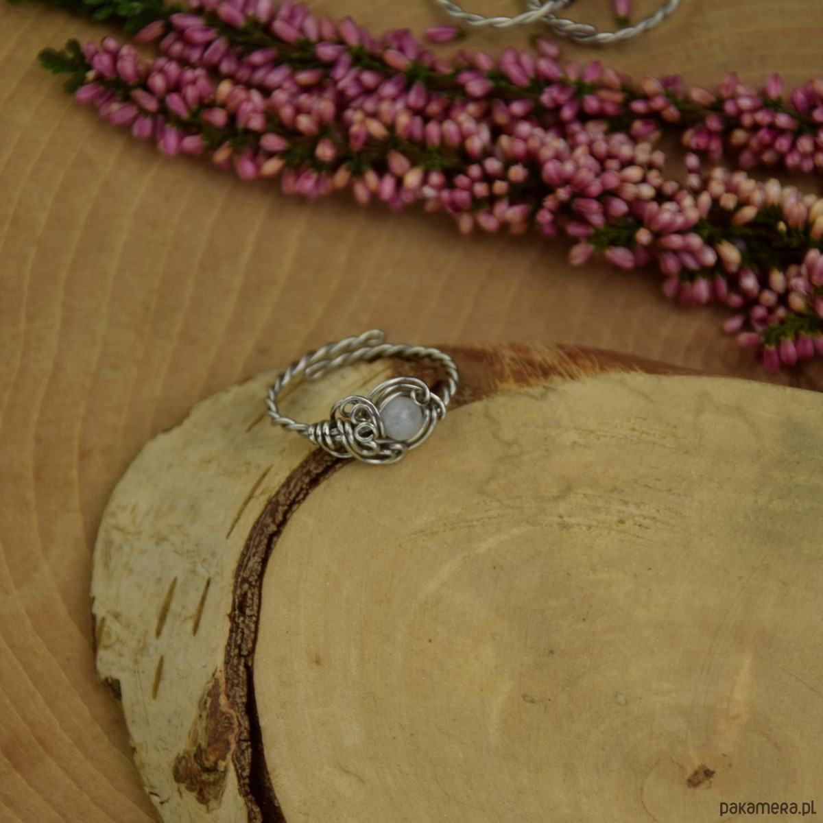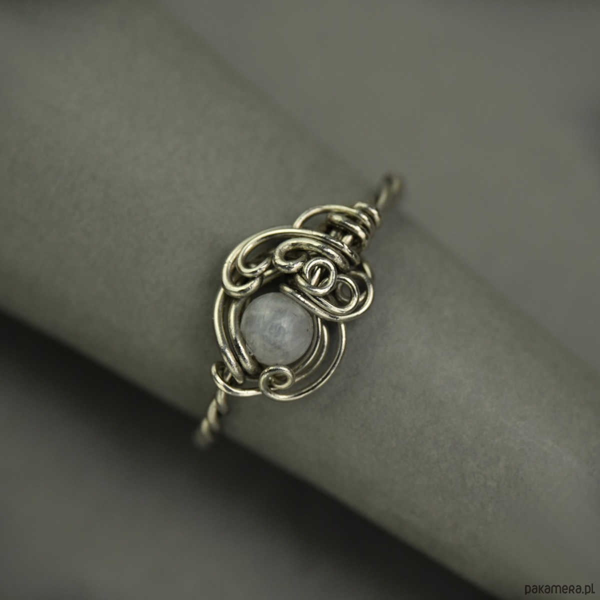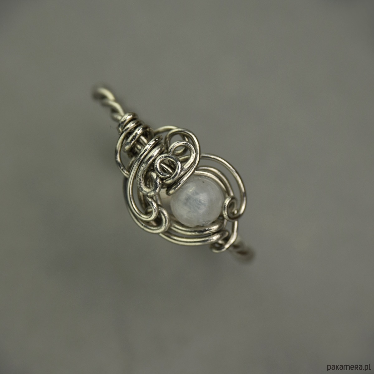 Ręcznie wykonany pierścionek z kamieniem księżycowym. Stworzony w całości z drutów ze stali chirurgicznej techniką wire wrapping.