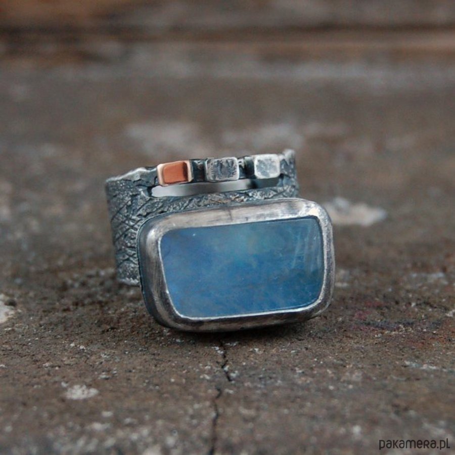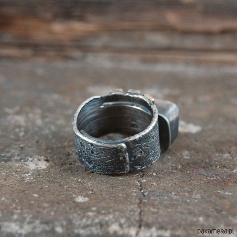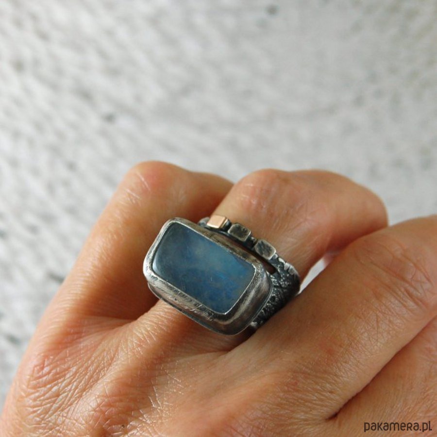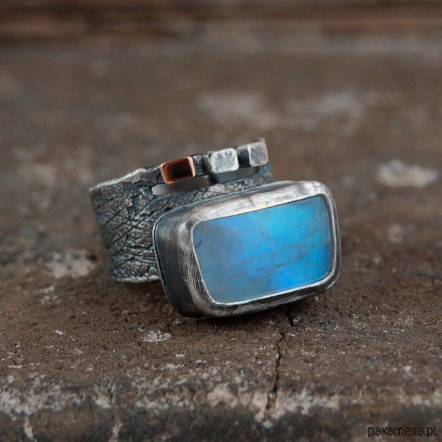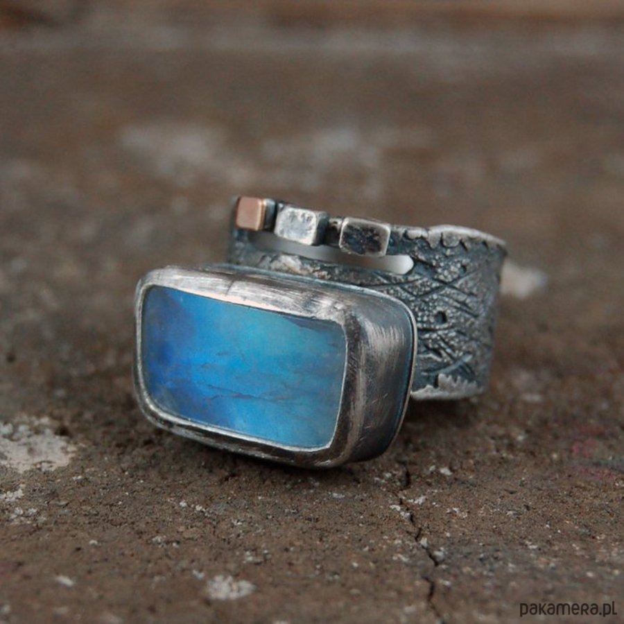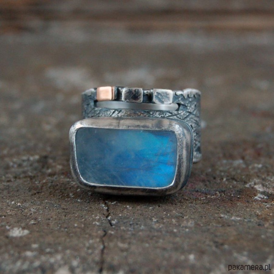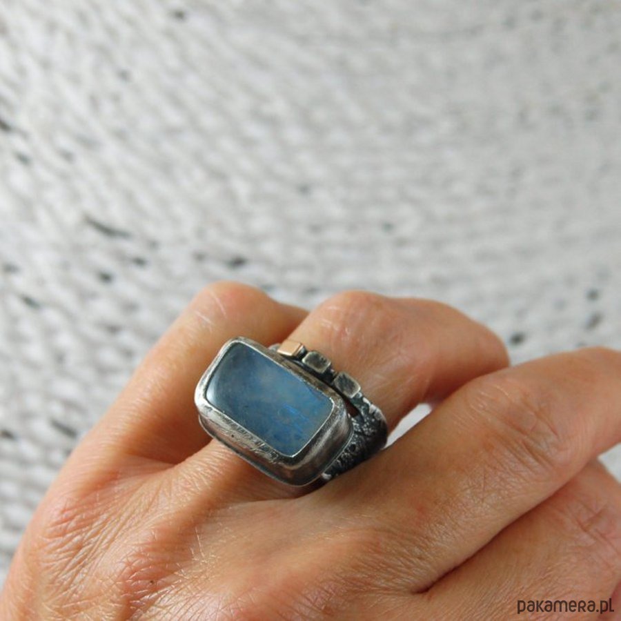 Pierścionek ze srebra, złota próby 585 i kamienia księżycowego. Srebro oksydowane. Wielkość kamienia 1 - 1,7 cm, maksymalna szerokość obrączki 1,4 cm, rozmiar regulowany. Proszę o podanie rozmiaru pierścionka.