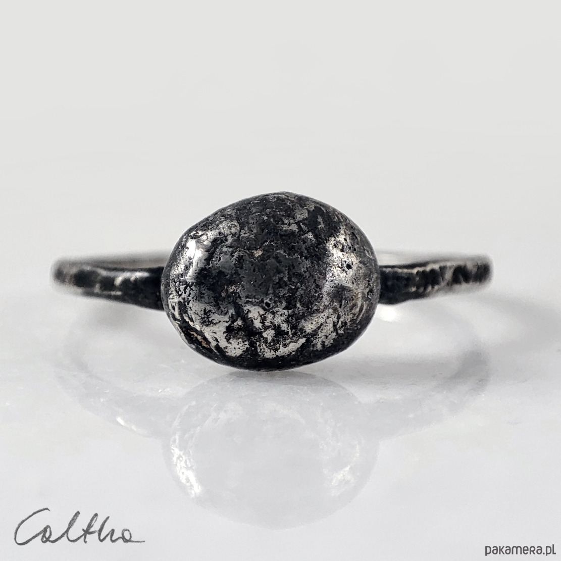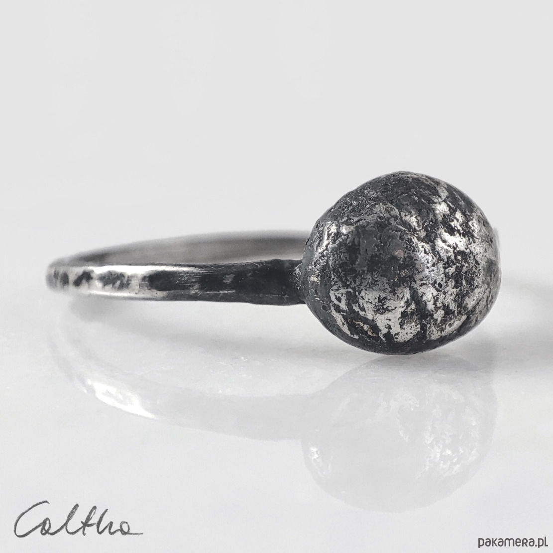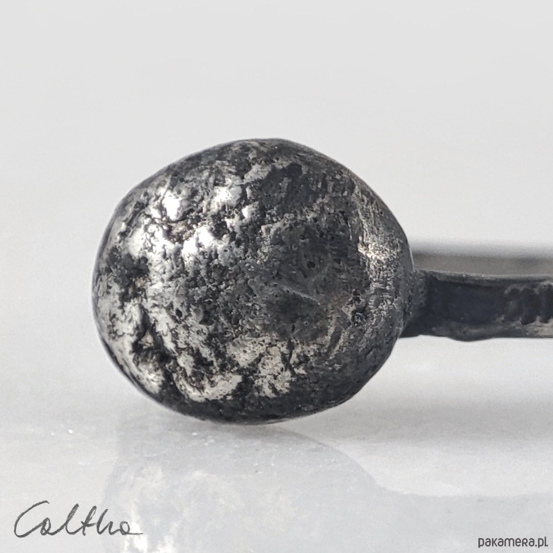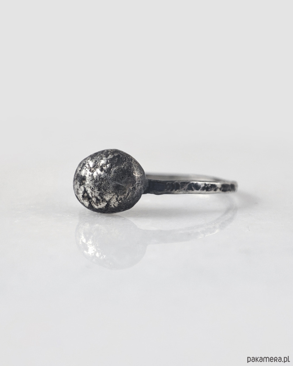 Pierścionek powstał w jednym egzemplarzu. Biżuterię wykonuję od podstaw przy użyciu prostych narzędzi. Ręczne wykonanie cechuje lekka nieregularność, a zarazem niepowtarzalność każdego przedmiotu.
