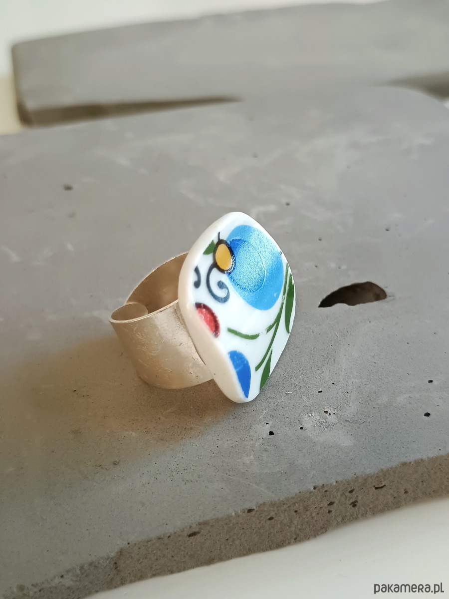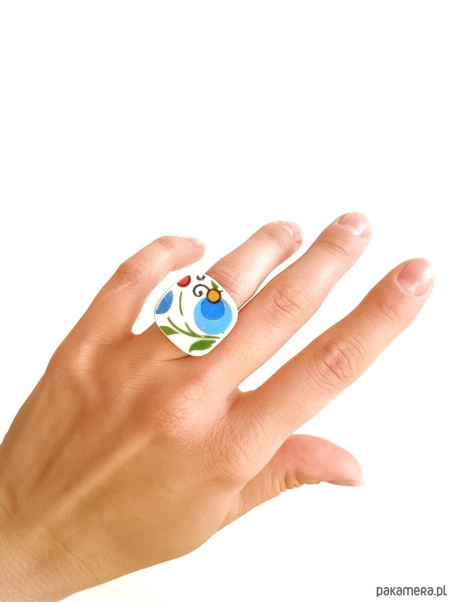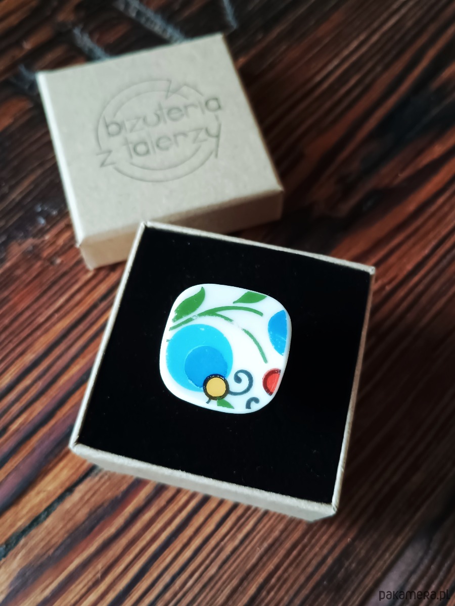 Kwadratowy pierścionek, który wykonałam z fragmentu stłuczonego talerza wyprodukowanego w fabryce Lubiana z tradycyjnym wzorem kaszubskim. Kawałek tej stłuczki oszlifowałam i połączyłam z metalową bazą w kolorze srebrnym. Baza jest regulowana - będzie pasowała na każdy rozmiar. Ceramikę zeszlifowałam również z grubości - jest cieńsza niż pierwotnie, dzięki czemu pierścionek nie jest ciężki. Brzegi pokryłam lakierem, co sprawia, że nie brudzą się i nie chłoną wilgoci. Wymiary elementu ceramicznego: 23 x23 mm. Unikat - każdy z moich wyrobów występuje w jednym egzemplarzu. Upcykling - nie reprodukuję wykorzystywanych wzorów, niczego nie domalowuję - wykorzystuję wyłącznie oryginalne naczynia i motywy, które się na nich znajdują. Tym samym, stłuczce z odzysku nadaję nowe życie.