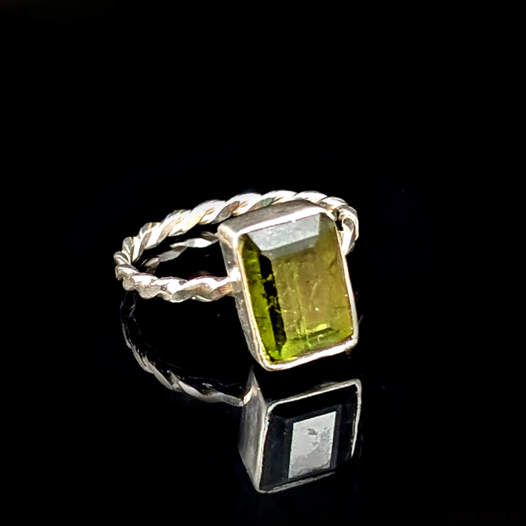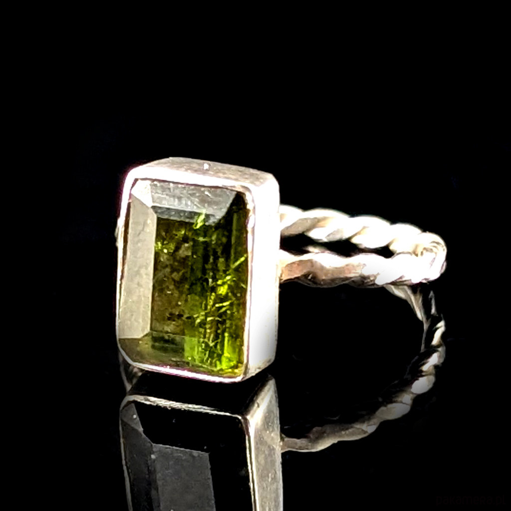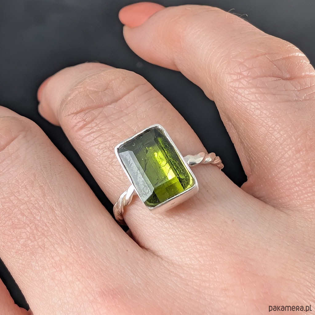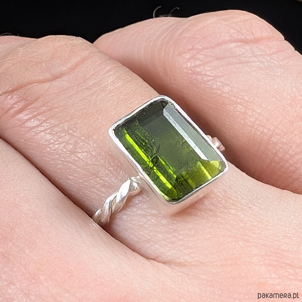 Retro pierścień z oprawionym w srebro próby 925 przepięknym zielonym turmalinem. Oprawa ma 12 x 8 mm. Rozmiar jubilerski 15. Waga 2,84 grama. Pierścień zapakowany w ozdobne pudełeczko.