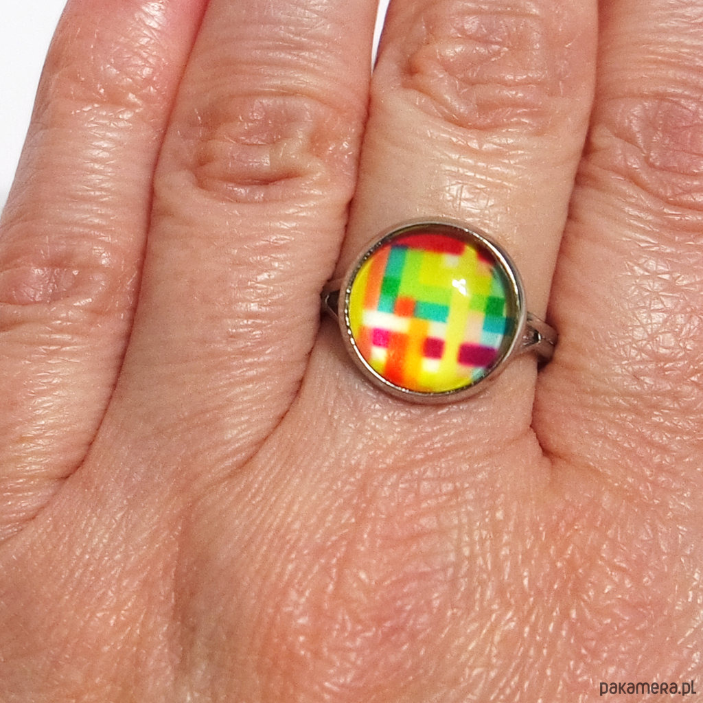 Grafika ukryta w prostym, eterycznym pierścionku, pod osłoną przeźroczystego półokrągłego szkiełka.