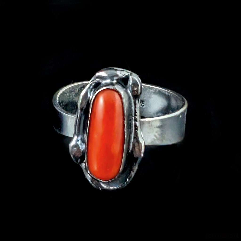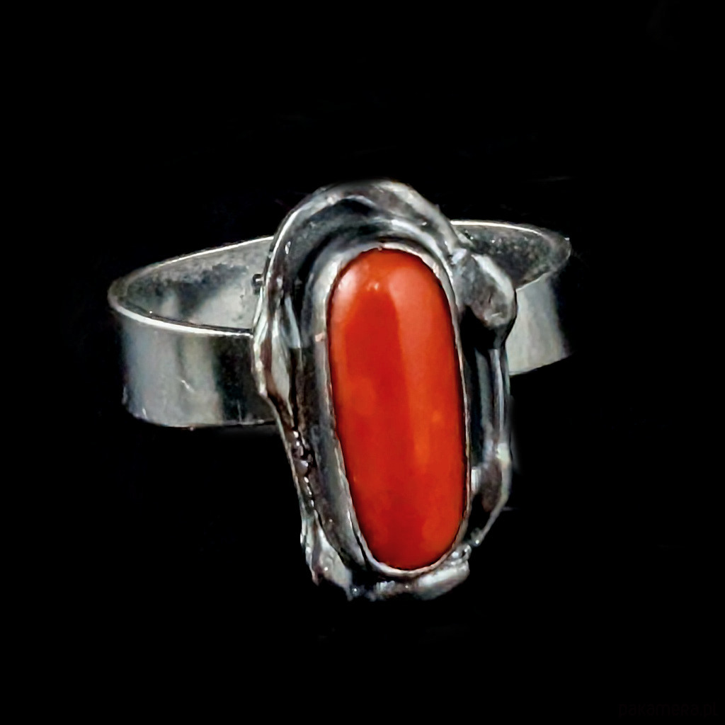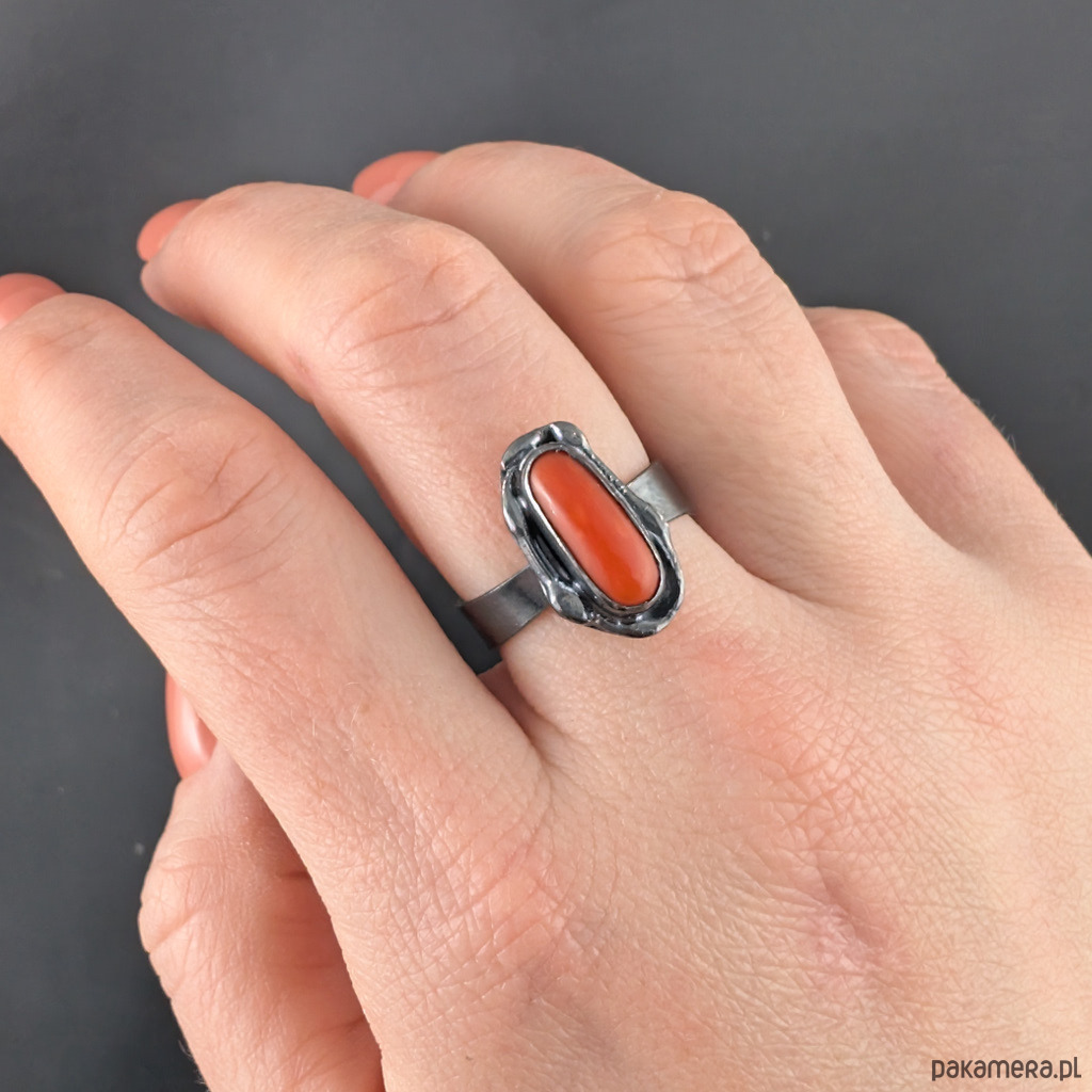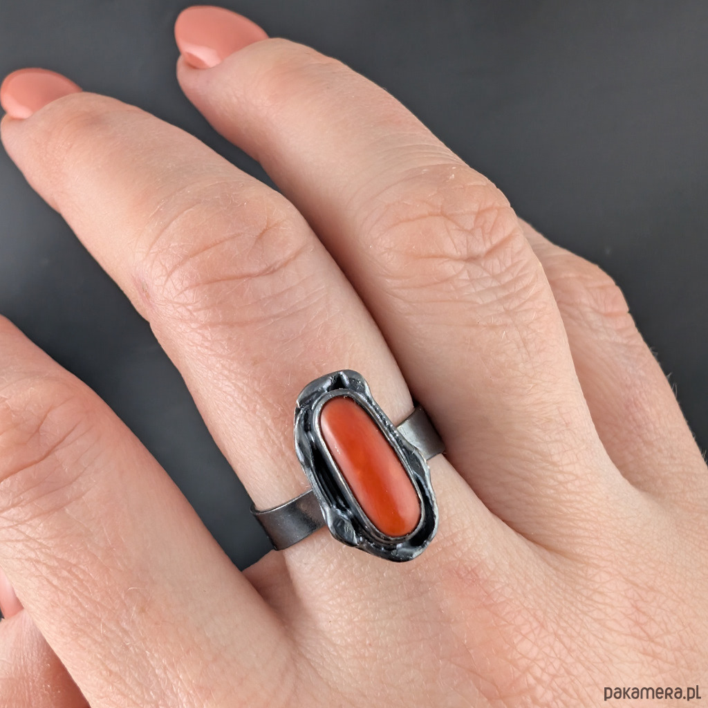 Retro pierścień z oprawionym w oksydowane srebro próby 925 przepięknym koralem szlachetnym. Oprawa ma 19 x 11 mm. Rozmiar jubilerski regulowany w szerokim zakresie, proszę napisać na jaki dopasować. . Waga 5,2 grama. Pierścięń zapakowany w ozdobne pudełeczko, polecam z olczykami do kompletu.