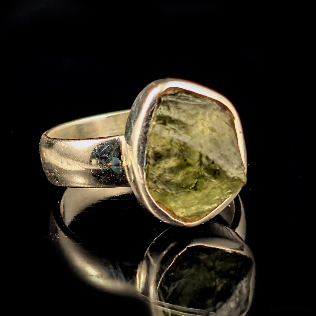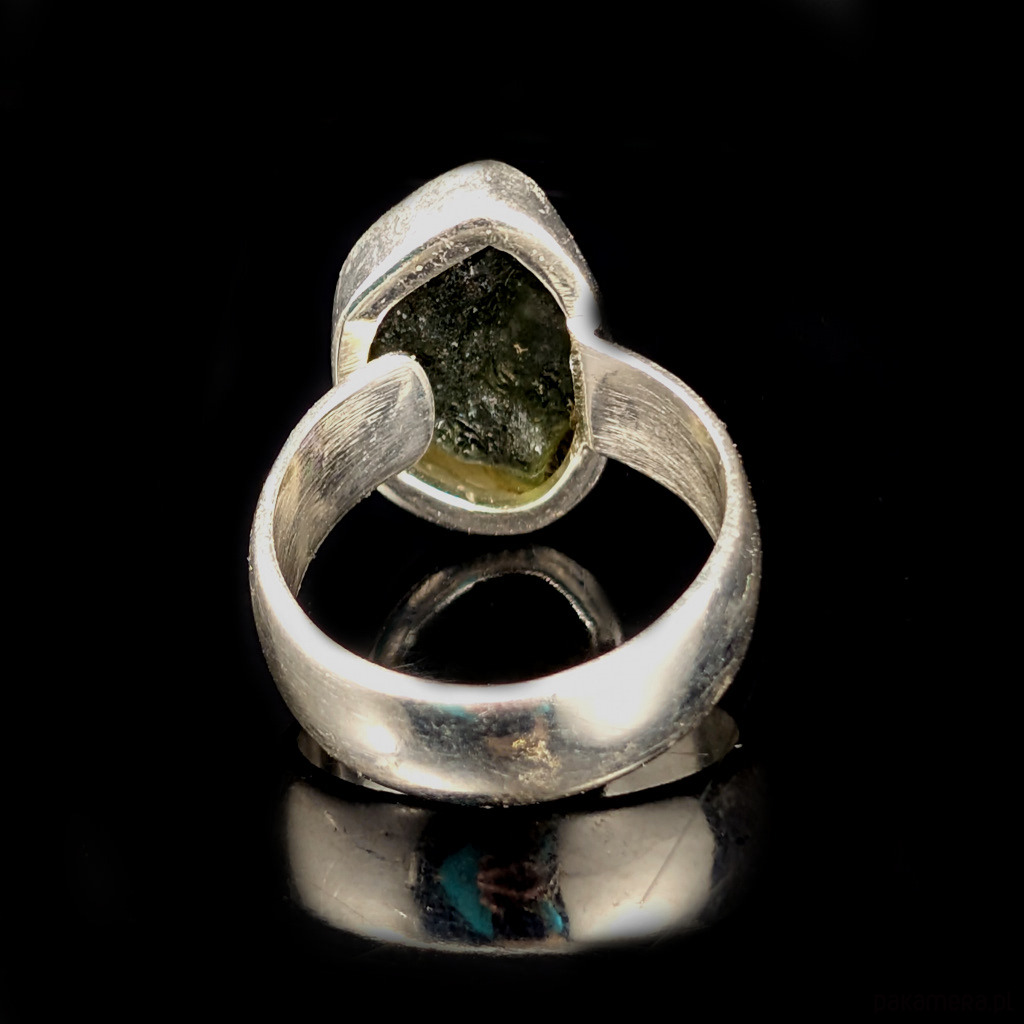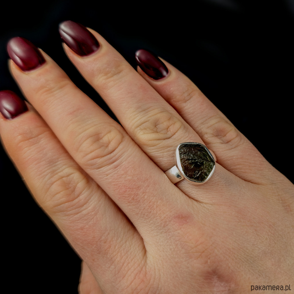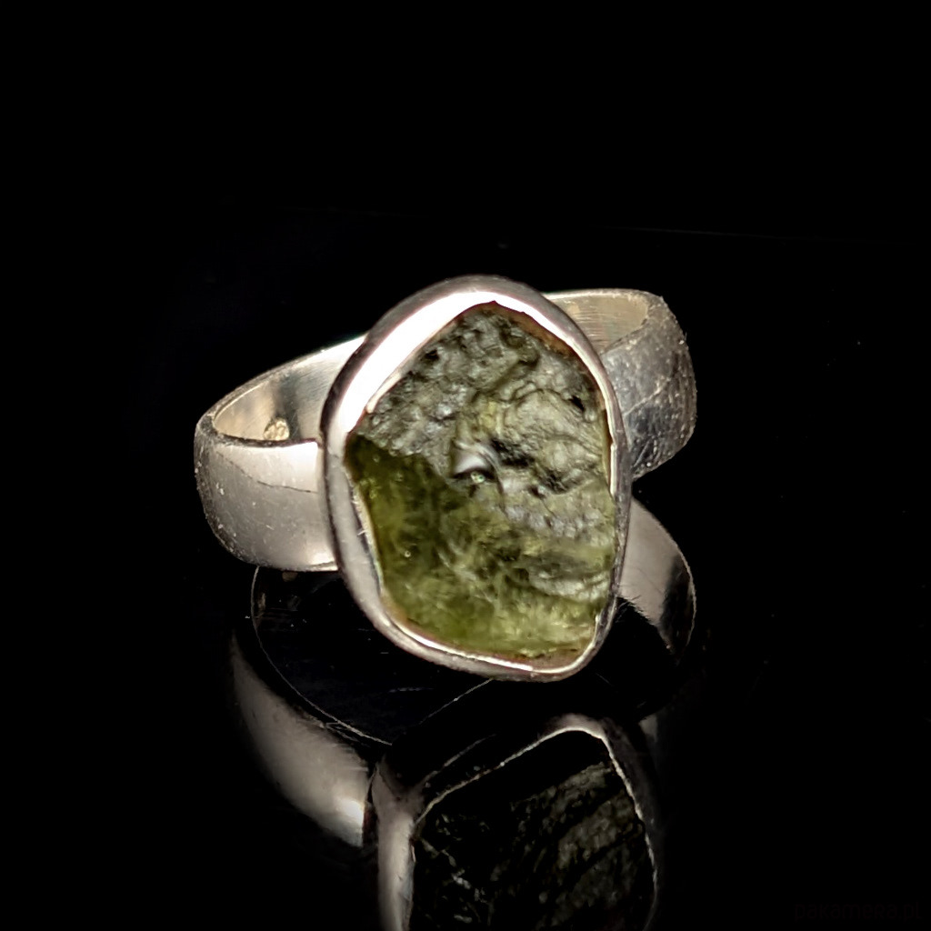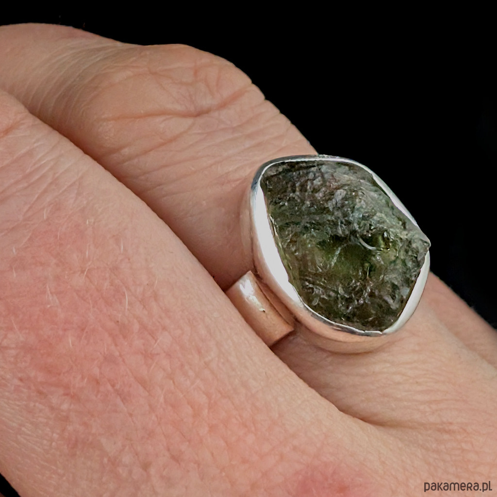 Surowy pierścień z oprawionym w srebro pr. 925 mołdawitem. Mołdawit lub inaczej wełtawit to rodzaj tektytu,który pochodzi z krateru meteorytowego. Wymiary oprawy 15 x 12 mm. Waga 5,9 g. Rozmiar jubilerski regulowany w wąskim zakresie 16-21 dzięki rozcięciu obrączki z boku. Obrączka ma 6 mm szerokości. Pierścionek zostanie wysłany w ozdobnym pudełeczku.