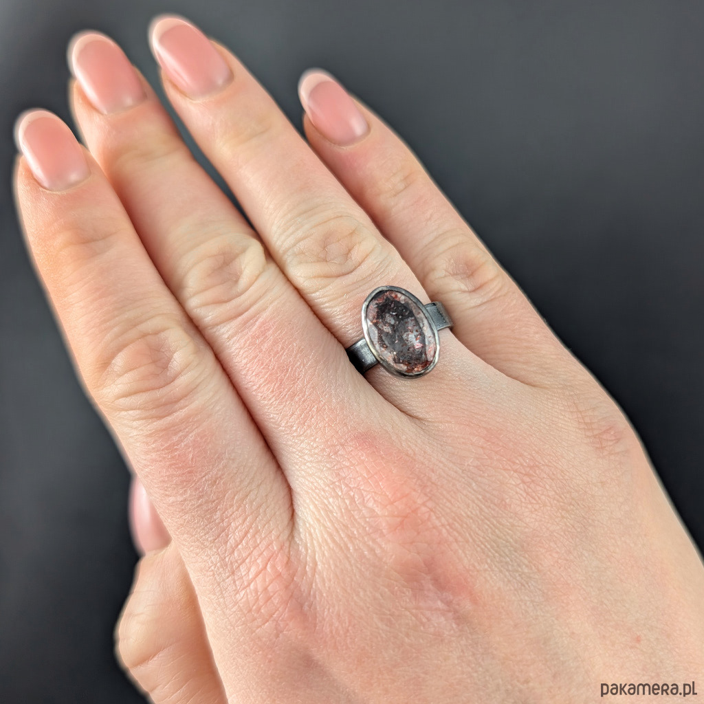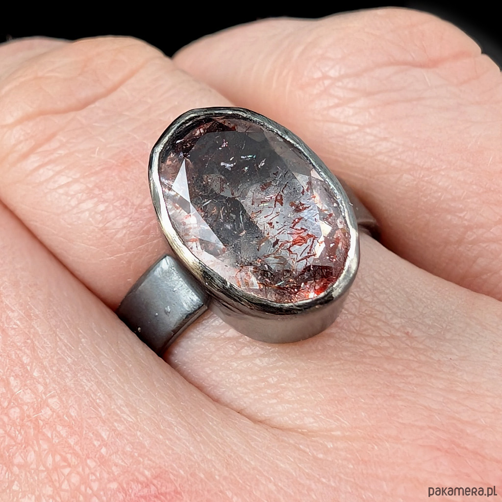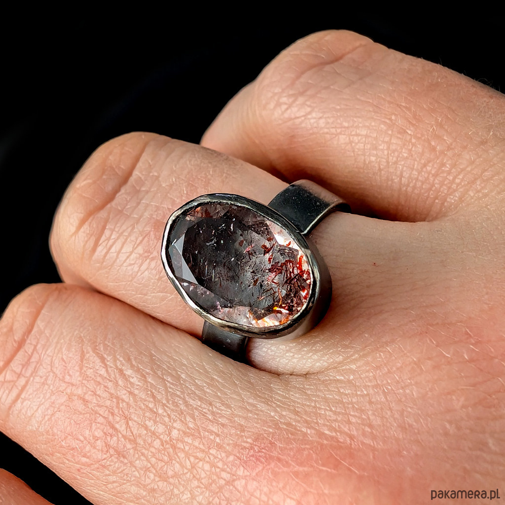 Oryginalny pierścień wykonany z oksydowanego srebra próby 925. Obrączkę o szerokosci 5 mm zdobi wyjątkowy okaz Super Seven- zjawiskowa kombinacja 7 minerałów zaklętych w pięknym szlifie na calej powierzchni (m.in.lepidokrocyt, kwarc dymny,ametyst, rutyl, kryształ górski) . Ma 5,05 Ct. Kamień ma oprawę 15 x 10 mm. Pierścionek w rozmiarze jubilerskim 16, mogę powiększyć do max 17, dopasuję po zakupie. waga 6,25 grama. Zostanie wysłany w ozdobne pudełeczko.
