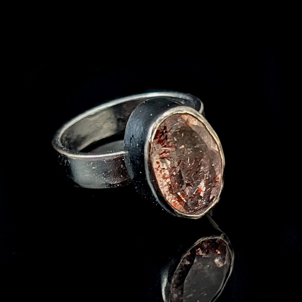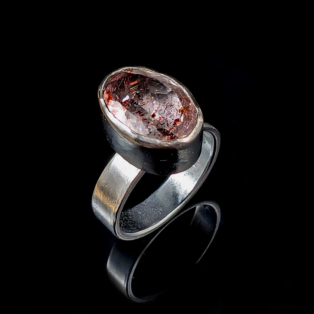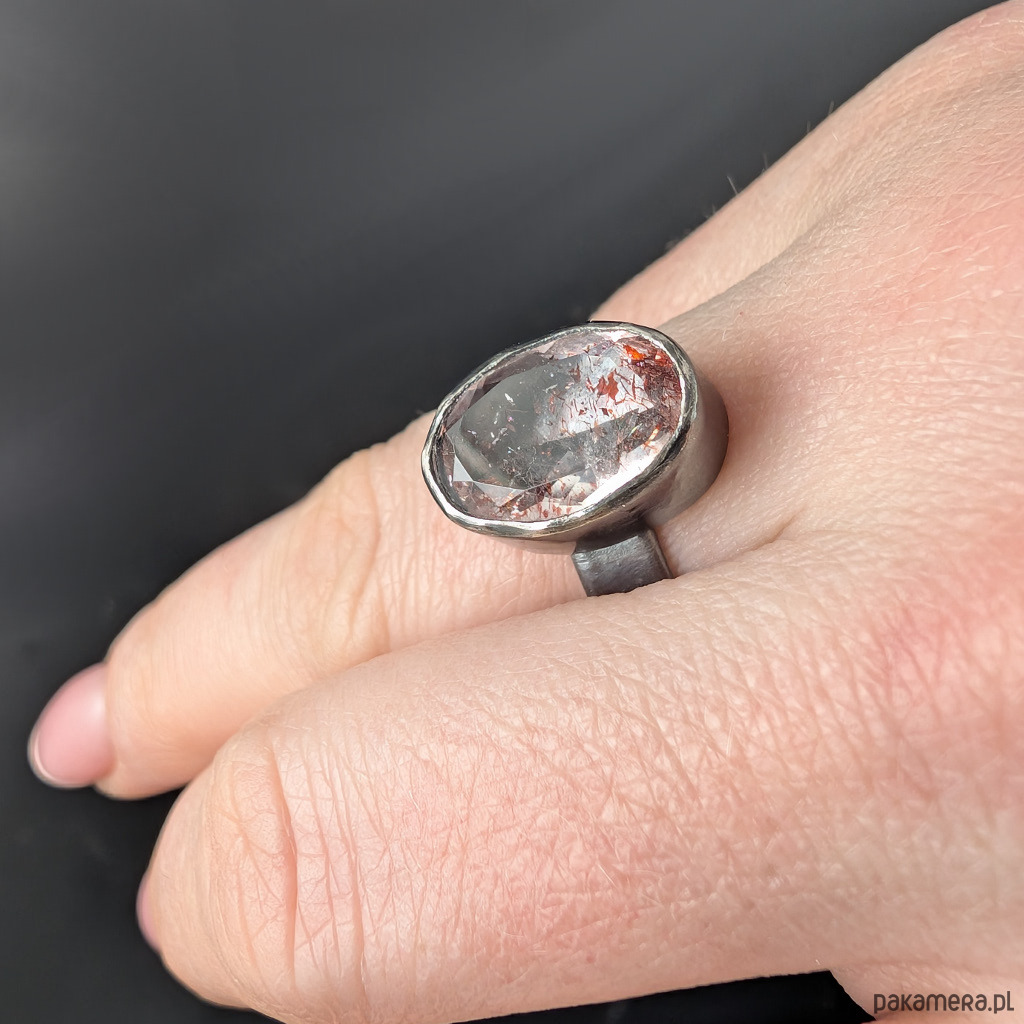 Oryginalny pierścień wykonany z oksydowanego srebra próby 925. Obrączkę o szerokosci 5 mm zdobi wyjątkowy okaz Super Seven- zjawiskowa kombinacja 7 minerałów zaklętych w pięknym szlifie na calej powierzchni (m.in.lepidokrocyt, kwarc dymny,ametyst, rutyl, kryształ górski) . Ma 5,05 Ct. Kamień ma oprawę 15 x 10 mm. Pierścionek w rozmiarze jubilerskim 16, mogę powiększyć do max 17, dopasuję po zakupie. waga 6,25 grama. Zostanie wysłany w ozdobne pudełeczko.
