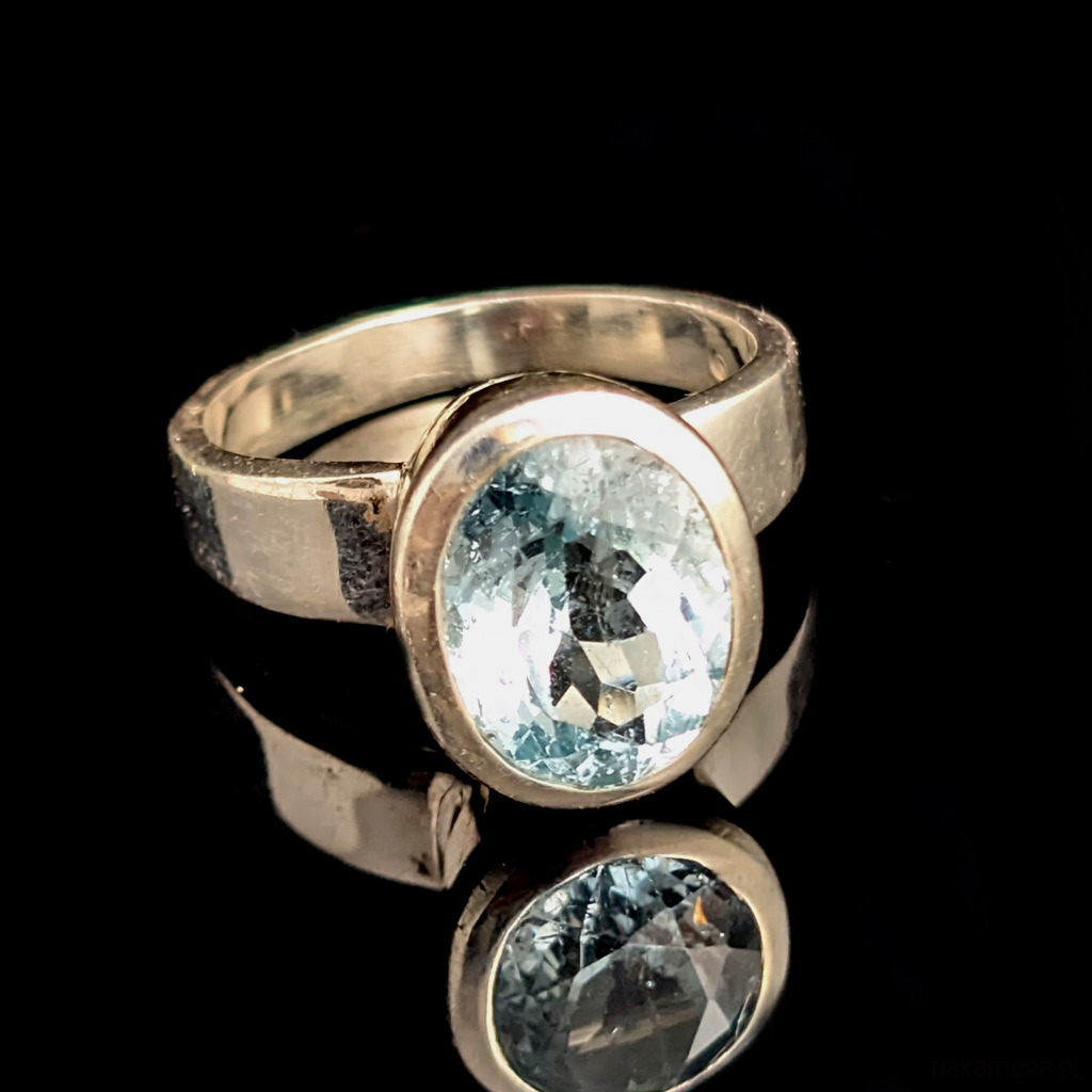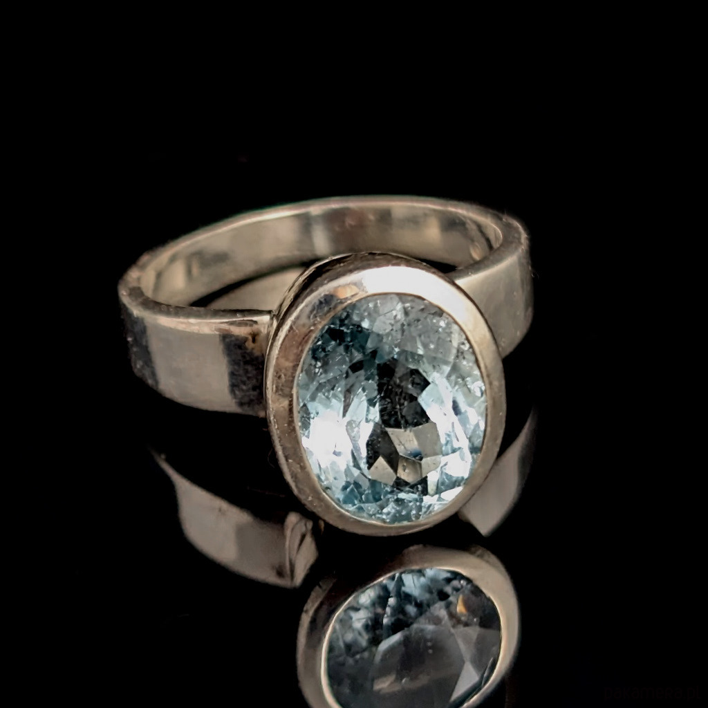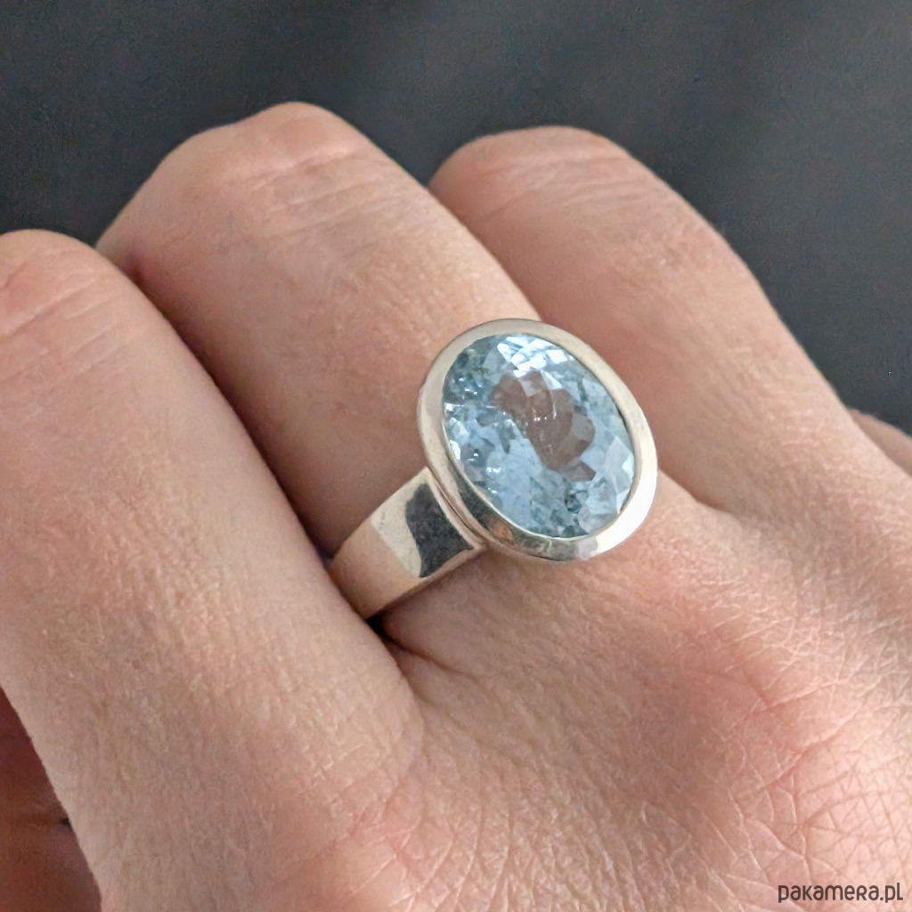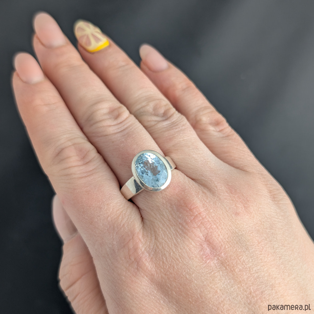 Pierścień z oprawionym w srebro próby 925 pięknym, dostojnym akwamarynem. Szerokość obrączki max 5 mm, min. 3 mm. Okazały, niezwykle przejrzysty kamień o precyzyjnym szlifie ma oprawę 14 x 12 mm. Rozmiar jubilerski 19, mogę powiększyć na max. 20. Polecam, jest przepiękny. Oprawa z tyłu otwarta co potęguje przejrzystość kamienia. Waga 8,6 grama. Wykonany przez dostawcę kamieni. Pierścień zapakowany zostanie w ozdobne pudełeczko.