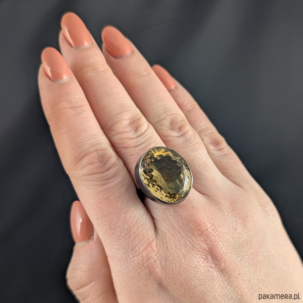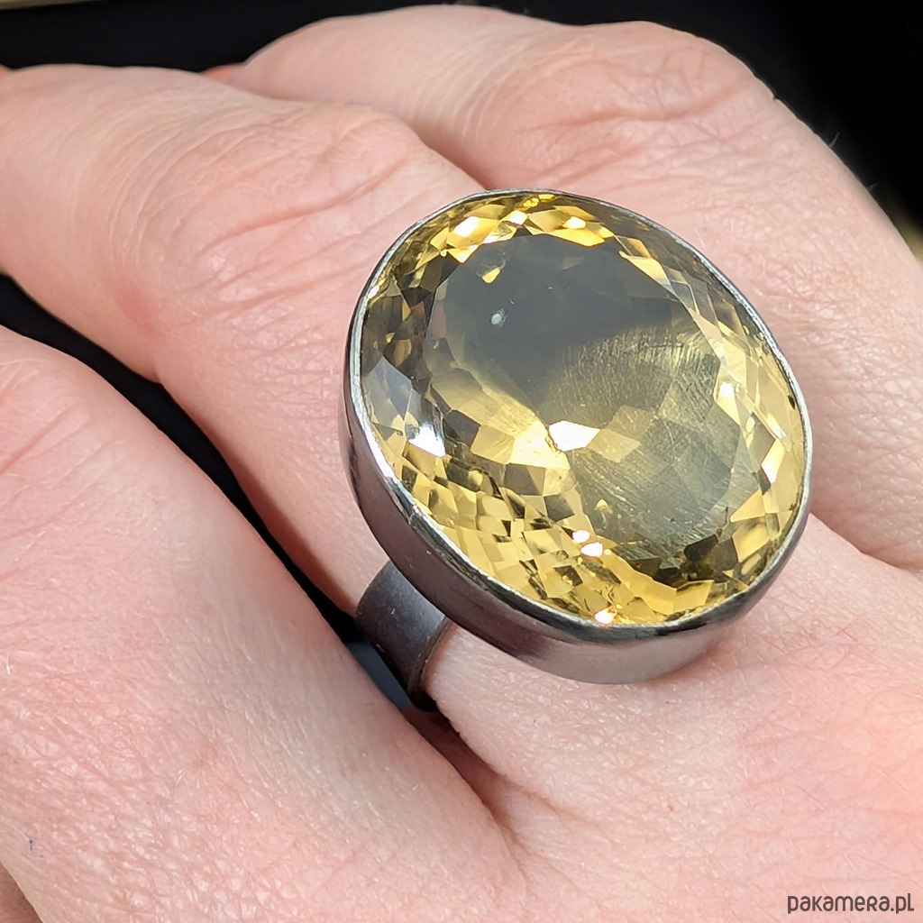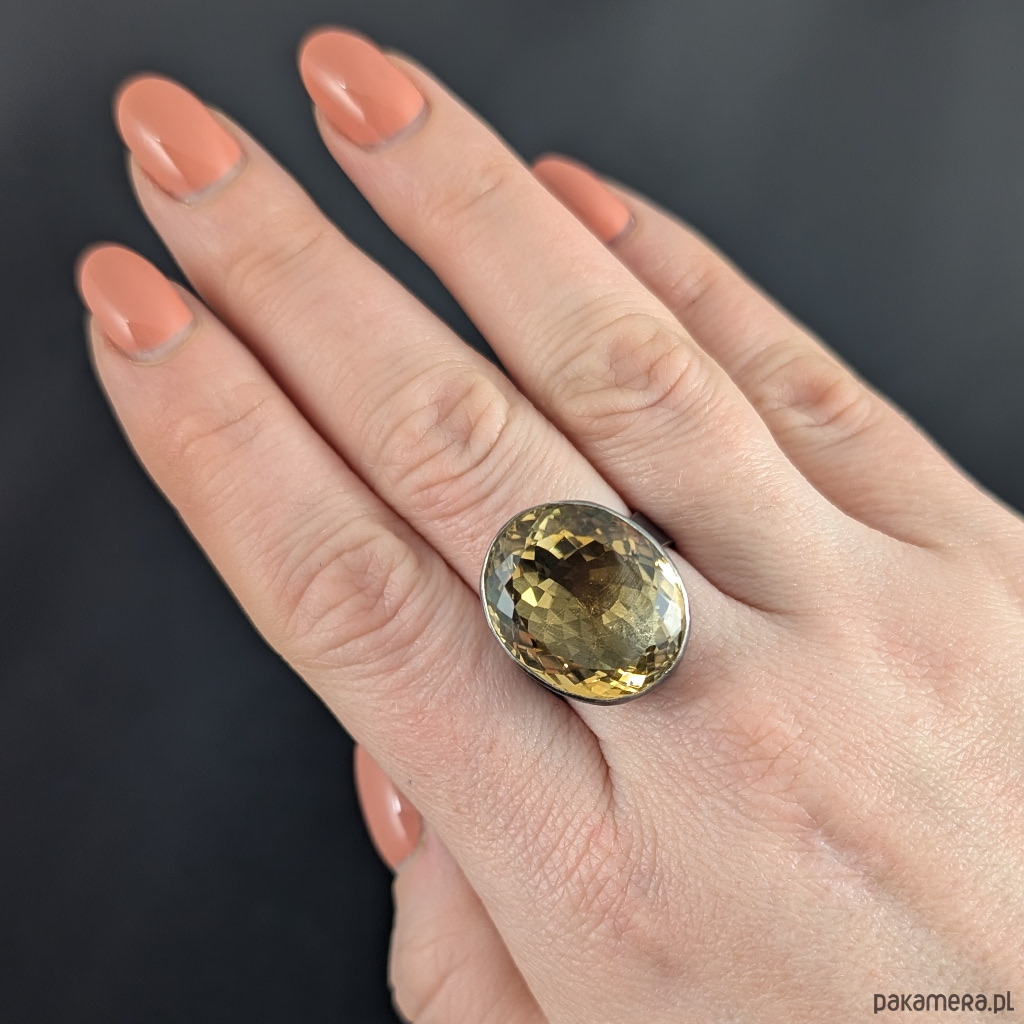 Kobiecy, okazały pierścień wykonany ze srebra pr. 925 oraz pięknego cytrynu z misternym szlifem. Srebro oksydowane. Wymiary oprawy 22 x 18 mm.Szerokość obrączki 5 mm. Rozmiar regulowany w szerokim zakresie, proszę napisać na jaki dopasować. Waga 12 gramów. Pierścionek zapakowany w ozdobne pudełeczko.