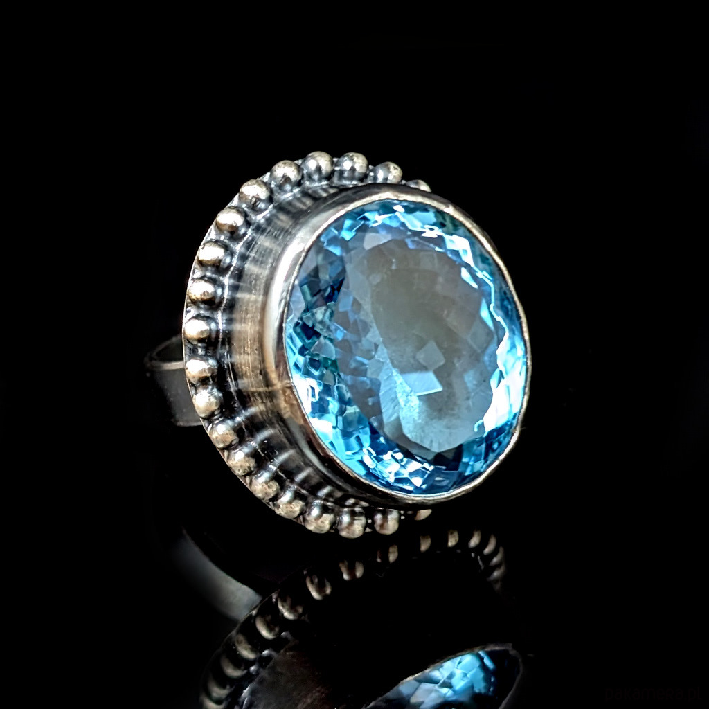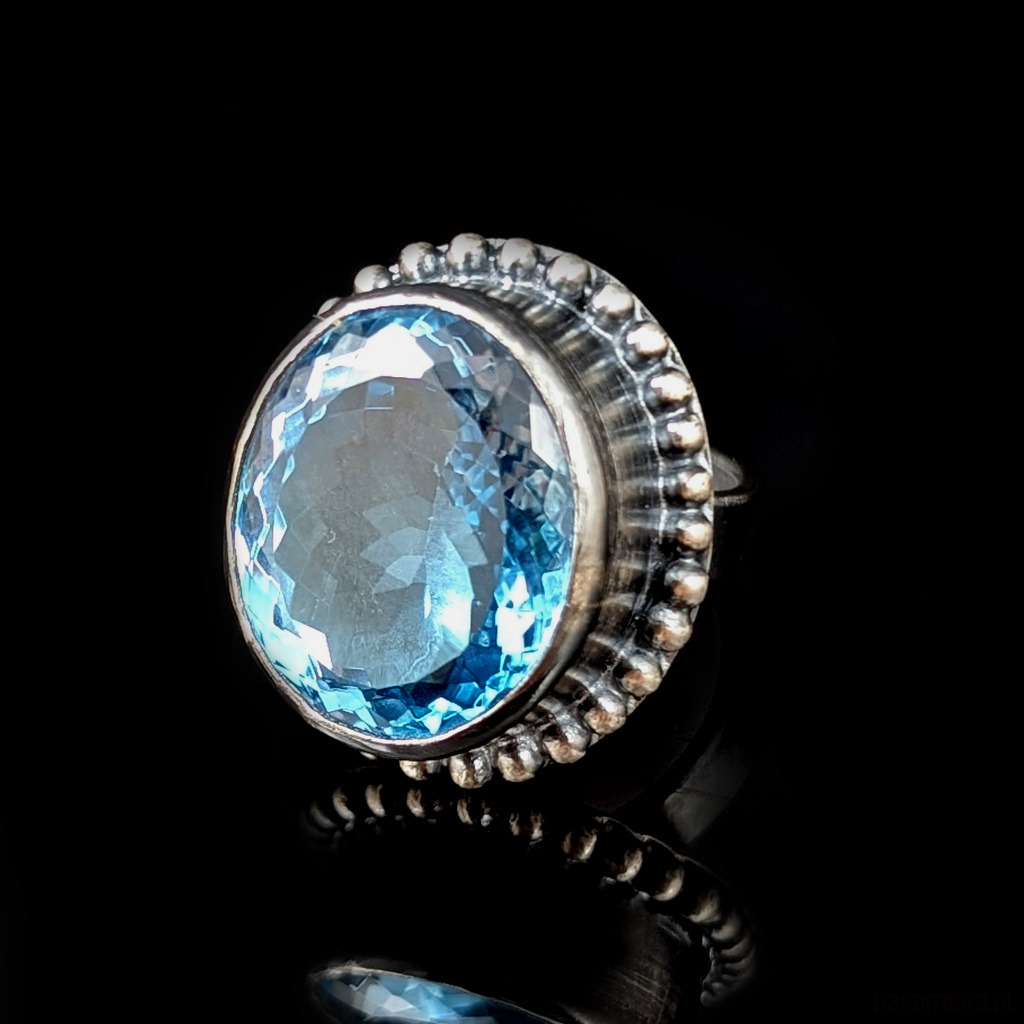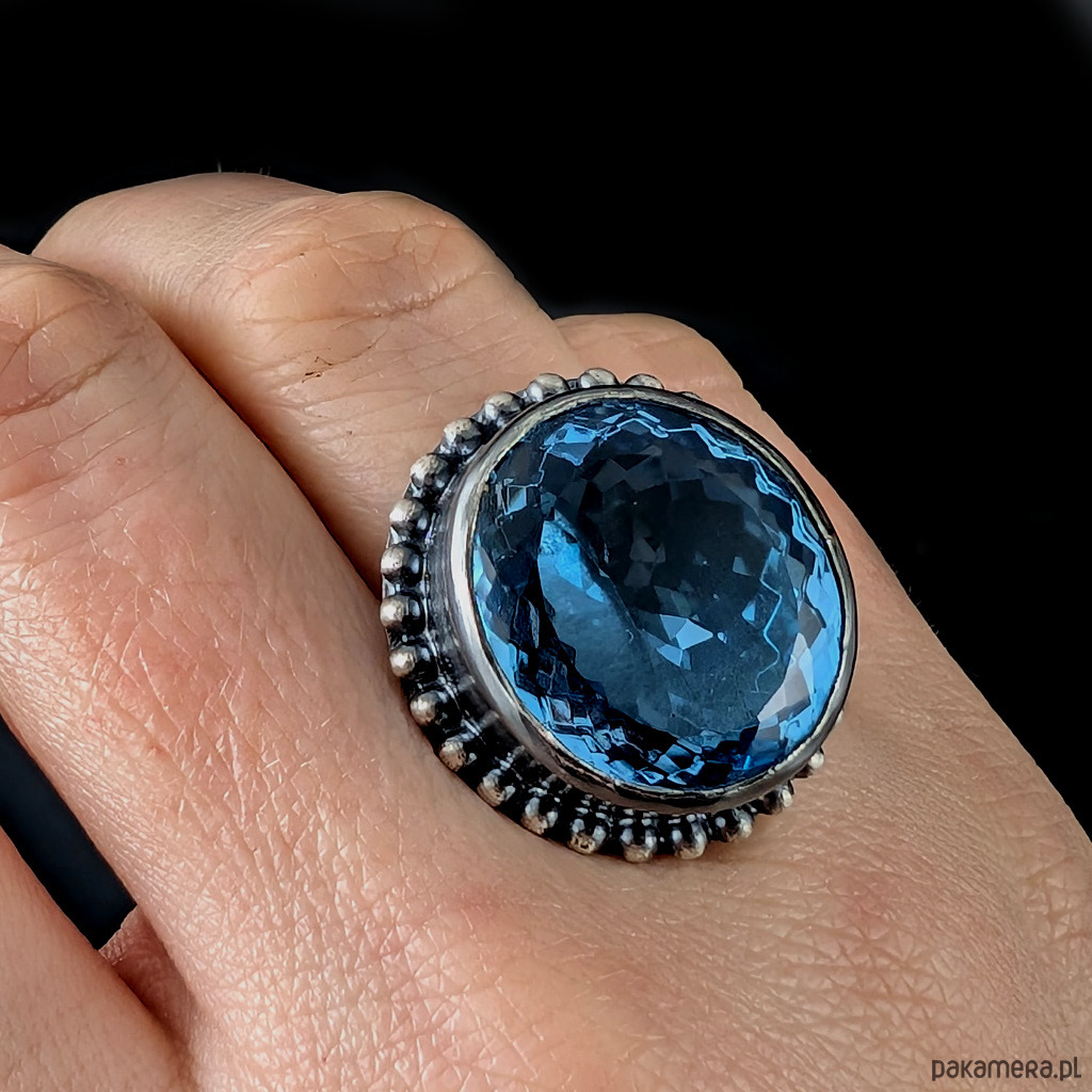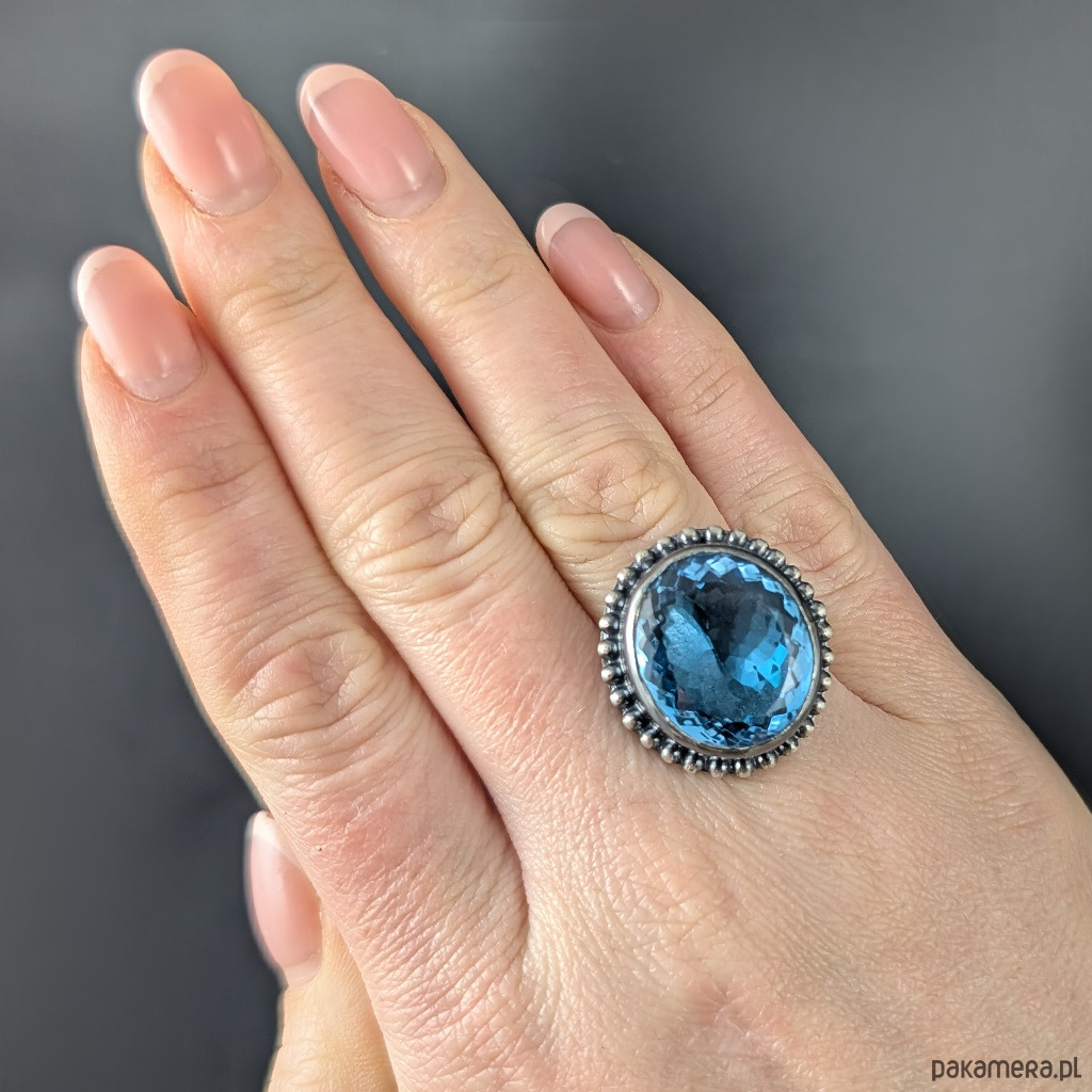 Barokowy, okazały pierścień wykonany z oksydowanego srebra pr.925 oraz zjawiskowego, fasetowanego topazu.