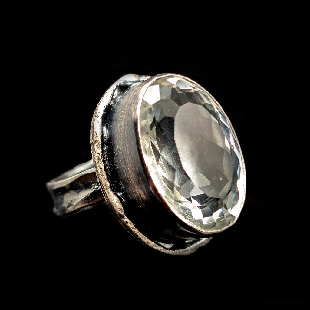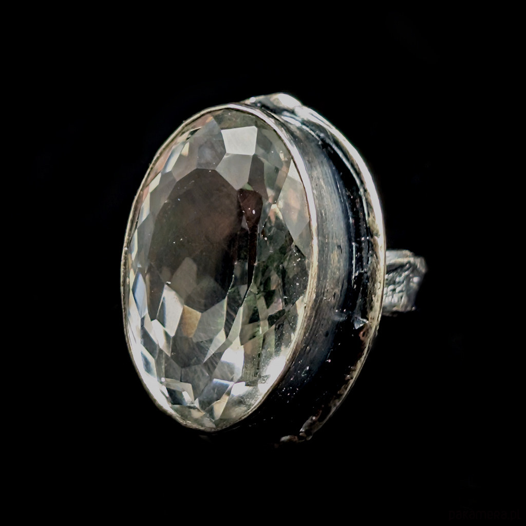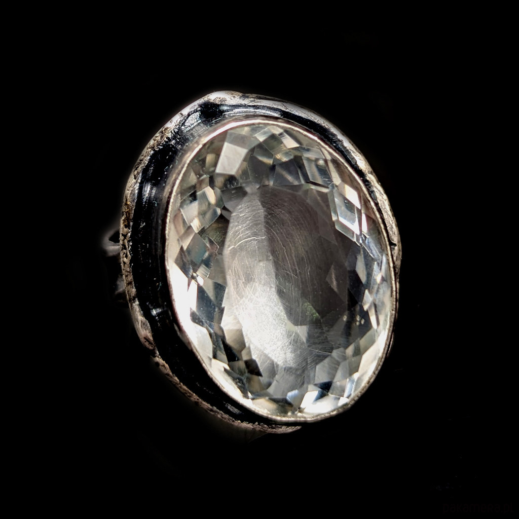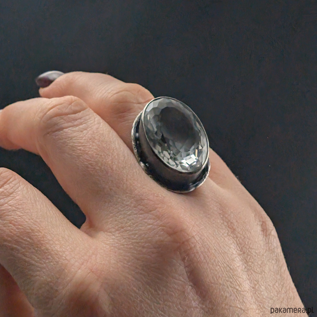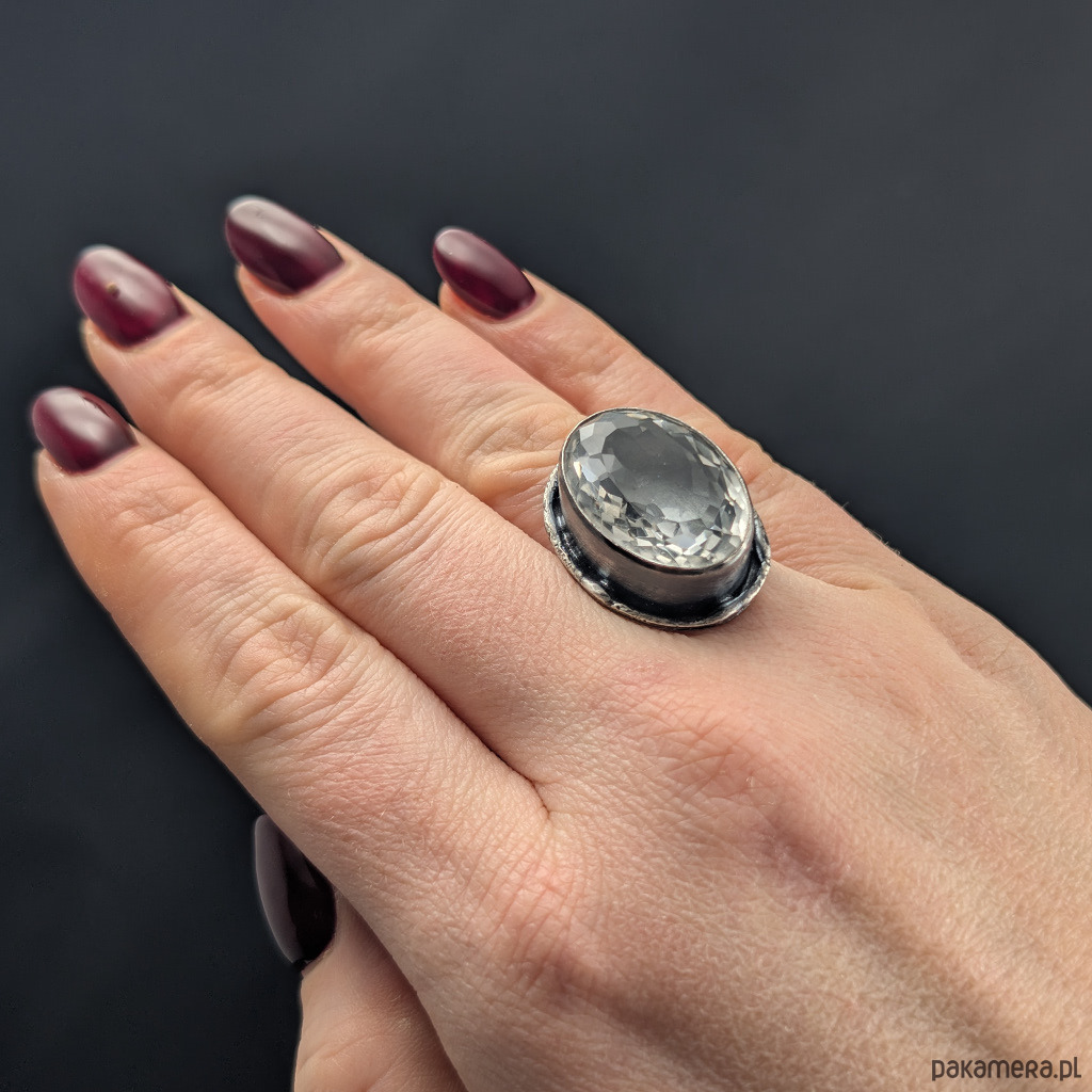 Kryształ kwarcu zwany też kryształem górskim o niezwykłej urodzie, ultra przejrzystosci o pięknym, precyzyjnym szlifie. Rozmiar jubilerski 15, mogę powiększyć na rozmiar max 16. Oprawa 26 x 21 mm, wysokość 12 mm. Waga 13 g. Oprawa wykonana z oksydowanego srebra pr 925. Pierścień zostanie zapakowany w ozdobne pudełeczko.