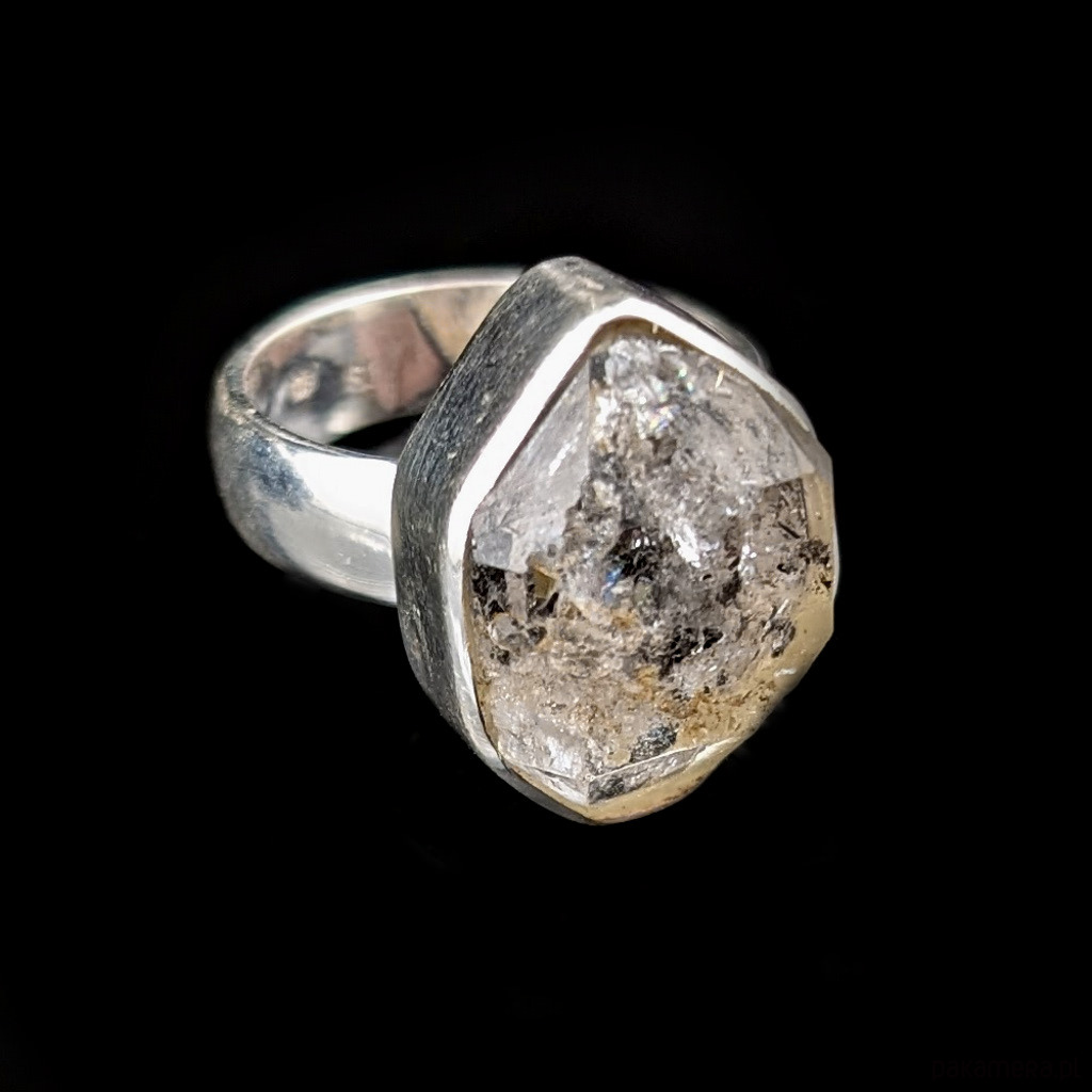Pierścień z oprawionym w srebro próby 925 najczystszym kryształem górskim potocznie zwanym herkimerem- niezwykle czysta odmiana nazywana też diamentem z Herkimer (od nazwy miejsca występowania, okręg Herkimer w stanie Nowy Jork). Wymiary oprawy kamienia 20 x 15 mm, rozmiar jubilerski regulowany w zakresie 13-20. Kobiecy, awangardowy. Obrączka ma 6 mm. Waga 9 g. Pierścionek wykonany przez dostawcę kamieni, zostanie zapakowany w eleganckie pudełeczko