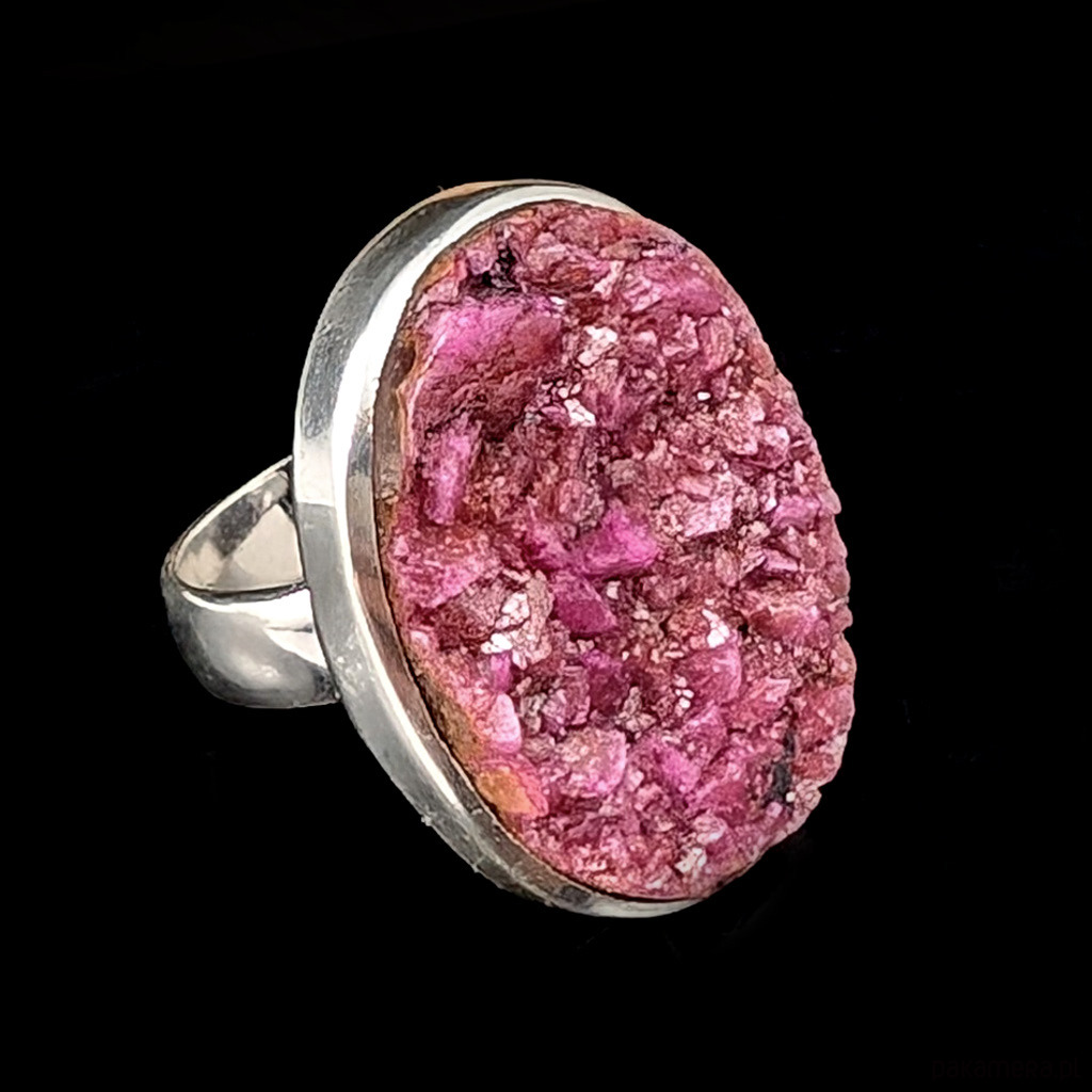 Pierścień z oprawionym w srebro próby 925 pięknym intensywnie różowym kobaltokalcytem o pięknie wykształconych kryształach. Szerokość obrączki 5 mm. Kamień ma oprawę 30 x 21 mm. Rozmiar jubilerski regulowany w wąskim zakresie,15-20 proszę napisać na jaki ustawić. Waga 11,84grama. Wykonany przez dostawcę kamieni. Pierścień zapakowany zostanie w ozdobne pudełeczko.