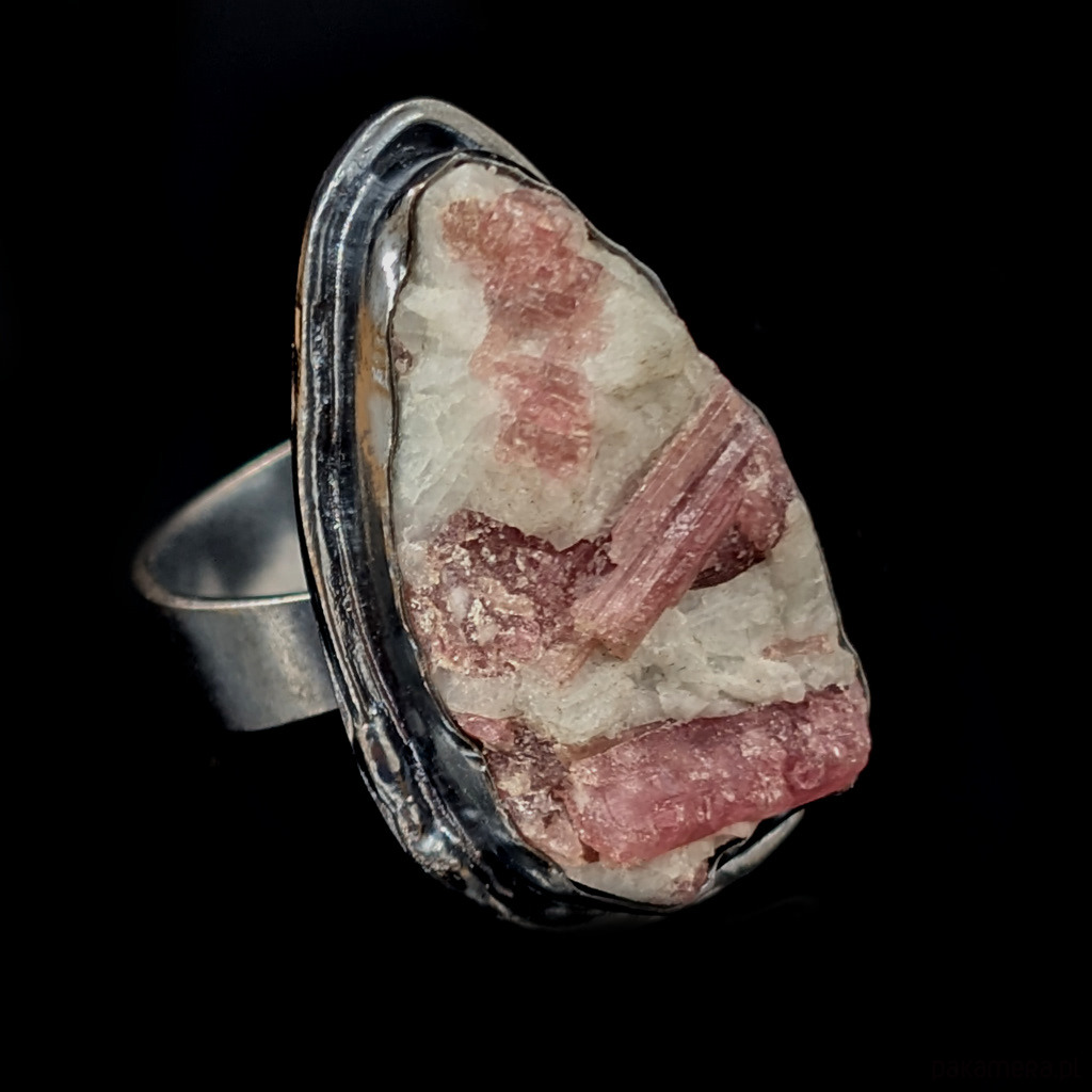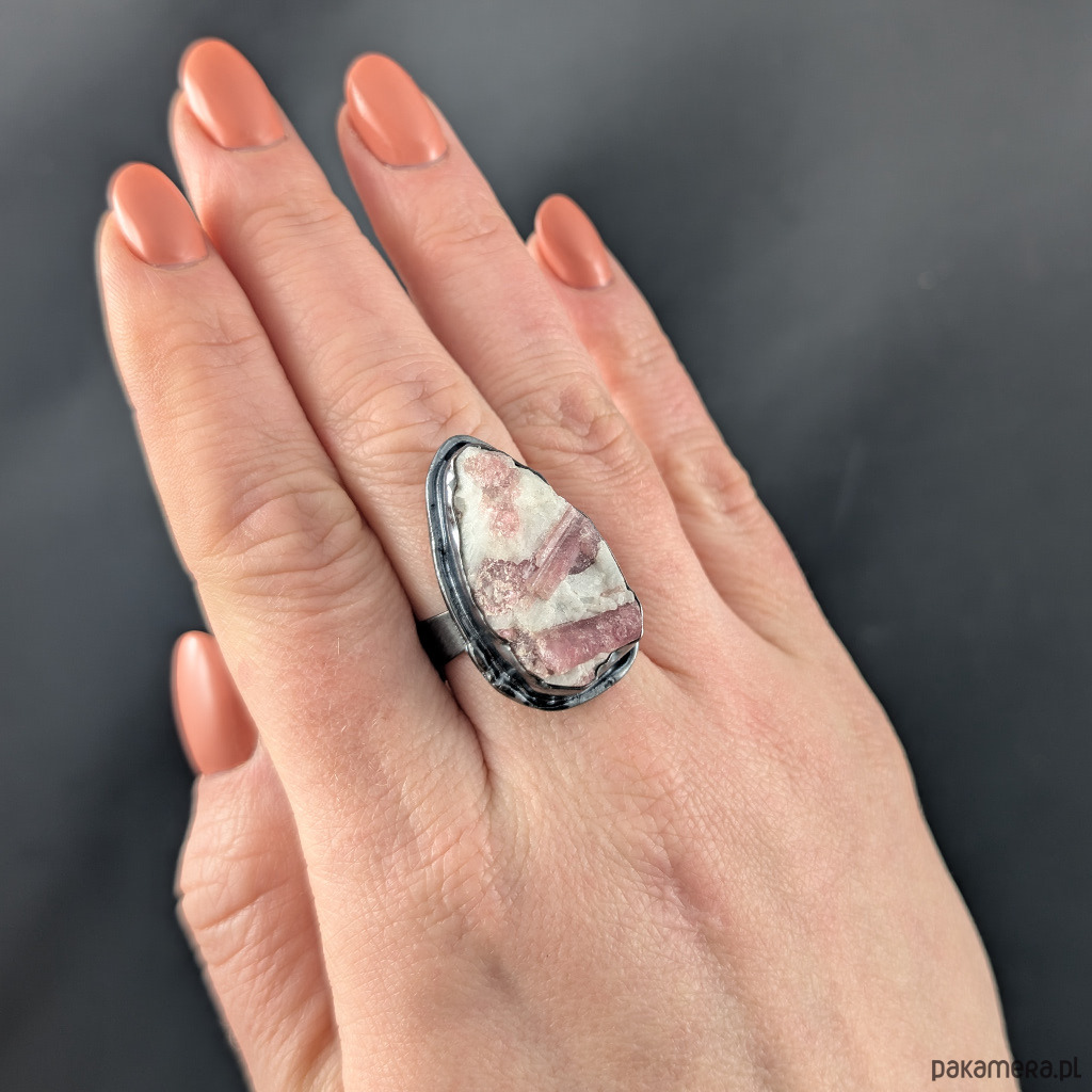 Okazały pierścień z oprawionym w oksydowane srebro próby 925 bardzo ciekawym , surowym turmalinem połyskującym krzyształkami. Oprawa 32 x 19 mm, Rozmiar jubilerski regulowany w szerokim zakresie, proszę napisać na jaki dopasować. Obrączka ma szerokość 6 mm. Waga 14 g. Pierścień zostanie wysłany w ozdobnym pudełeczku.