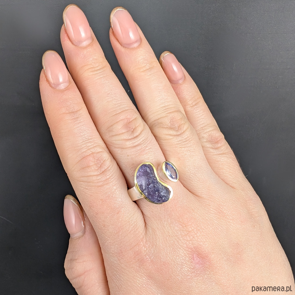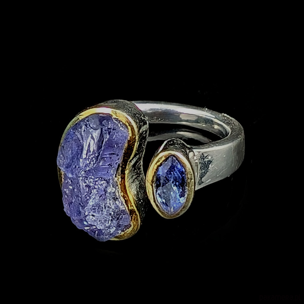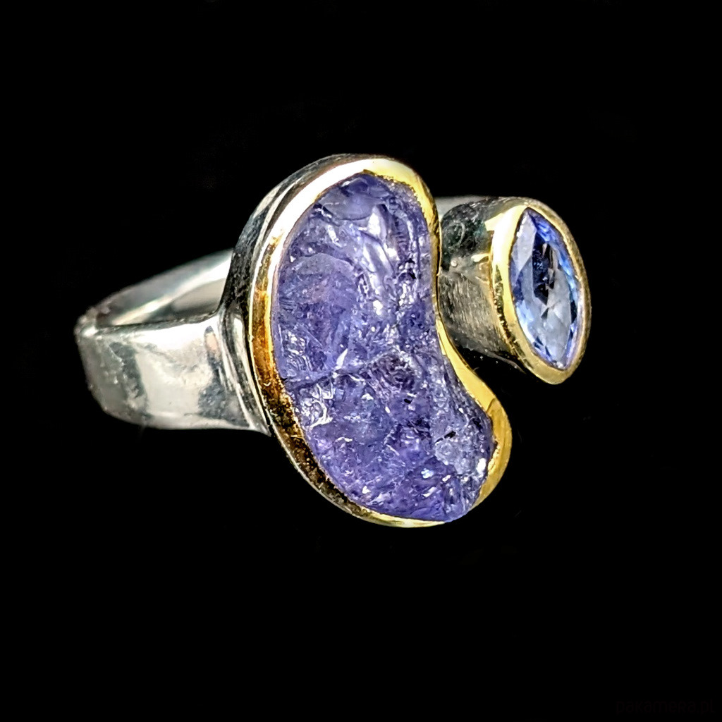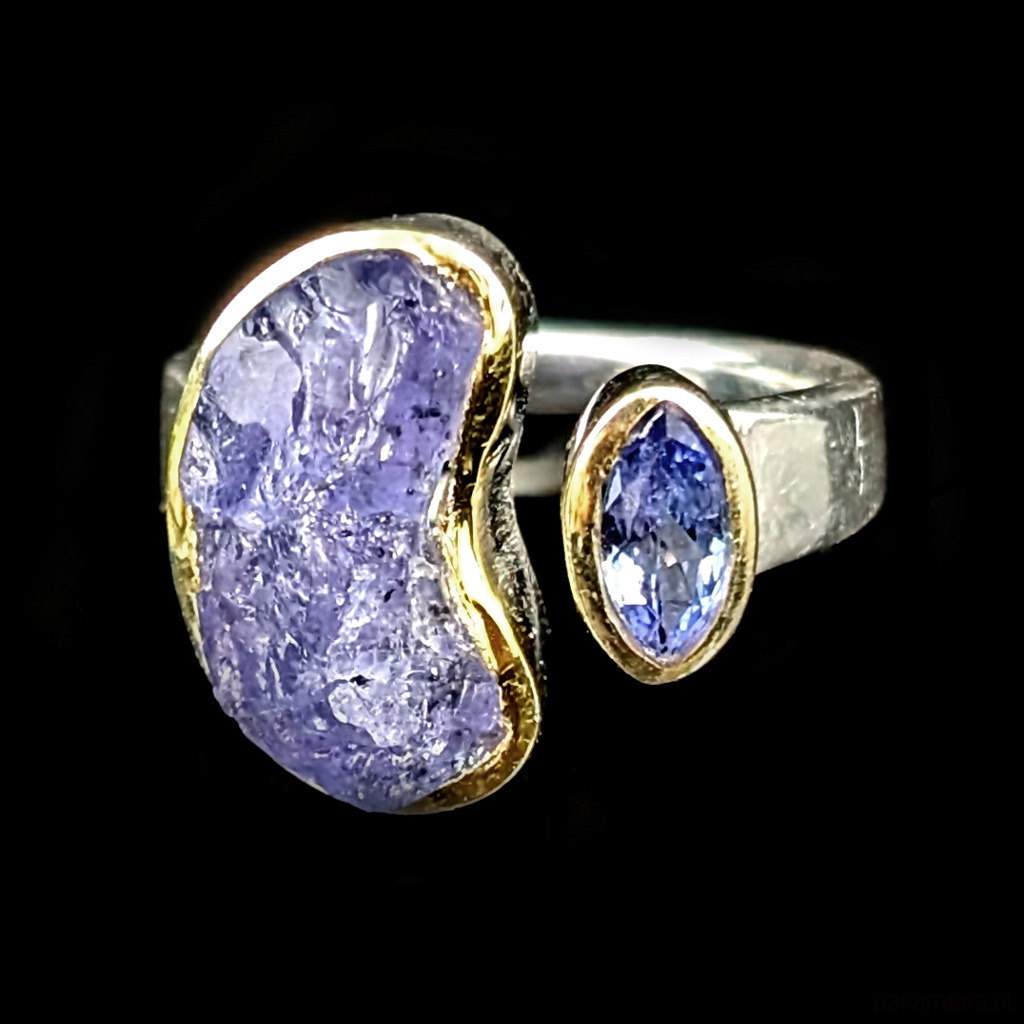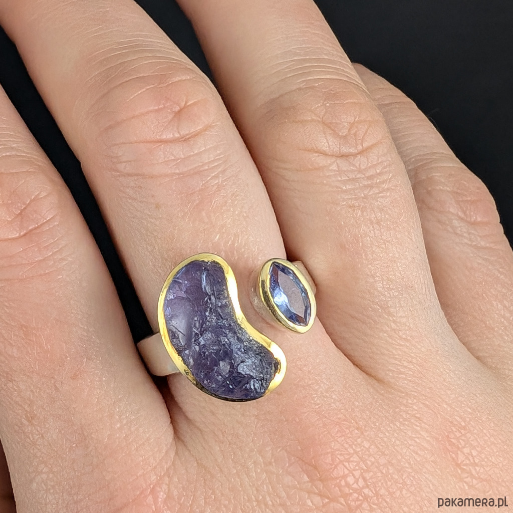 Pierścień z oprawionymi w srebro próby 925 pięknym tanzanitami. Szerokość obrączki max 6 mm, min. 3 mm. Większy kmień ma oprawę 18 x 10 mm. Towarzyszy mu piękny tanzanit fasetowany w kształcie markizy. Srebro w oprawie kamieni złocone, są to delikatne powłoki, które z czasem mogą się ścierać. Rozmiar jubilerski regulowany w wąskim zakresie, 18-21 proszę napisać na jaki ustawić. Waga 9.9 grama. Wykonany przez dostawcę kamieni. Pierścień zapakowany zostanie w ozdobne pudełeczko.