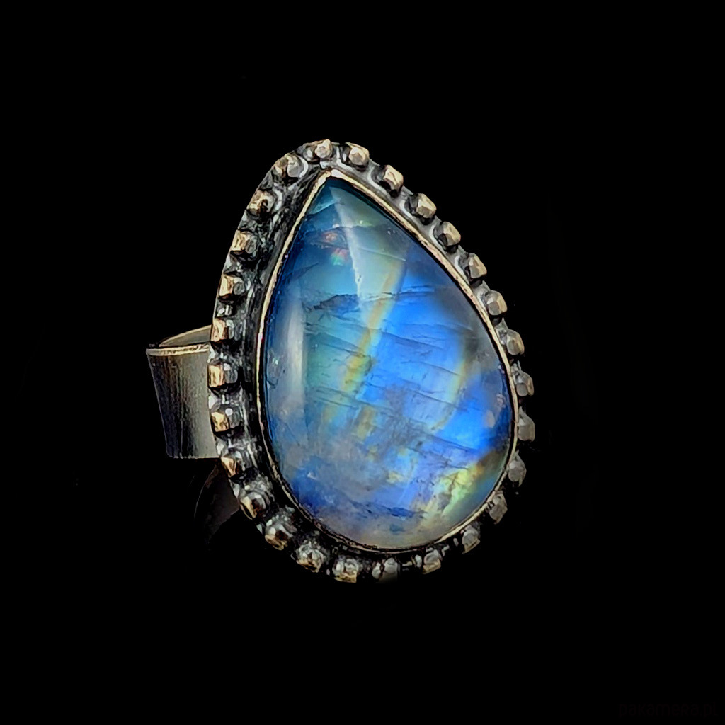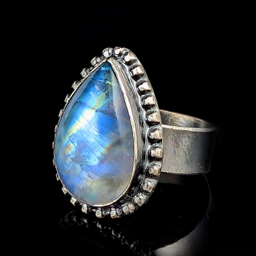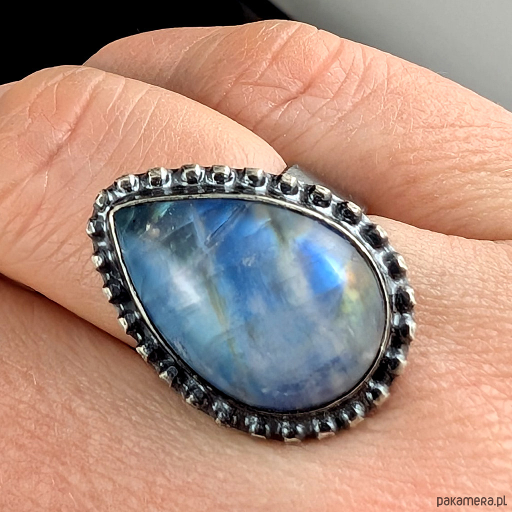 Pierścień wykonany ze srebra próby 925, oksydowane. Rozmiar jubilerski pierścionka 15, mogę powiększyć na max 17. Ozdobą pierścionka jest kamień księżycowy o pięknej błękitnej adularyzacji ze złocistym refleksem. Wymiary oprawy kamienia 24 x 17 mm,szerokość obrączki 5 mm. Waga 10,5 grama. Pierścień zostanie zapakowany w ozdobne pudełeczko.