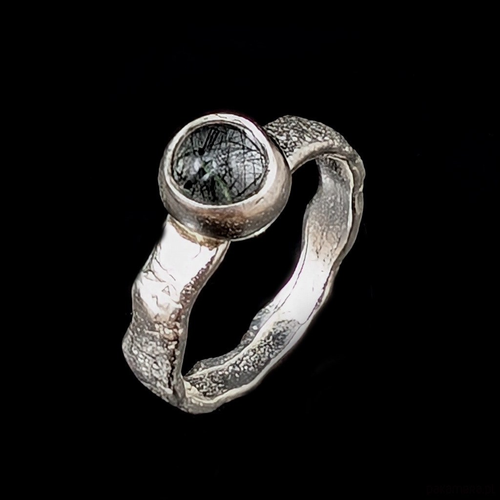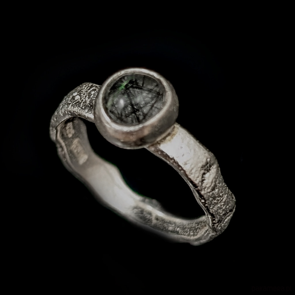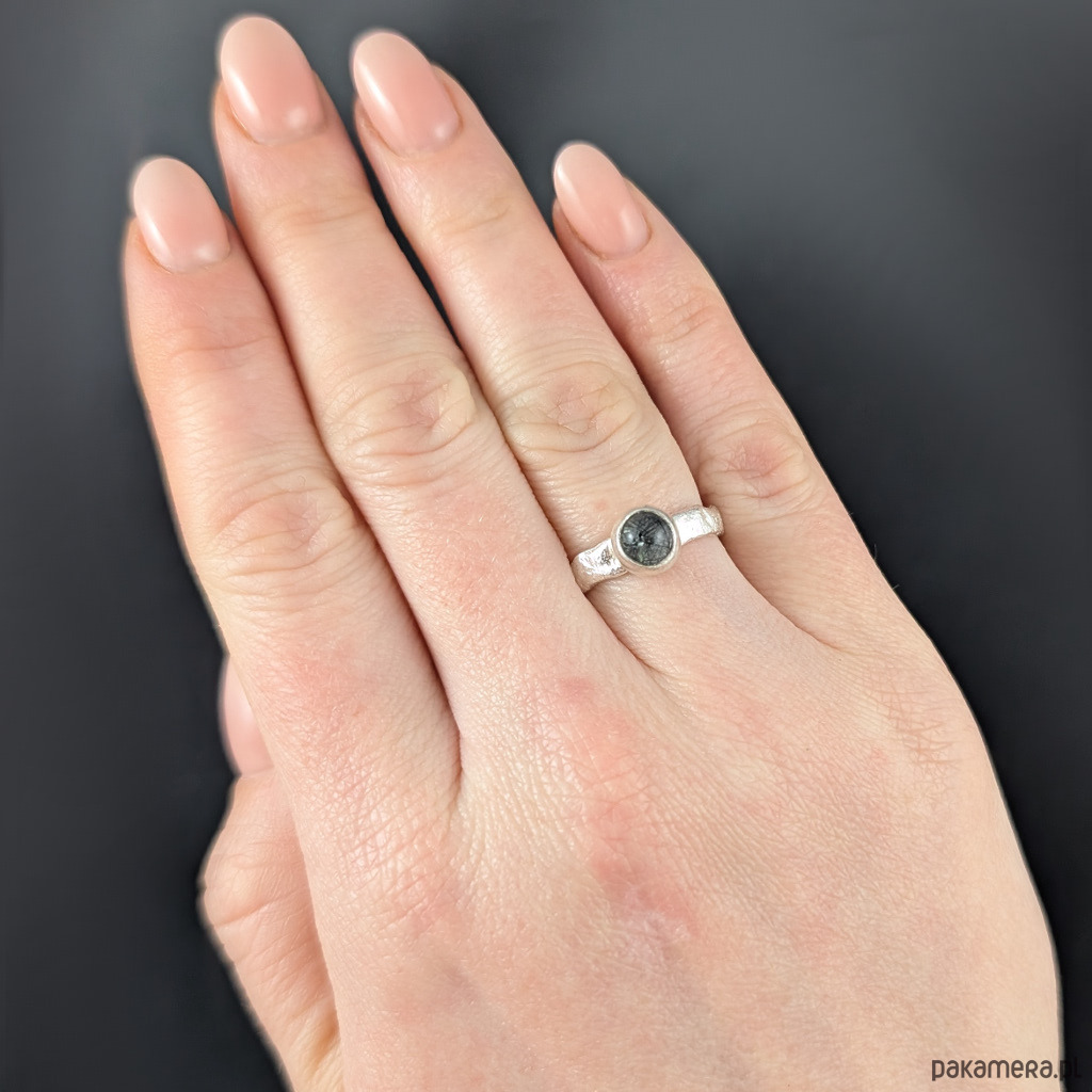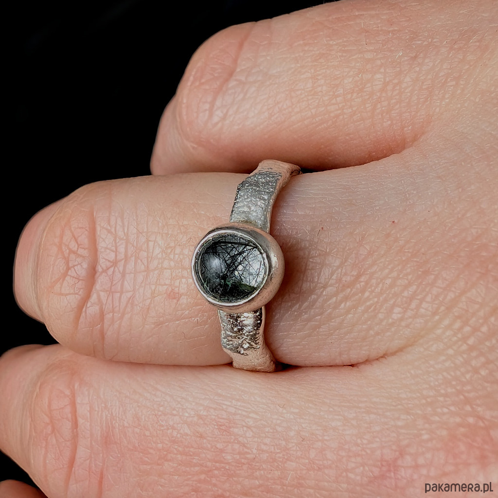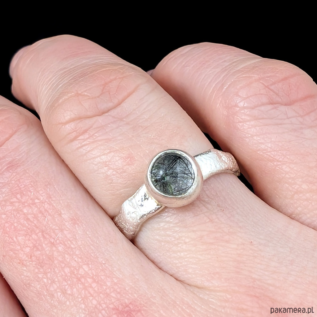 Pierścionek wykonany ze srebra próby 925, Rozmiar pierścionka 14 mogę powiększyc na max 15. Proszę napisać, na jaki ustawić. Ozdobą pierścionka jest piękny przezroczysty kwarc z inkluzjami czarnego turmalinu. Wymiary oprawy kamienia 7 mm, szerokość obrączki 5 mm. Waga 3,3 g. Pierścień zostanie zapakowany w ozdobne pudełeczko.