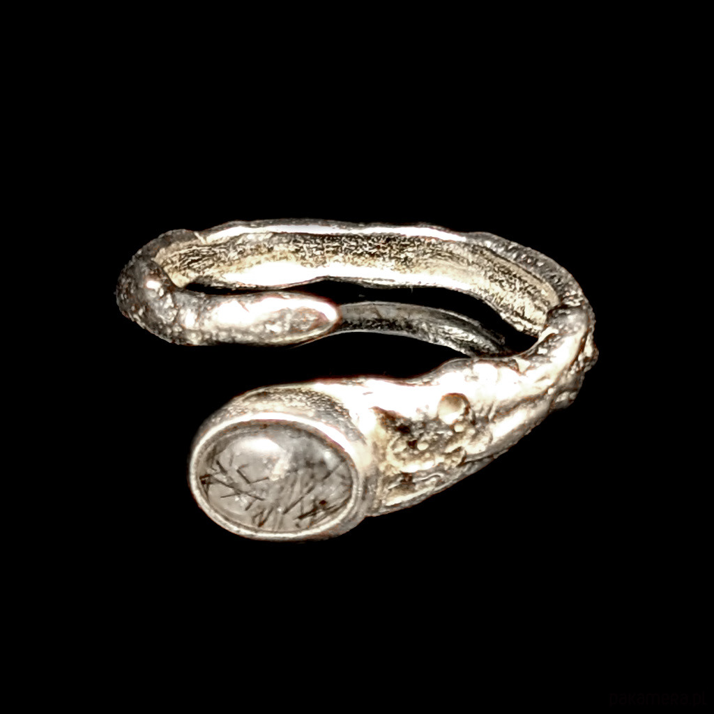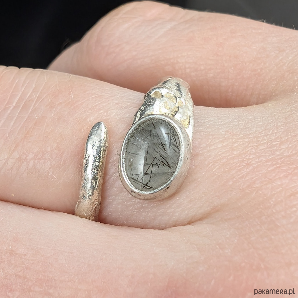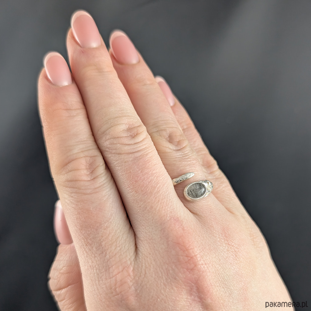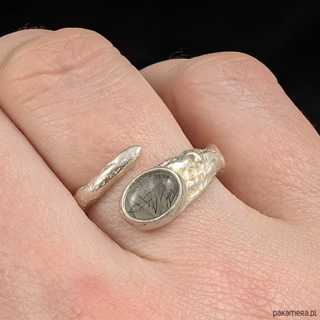 Elegancki i ciekawy pierścionek wykonany ze srebra próby 925 oraz kwarcu z inkluzjami czarnego turmalinu. Kamień 9 x 7 mm.Waga 4 g. Dziewczęcy, subtelny. Rozmiar jubilerski jest regulowany, proszę napisać na jaki dopasować obrączkę. Pierścionek zostanie zapakowany w ozdobne pudełeczko idelane na prezent